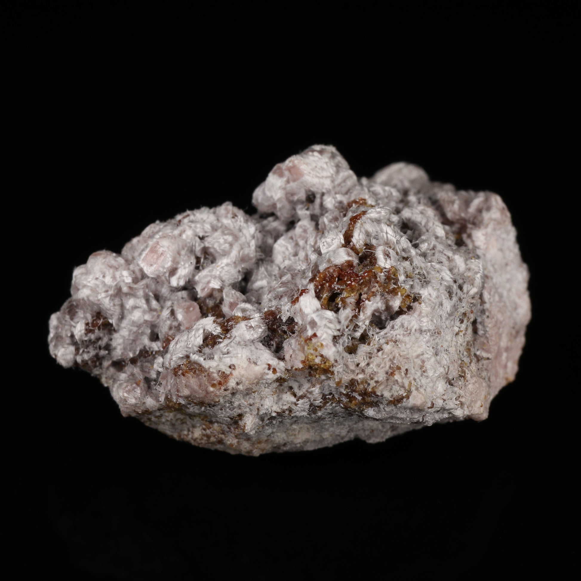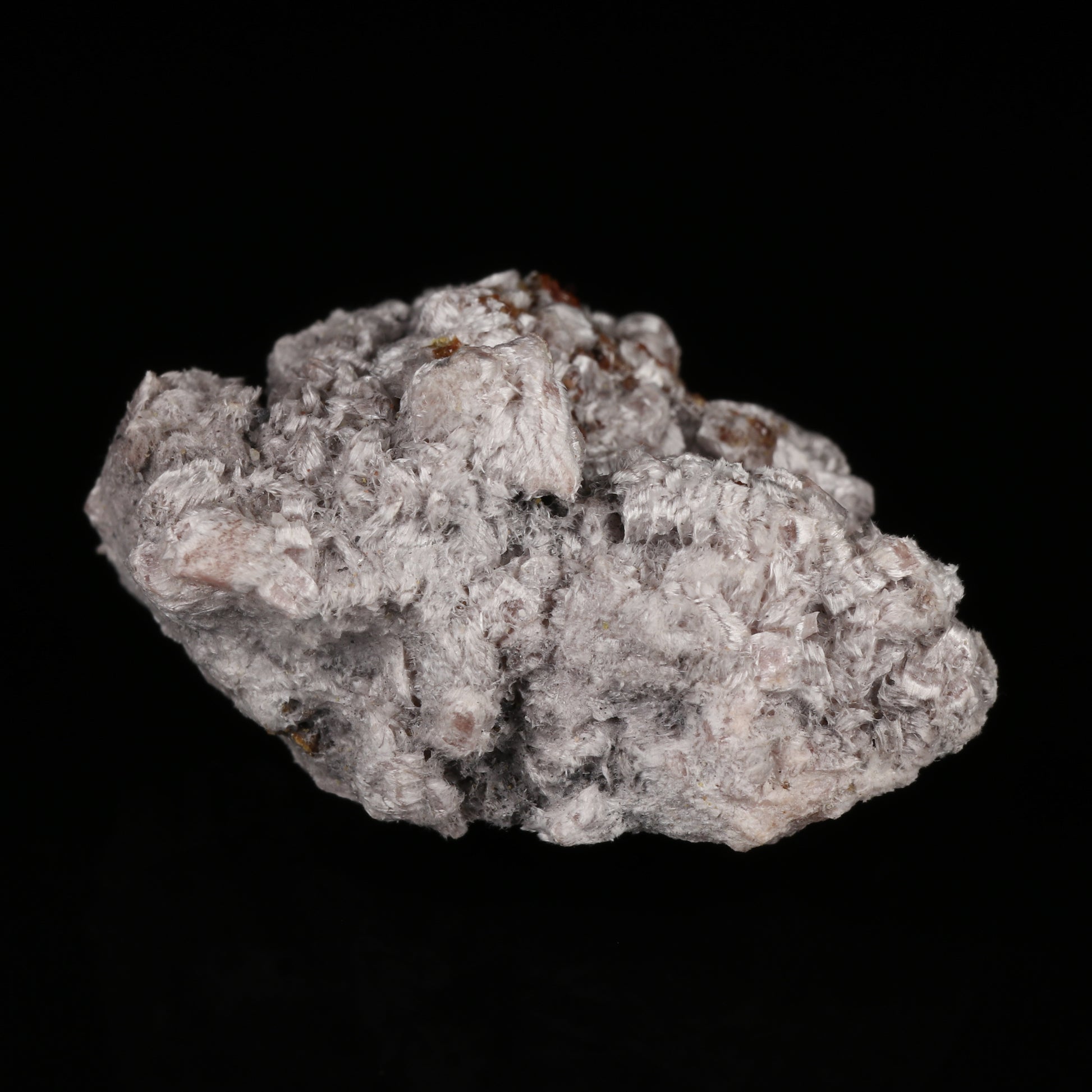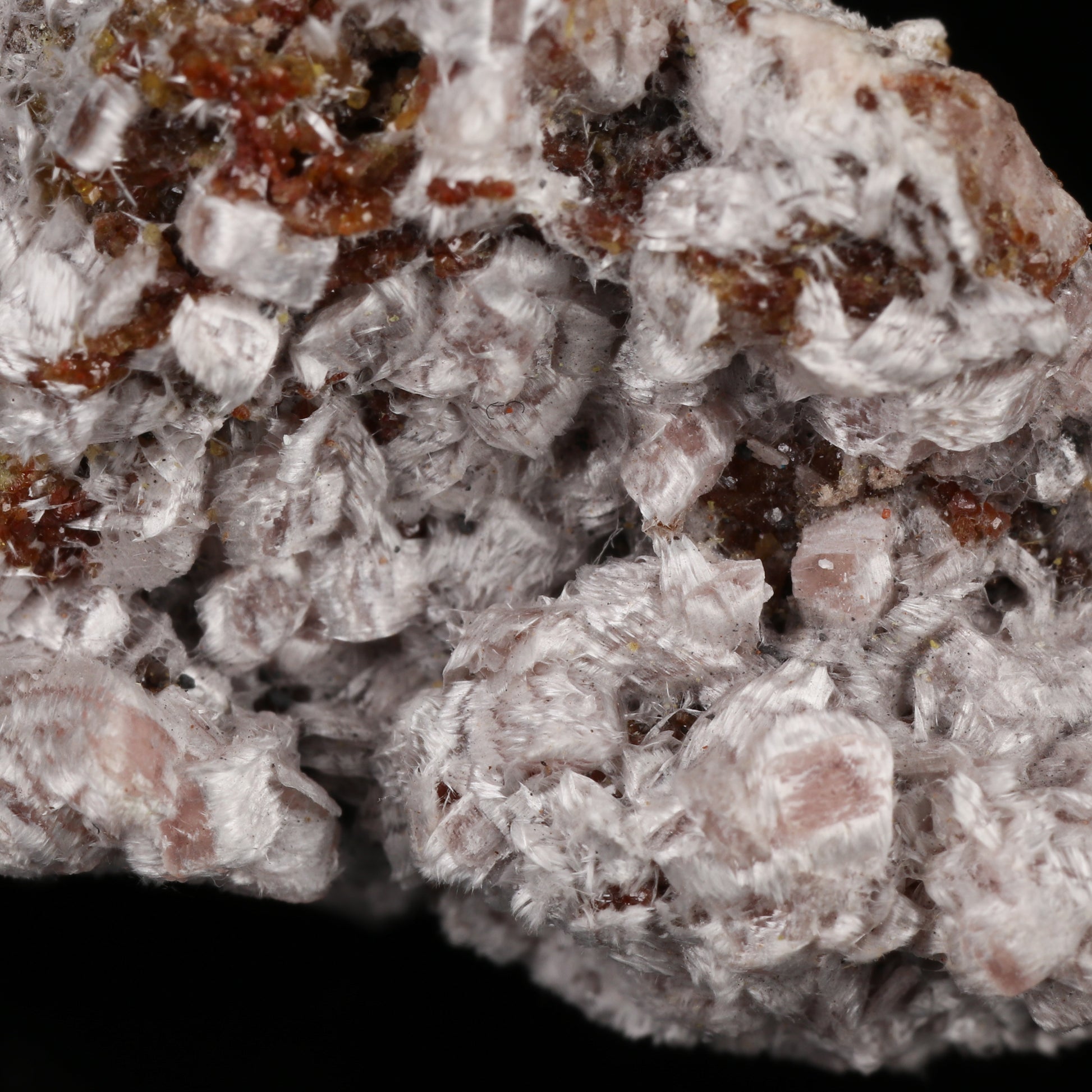The specimen has aligned epitaxial fibrous crystals of akermanite-gehlenite on manganoan calcite. This would be a rare set of minerals for the locality. These minerals have formed over a thin deposit of light red andradite made of a layer of small crystals on and inside of the matrix. The gehlenite is made up of tiny fibrous crystals something like grass seeds. The xrd analysis can be emailed.