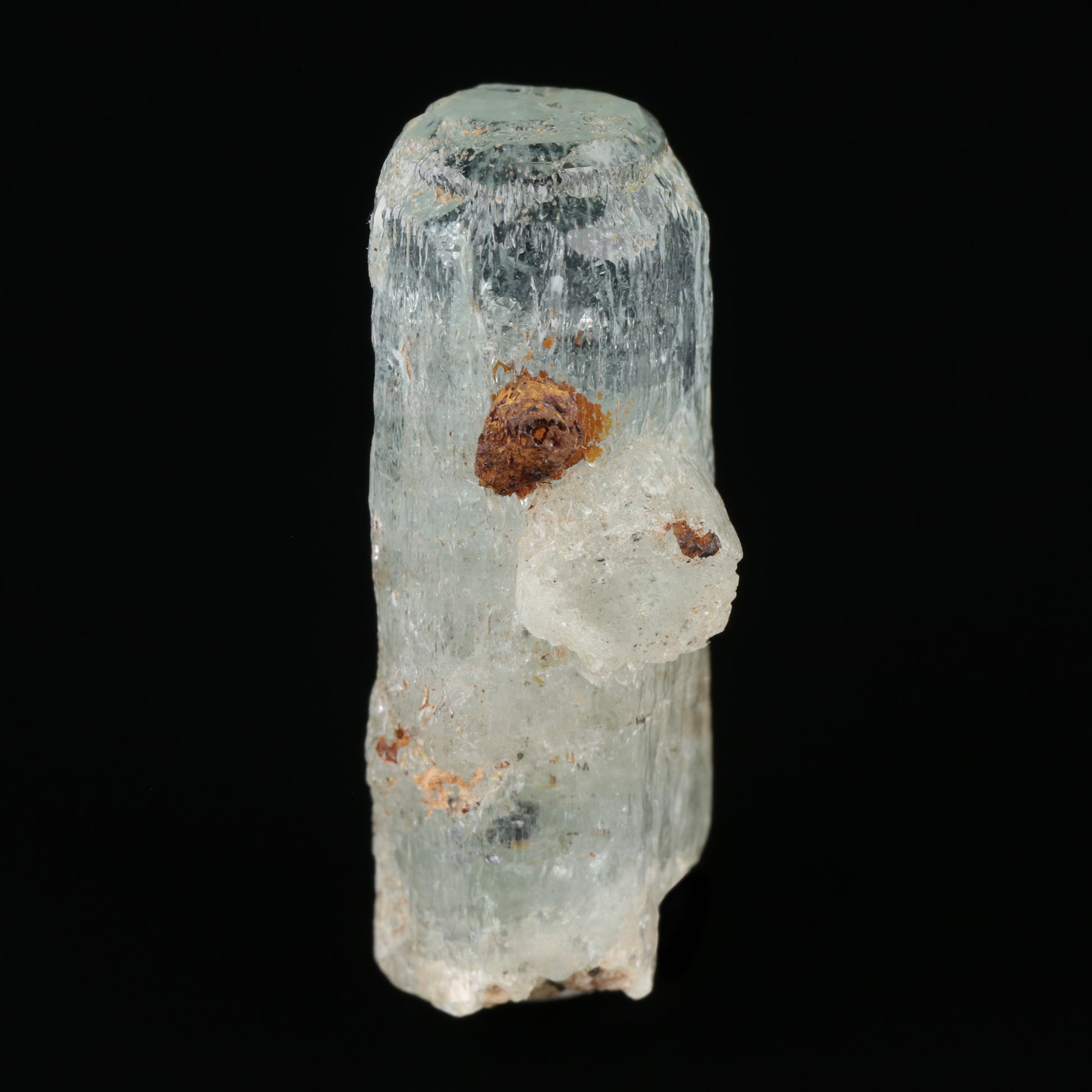 The specimen is a doubly terminated crystal of beryl var. aquamarine. The crystal has a second small stubby aquamarine crystal penetrating. The crystal is a floater too.