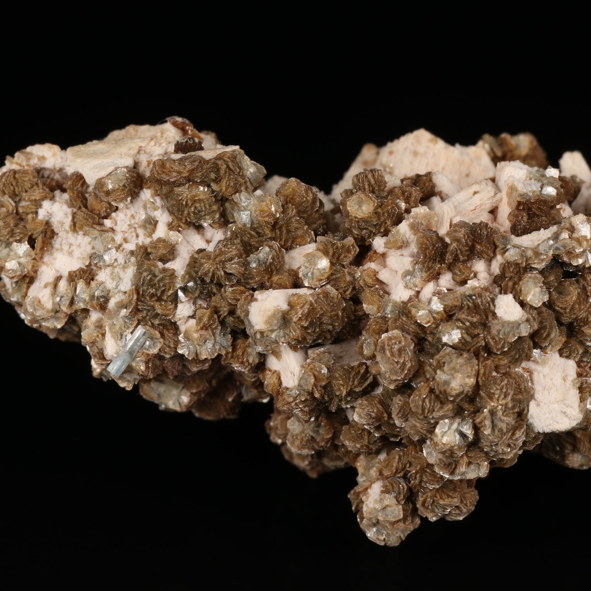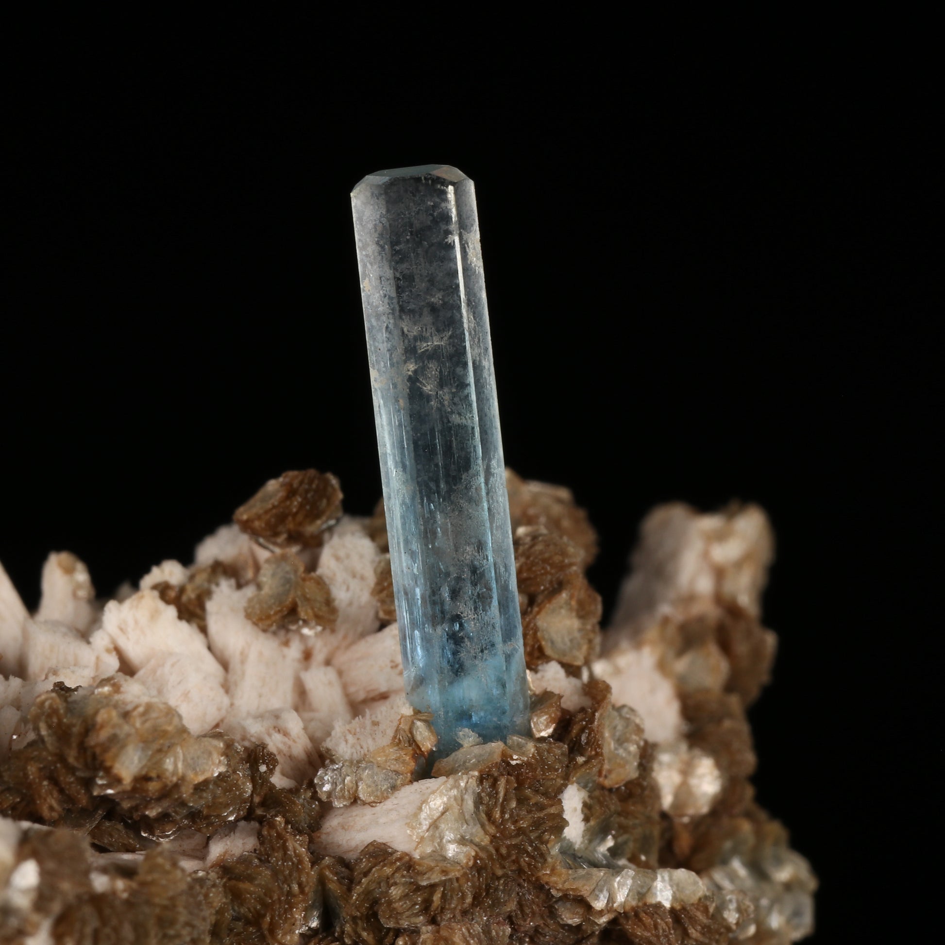 The specimen is made up of intergrown feldspar crystals of small size which have formed an elongated cluster. The cluster of feldspar is host to a deposit of brown-green coloured muscovite crystals. Then just off to one side there is a single aquamarine crystal coming off the matrix. The aquamarine measures 1.5cm and of a light blue colour with good clarity.