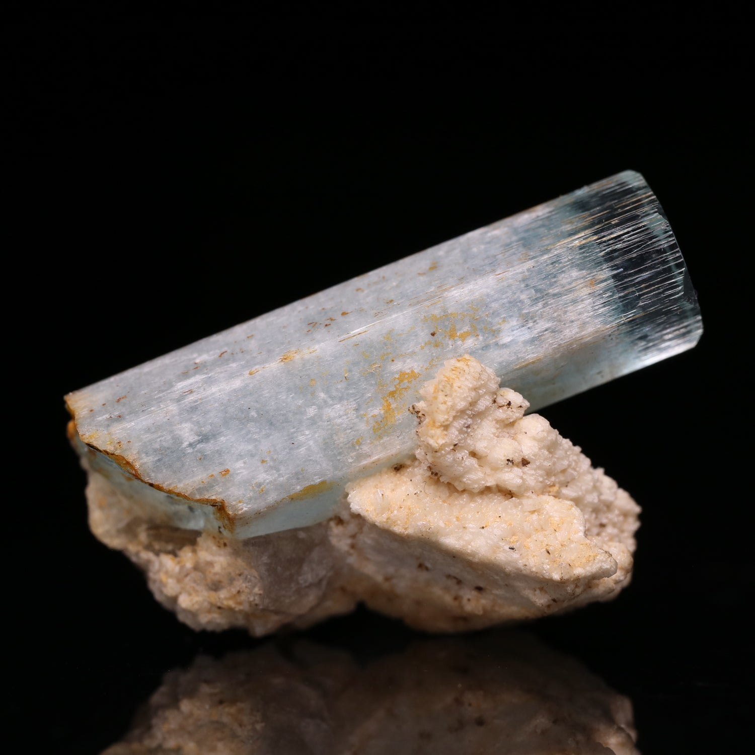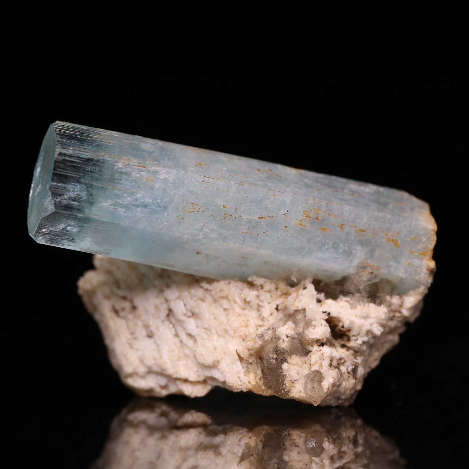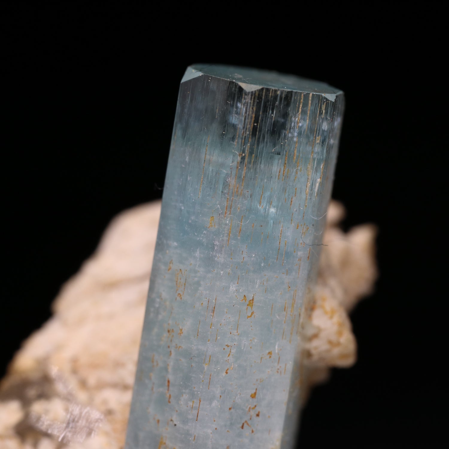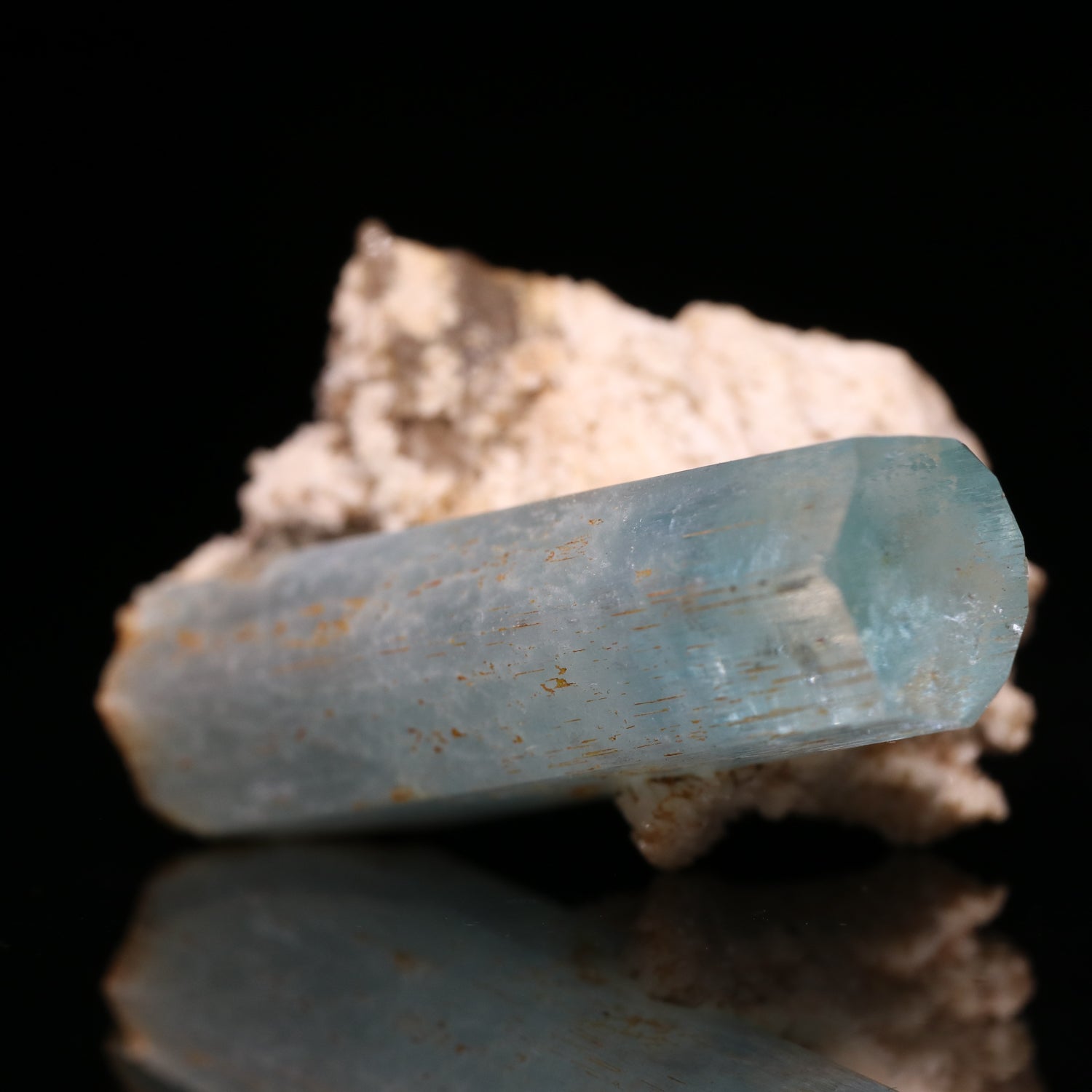 This is a lovely specimen with a single 32mm light blue and lustrous Aquamarine crystal which has minor beveled terminations. The Aquamarine is deposited onto a matrix of Feldspar. An attractive specimen overall.