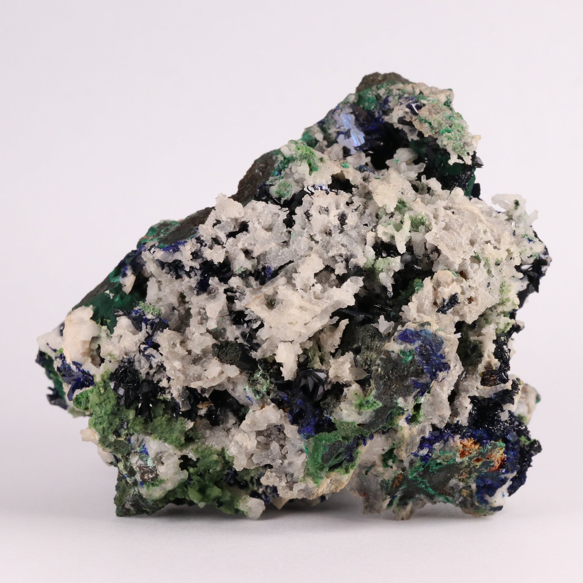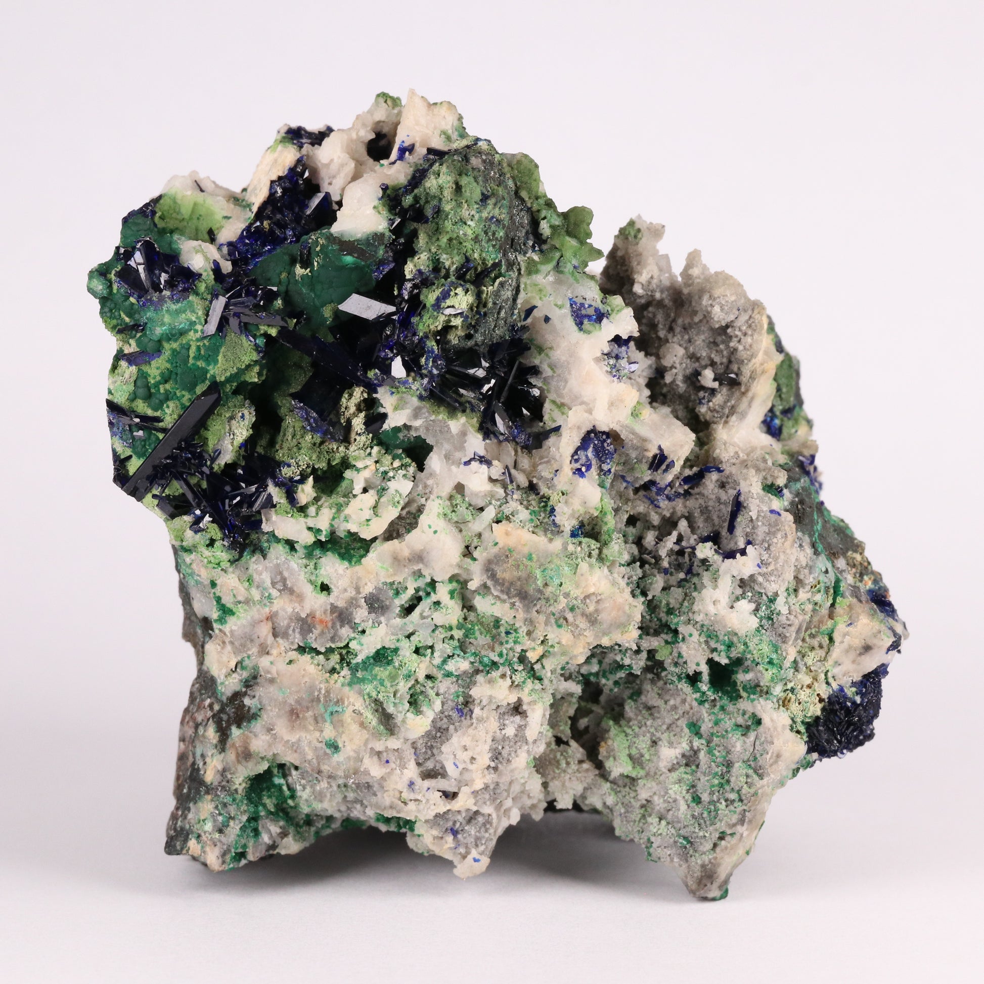 The specimen has a matrix of sulphides ore material and quartz. The outcropped quartz is corroded and etched to a jagged texture and nicely milky to grey. The piece is penetrated with cavities of duftite with malachite. The azurite have elongate prismatic bladed crystals that peep through the quartz and the malachite with duftite. There are two emphatic concentrations of azurite crystals.