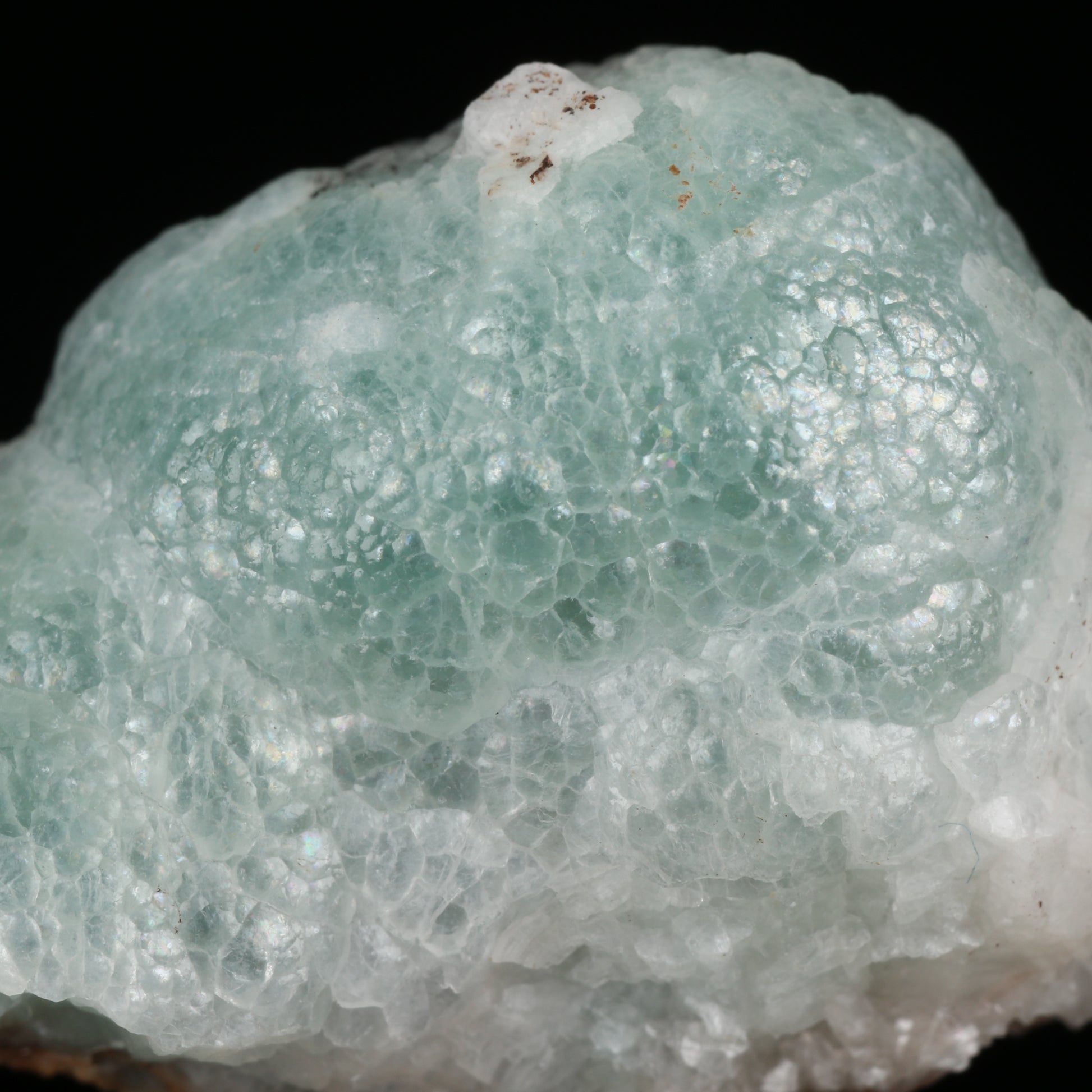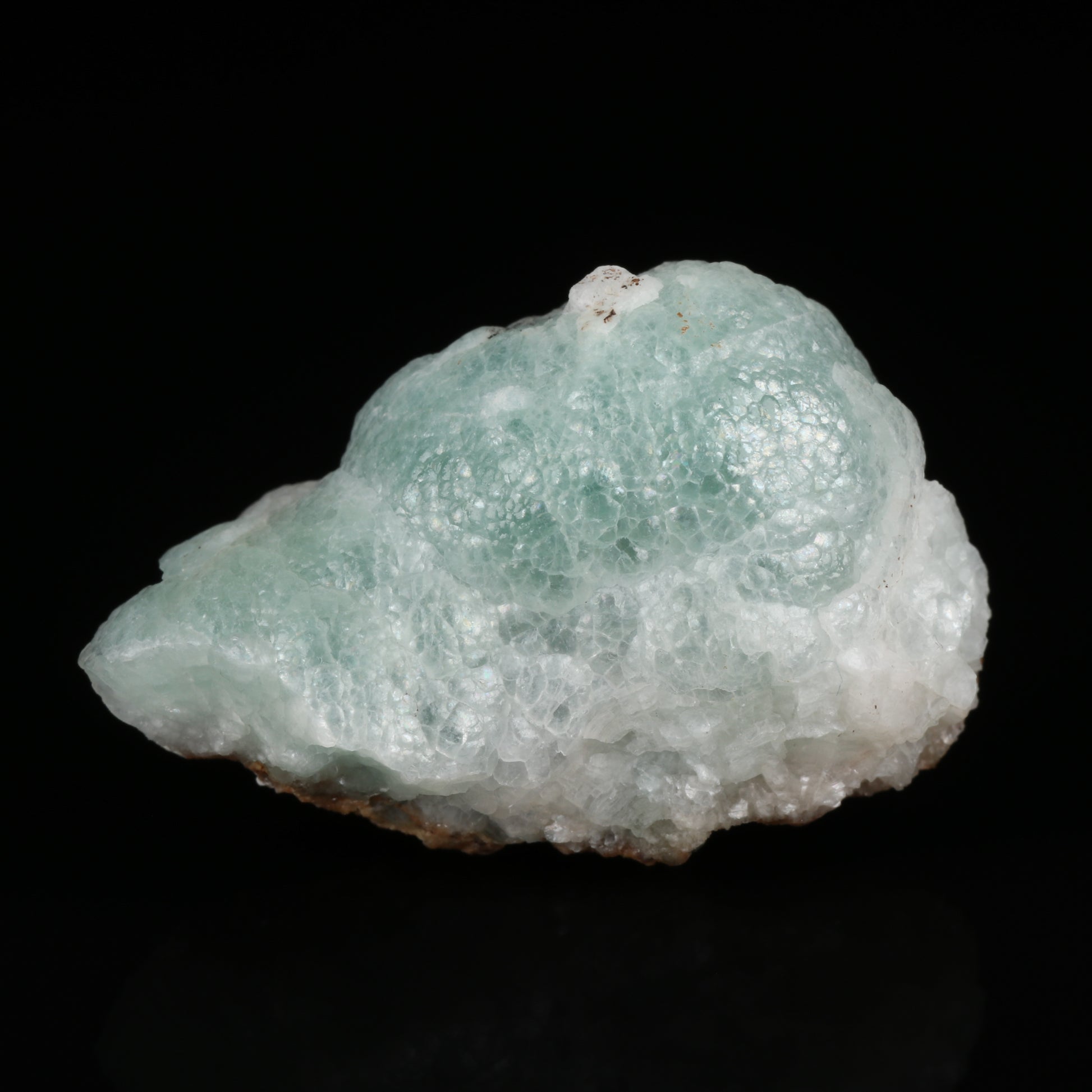 The specimen is made up of intergrown botryoid of brucite with a green blue colour. The brucite has a lovely luster as well as being some what gemmy. Brucite in massive form is common but crystalline is not so common. This specimen is from finds in mid 2000s. The colour is not common.