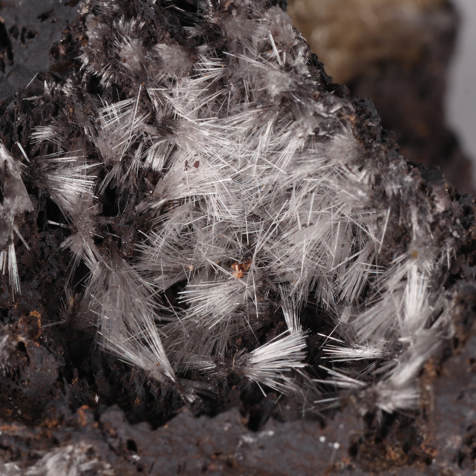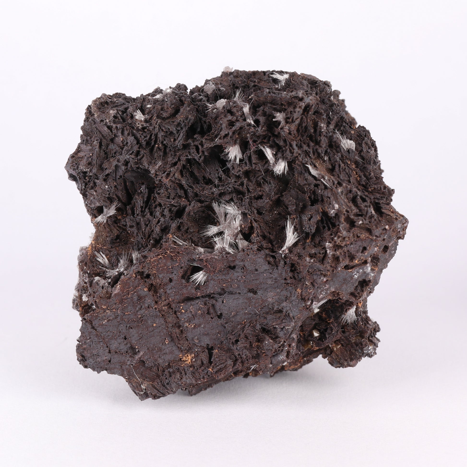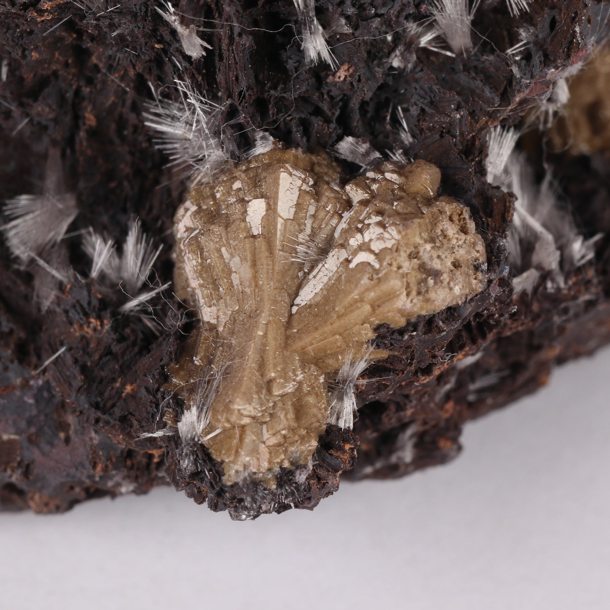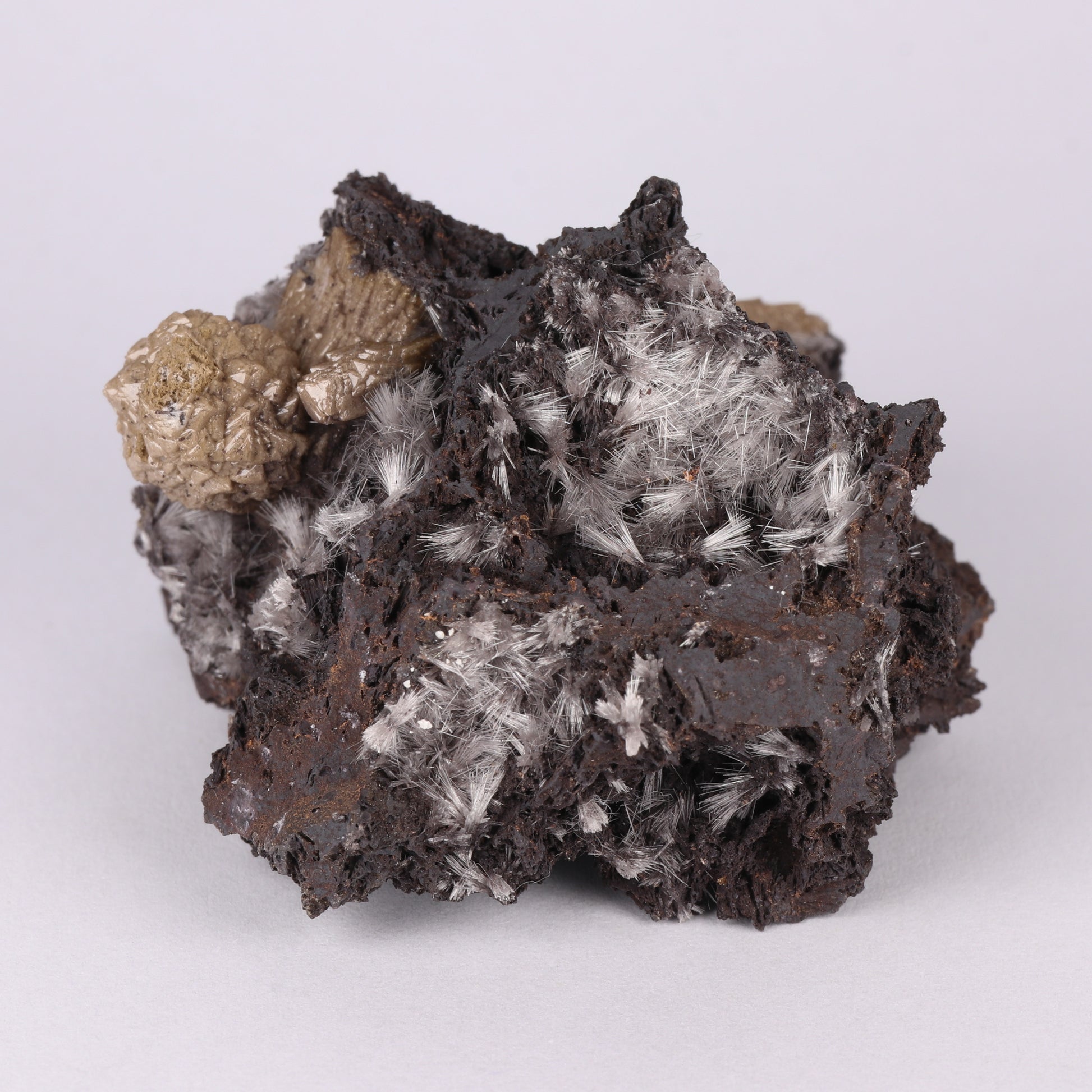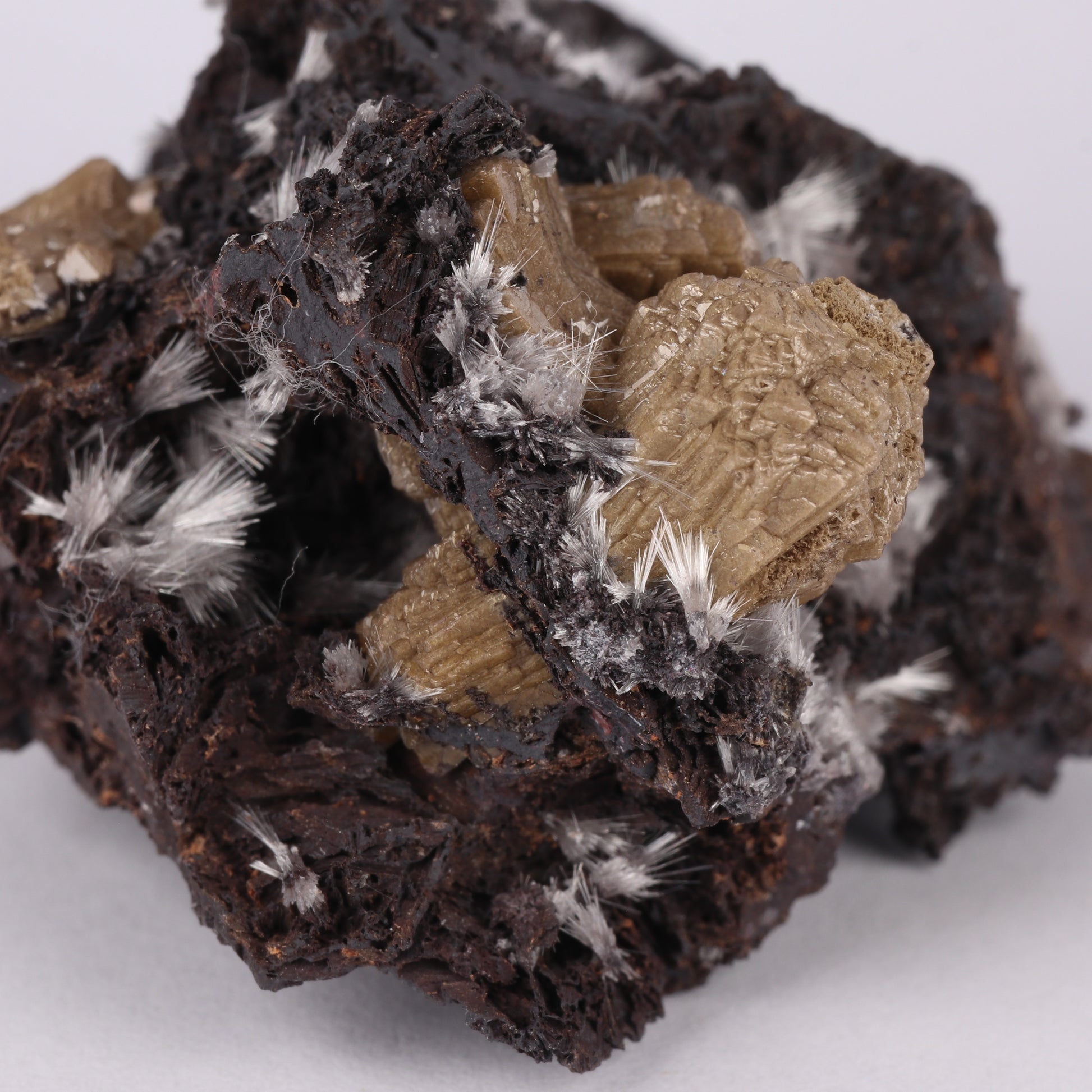 The specimen is with formations of brown olmiite with a few sprays of bultfonteinite sporadically deposited. With the olmiite elongate prismatic crystals bunched together grow to form ball formations. The bultfonteinite consists of fine white needles that grow as radial sprays of long needles, not always of the same length.