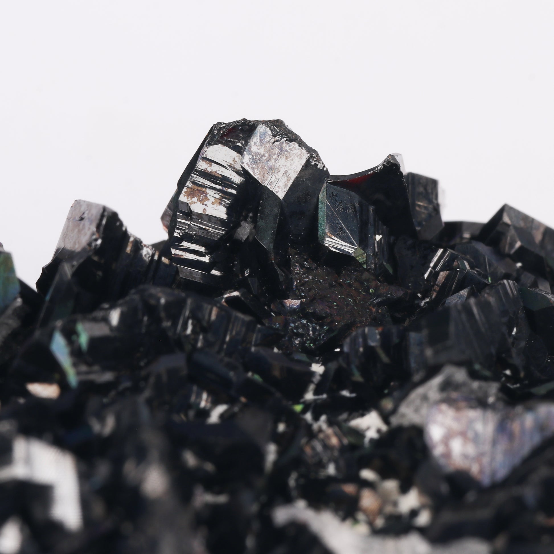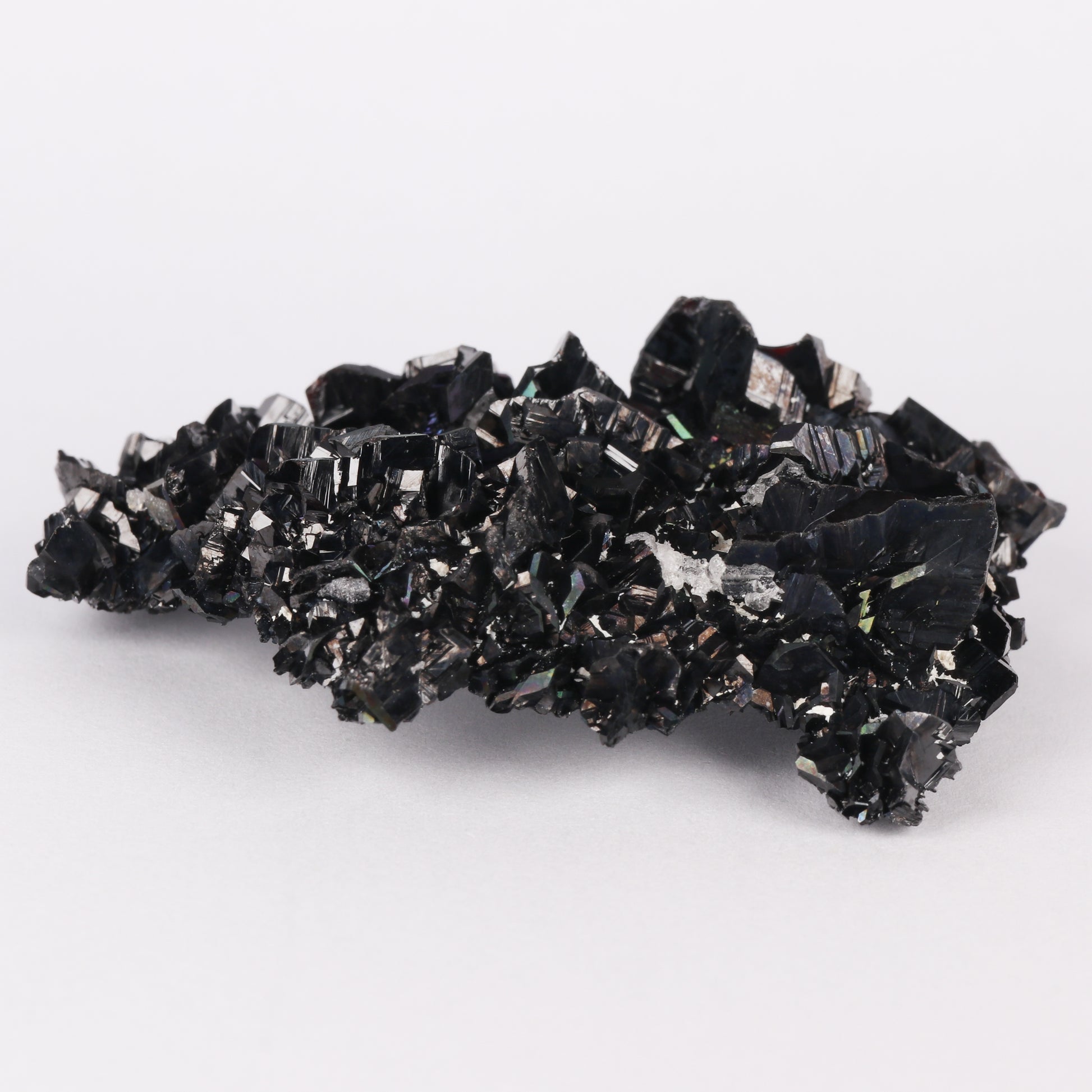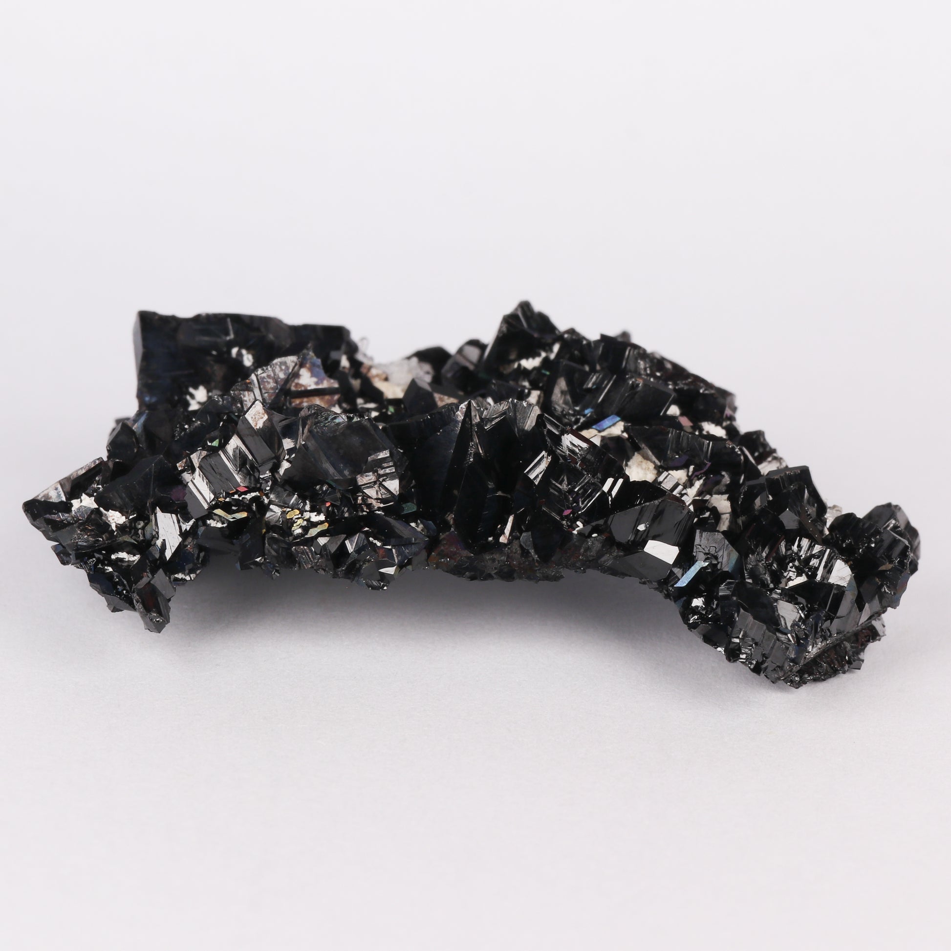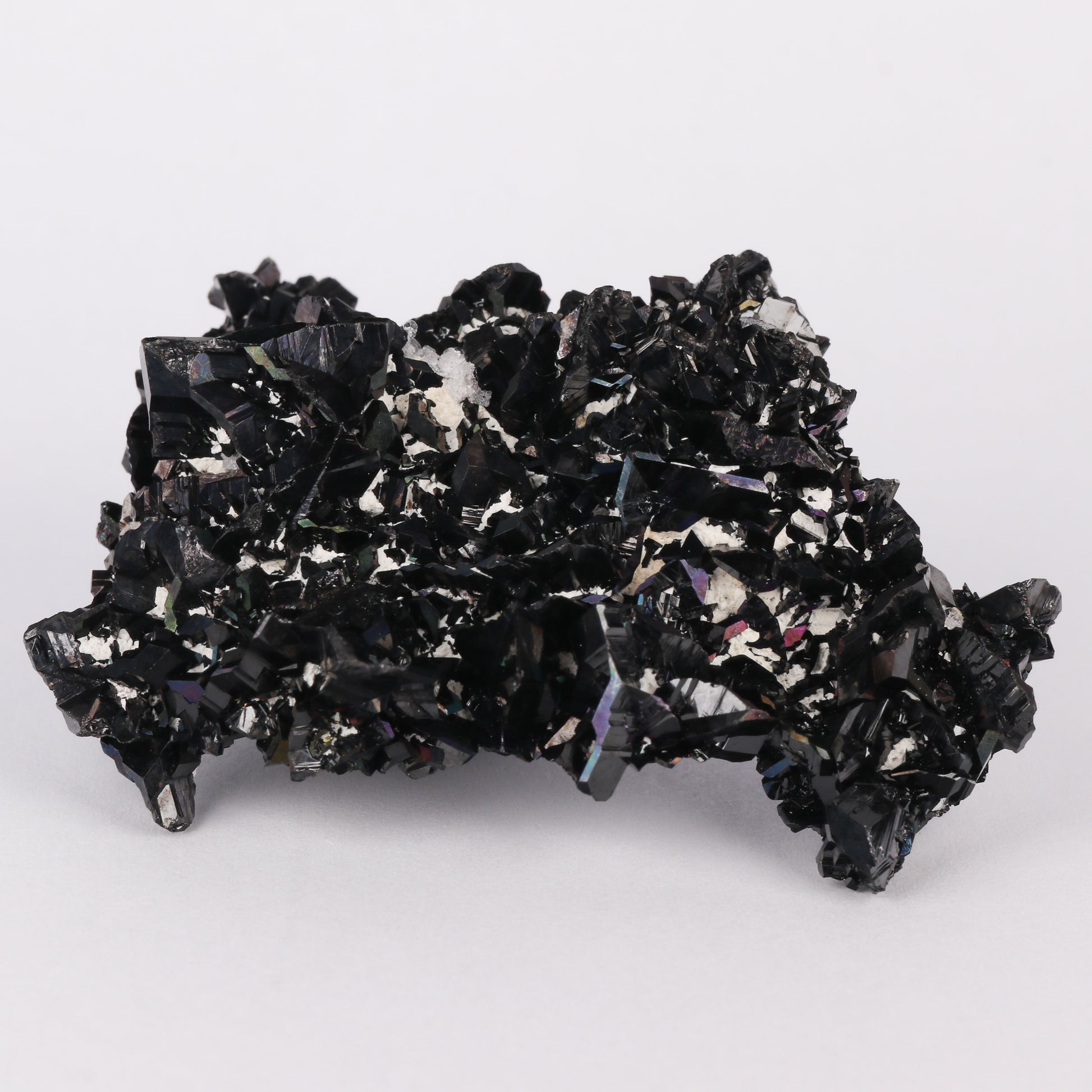 The specimen is a free-form shallow plate of cassiterite. The piece is wholely cassiterite, with the underside more bladed than anything and the good side a complex inter-growth of very crisply formed crystals that have a bladed appearance. The colour is just off-black.