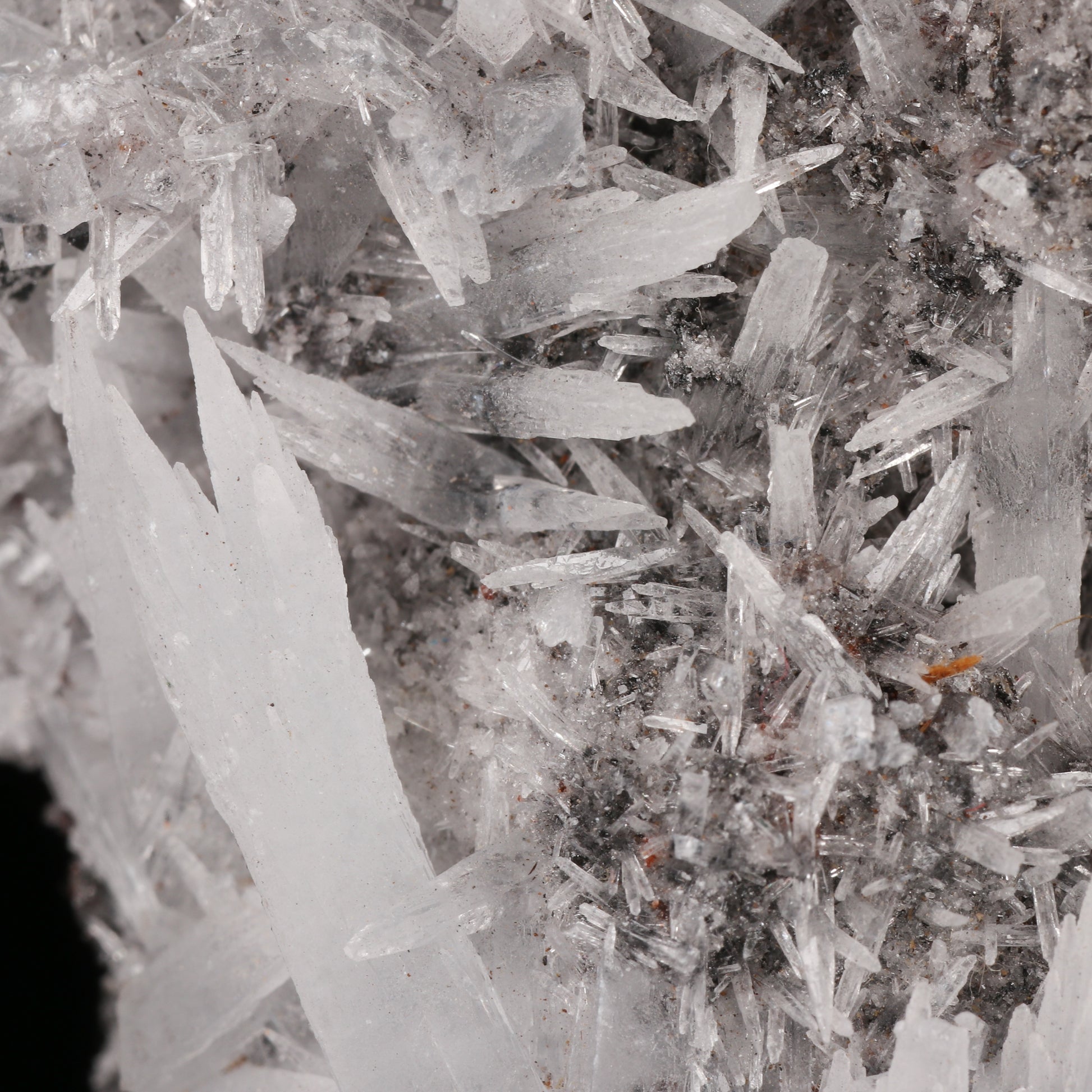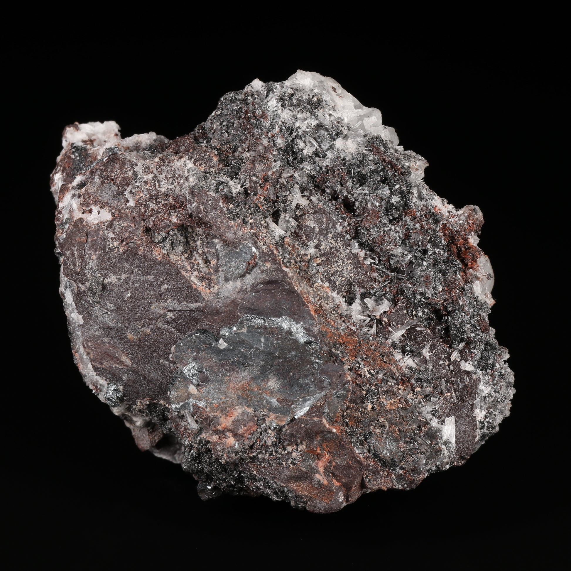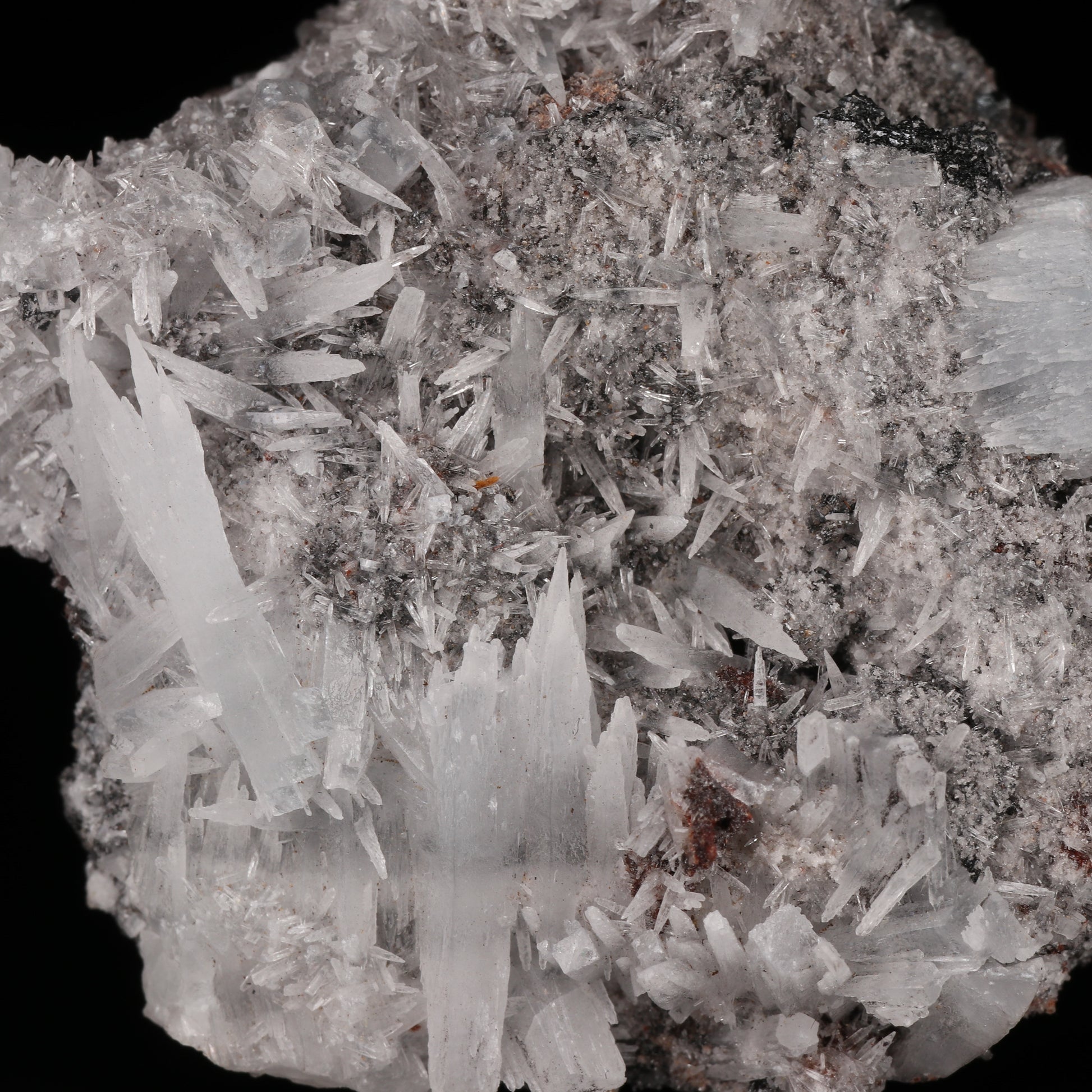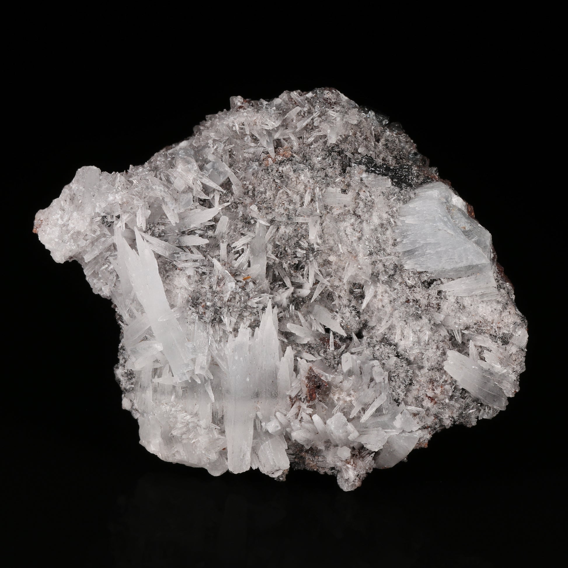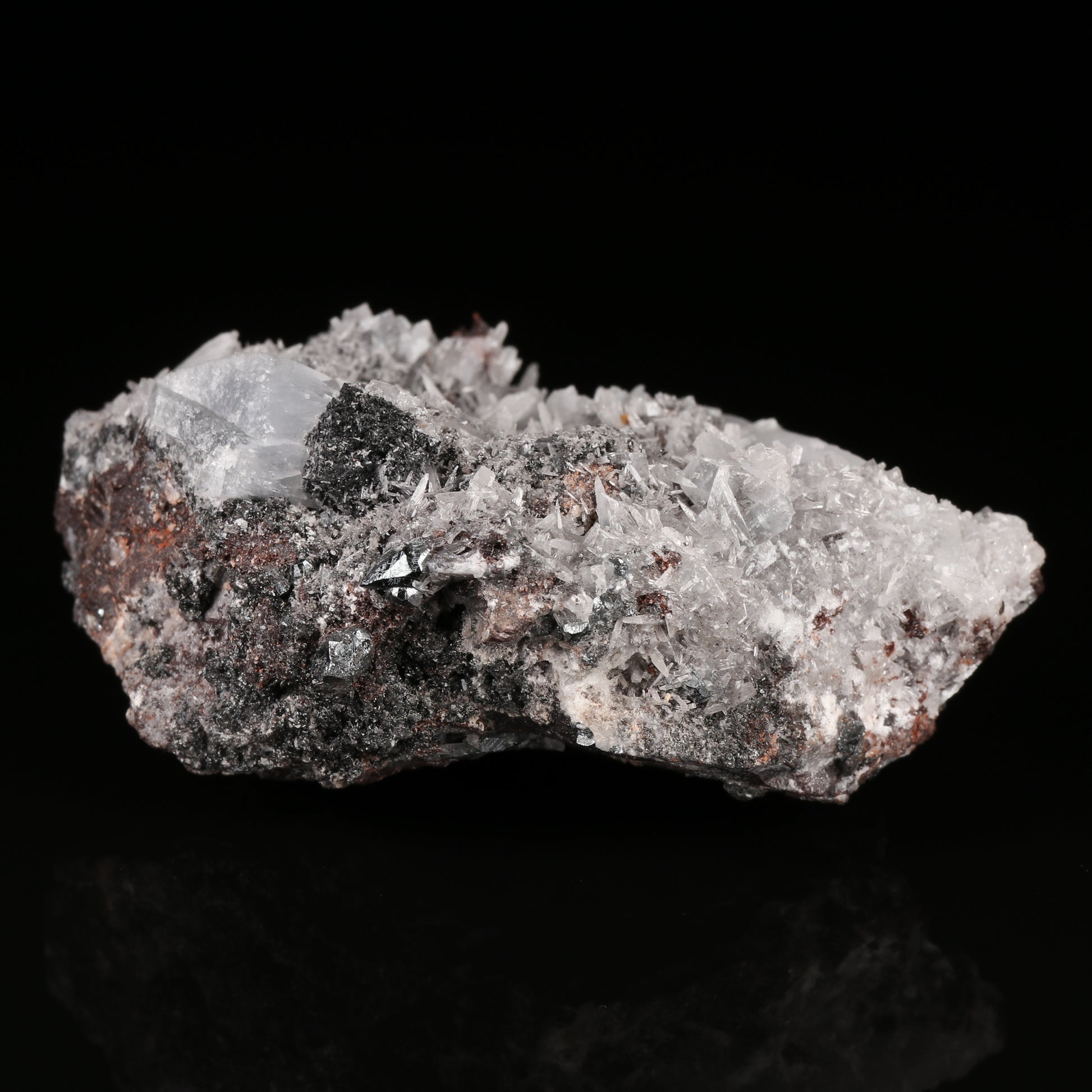 The specimen has an explicit spread of celestine crystals on a matrix of hematite, hausmannite and andradite. Explicit celestine crystals presenting good crystals from small up to the largest at 1.7cm. The larger crystals have formed spears that have a tapering length and a tetragonal cross section. The smaller crystals bring a high level of lustrous sparkle to the specimen. On one side there are hausmannite crystals up to 0.6cm. This is a rare association specimen.