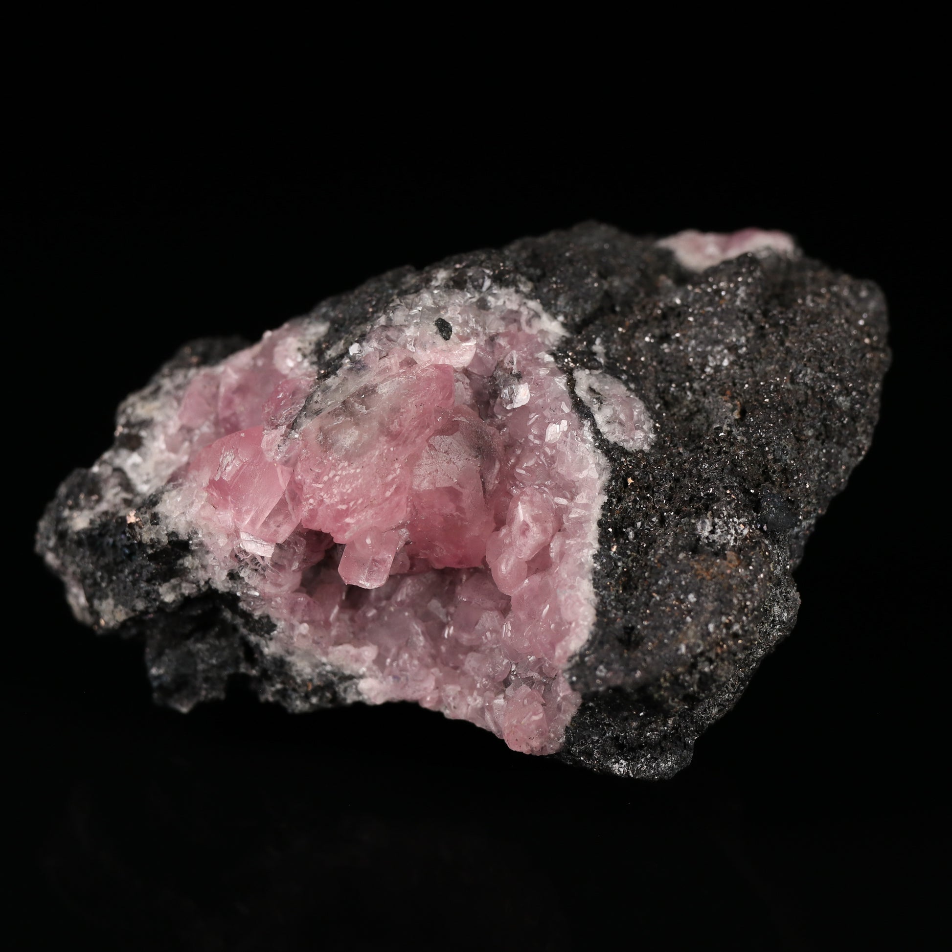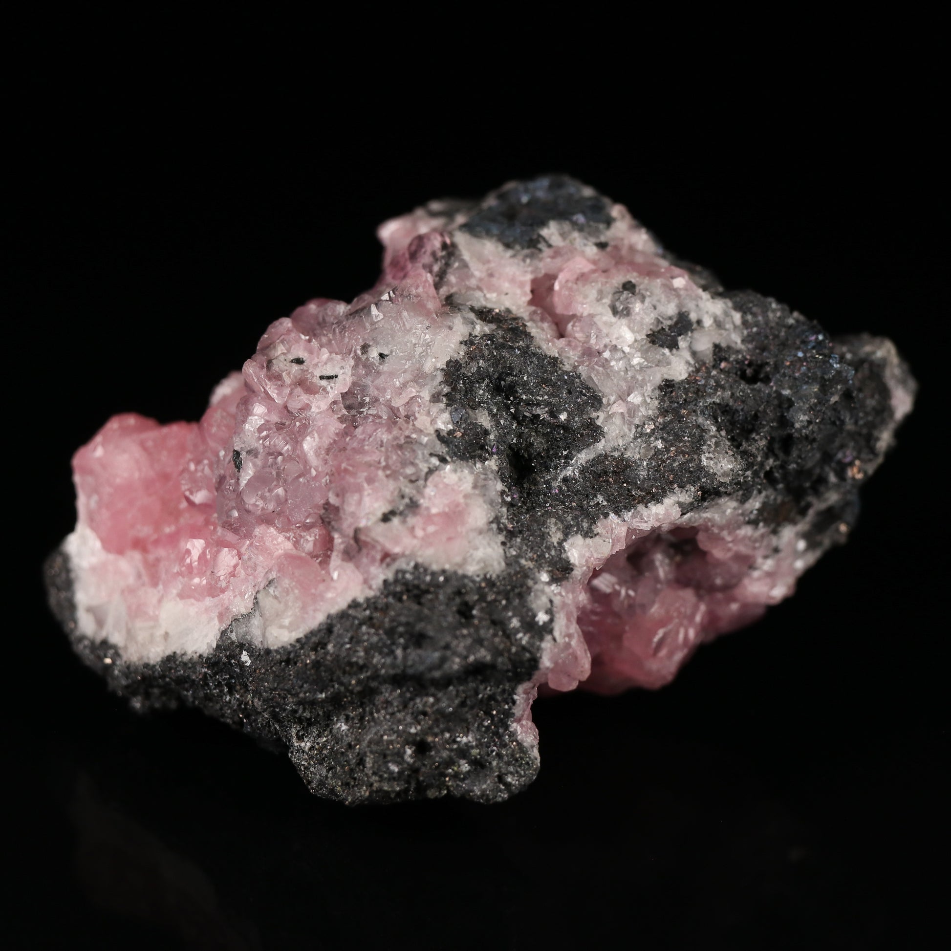 The specimen has a richly coloured growth of pink cobaltoan smithsonite on two sides of the matrix of complex ore. The aggregate growth of the crystals is very compact in a tightly intergrown distribution with a main crystal in each deposit. The largest crystals 1cm and 1.1cm across, the smaller one is not complete.