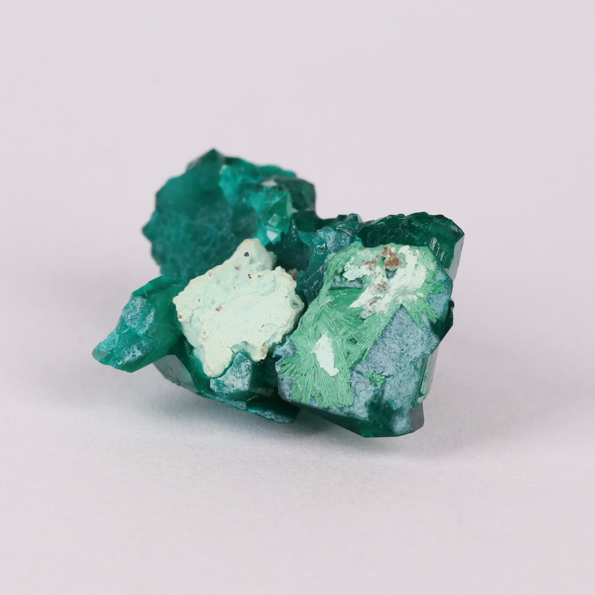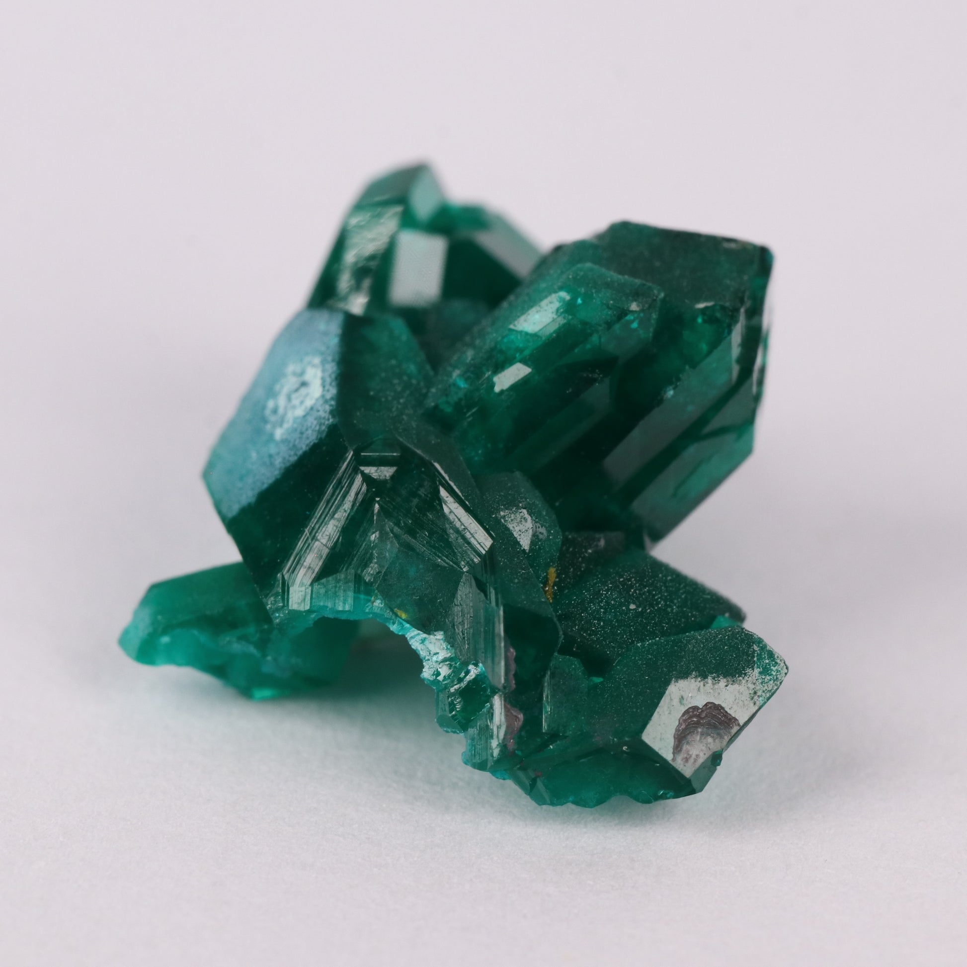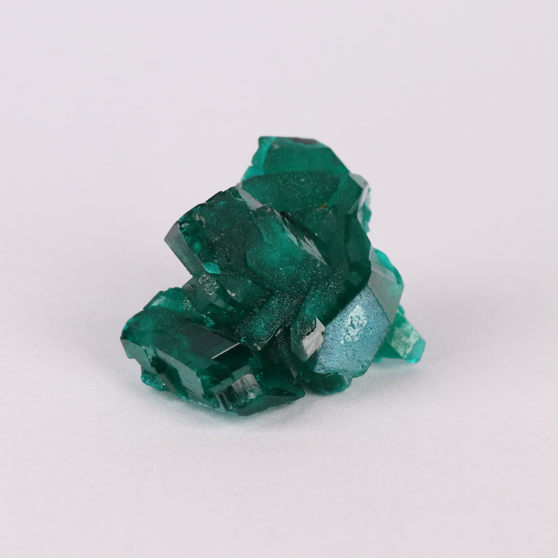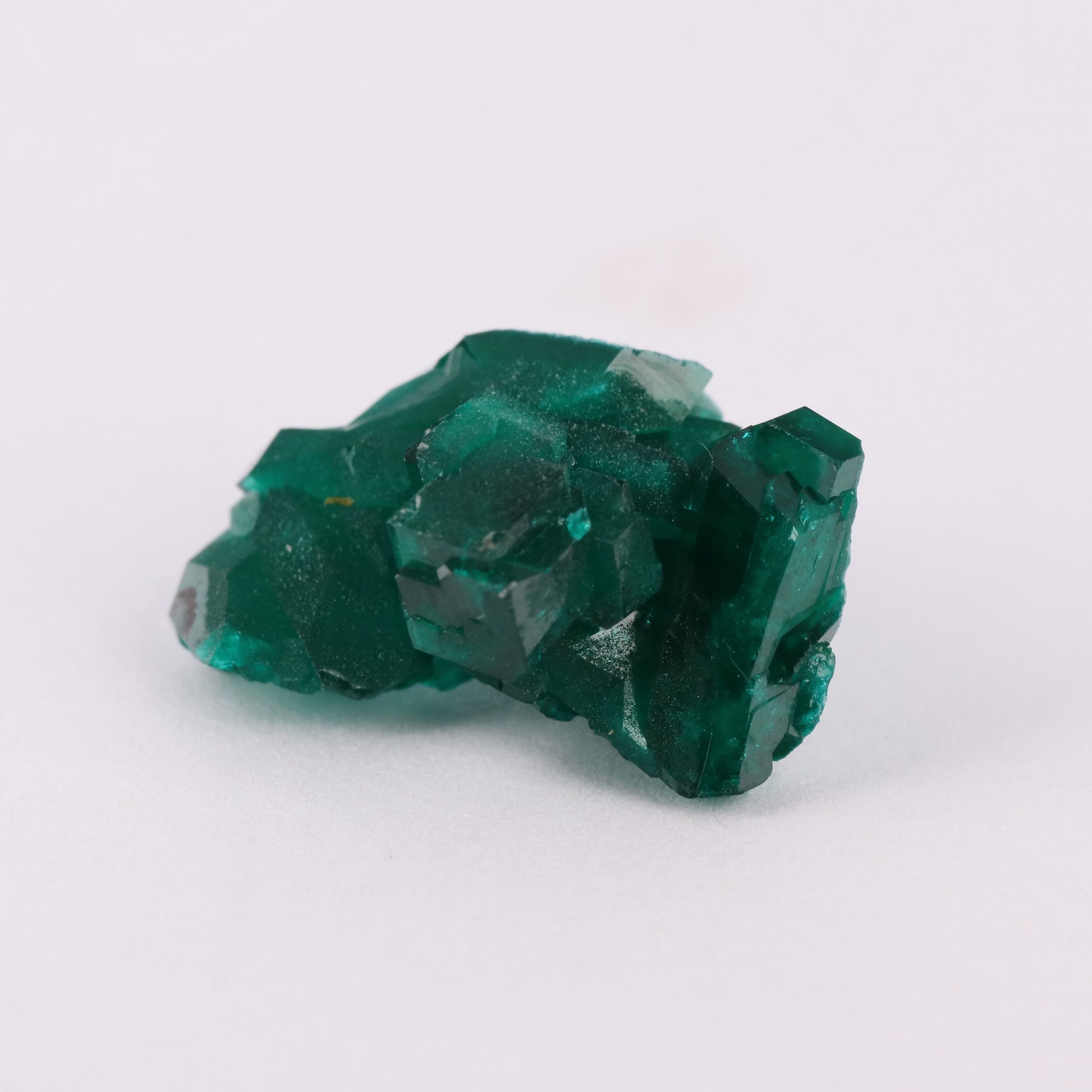 The specimen is a small intergrown cluster of dioptase crystals. The small specimen makes a good display piece with the main crystal to 1cm. The specimen is from finds around 2012 with good luster and a lovely emerald geen colour. There are a few minor abrasions.