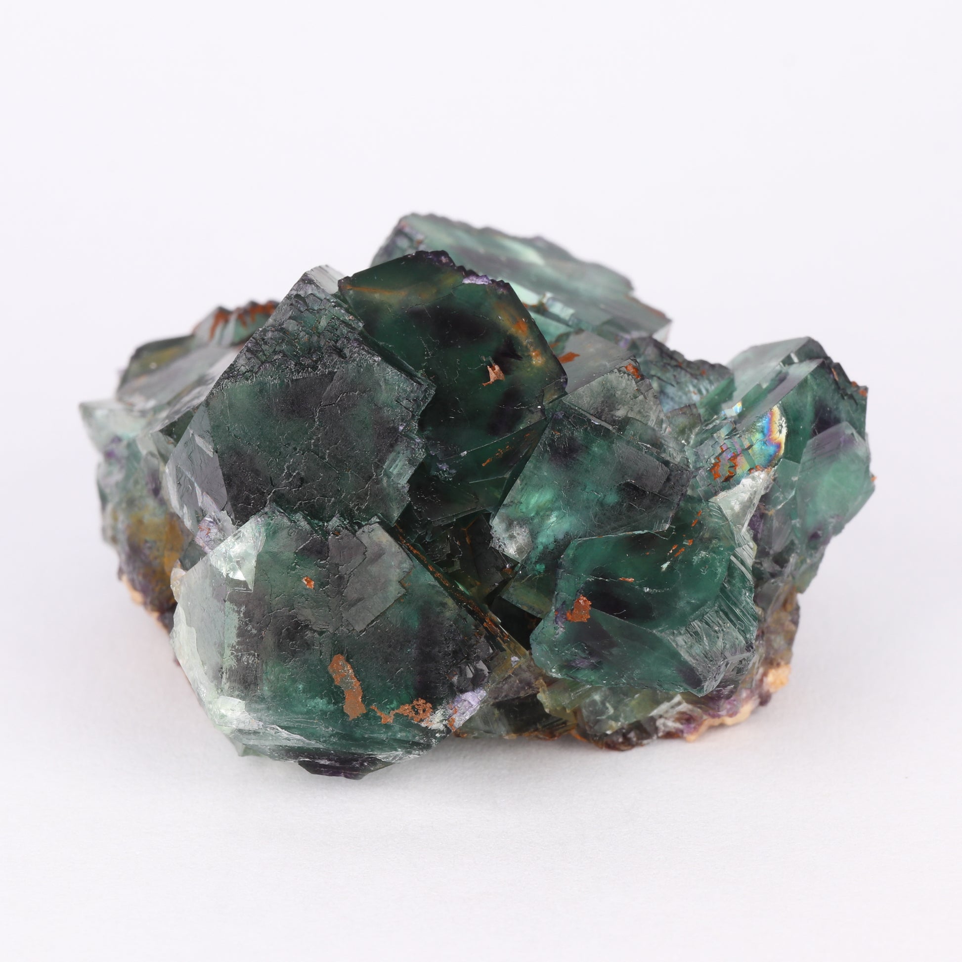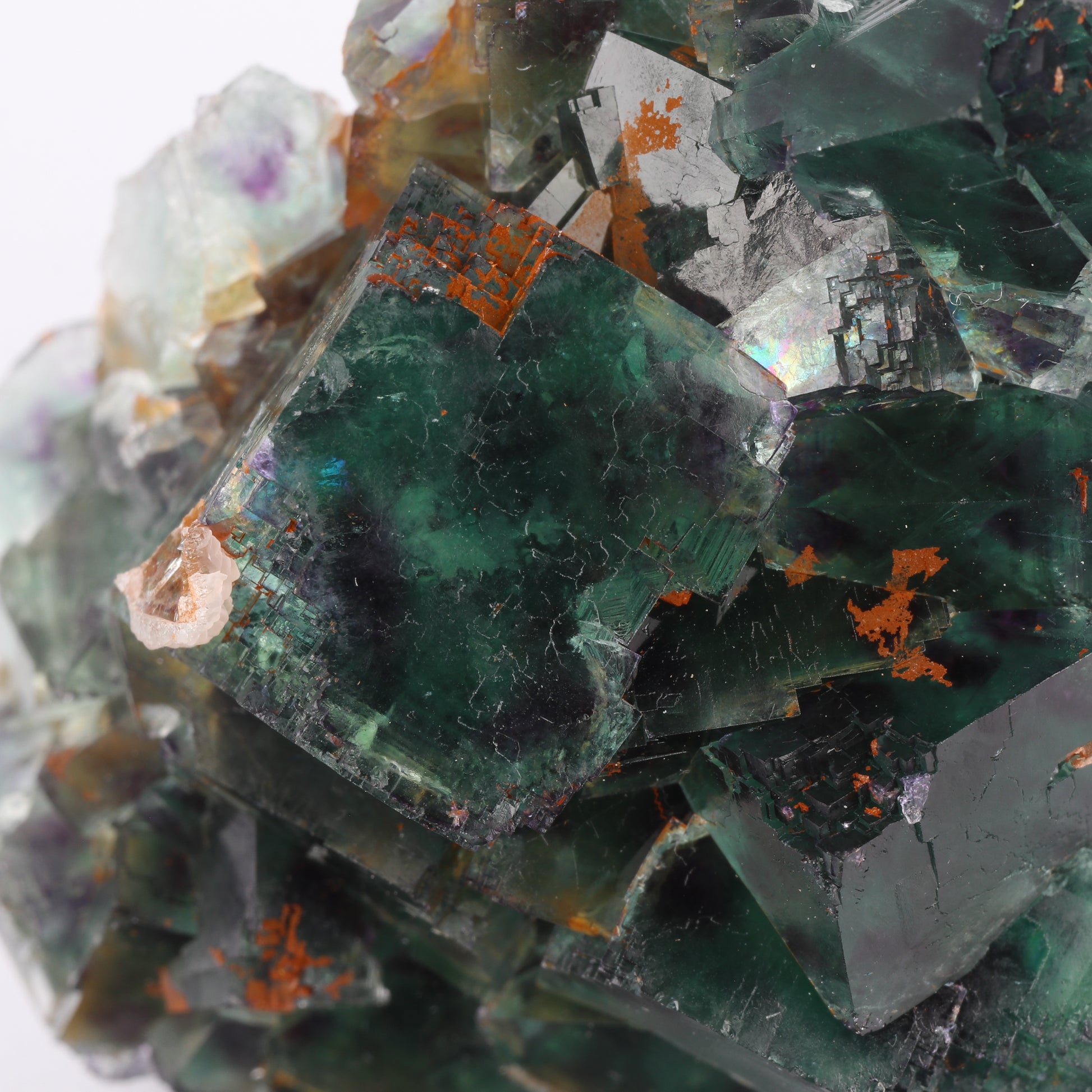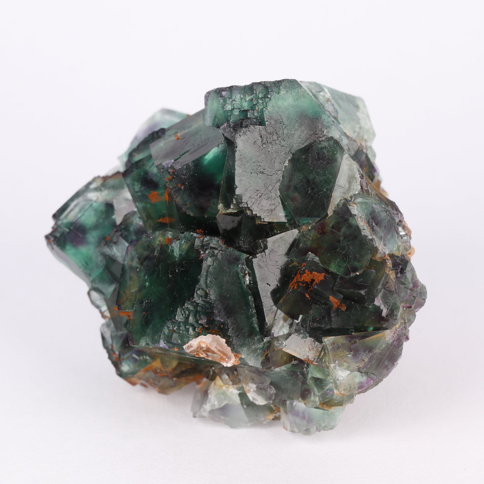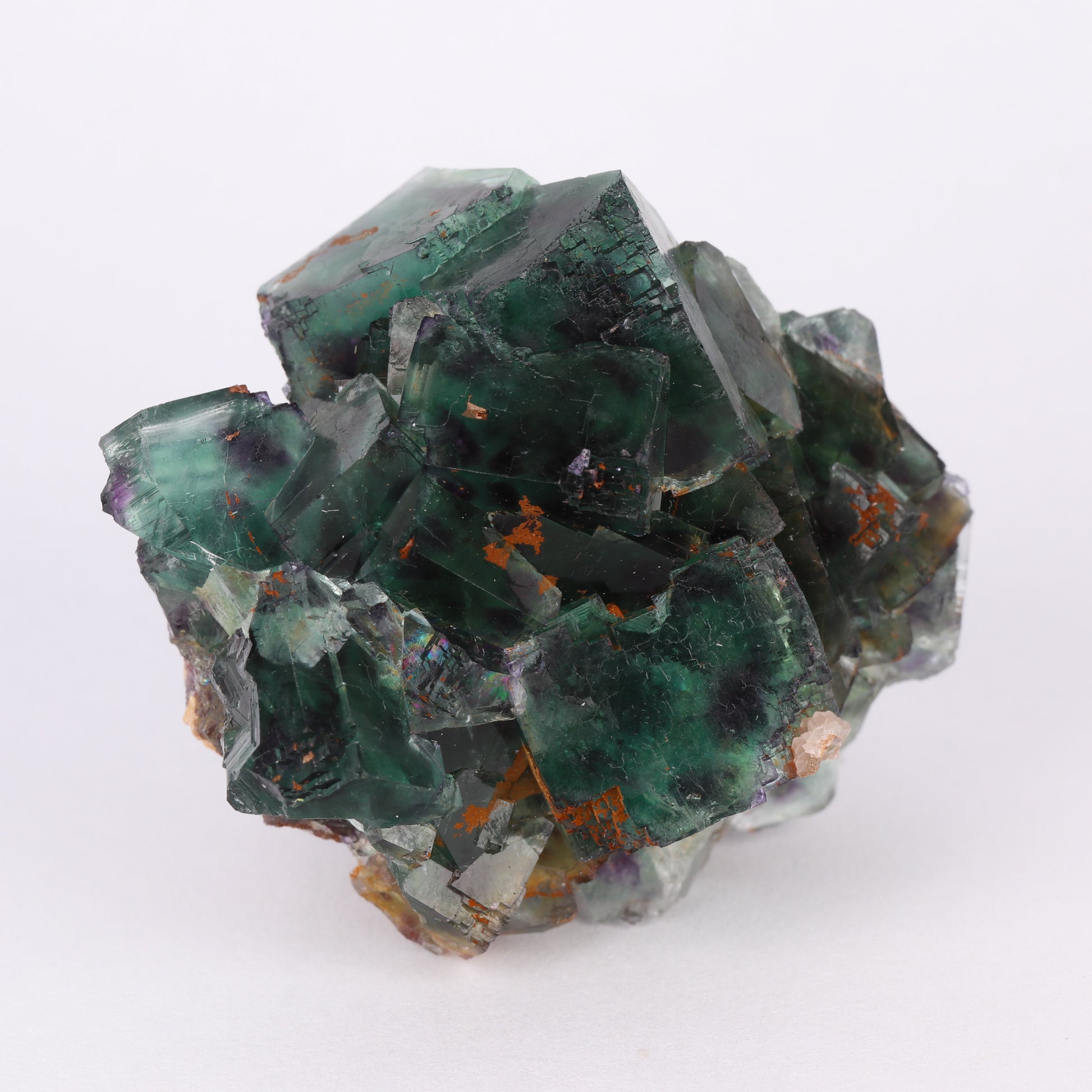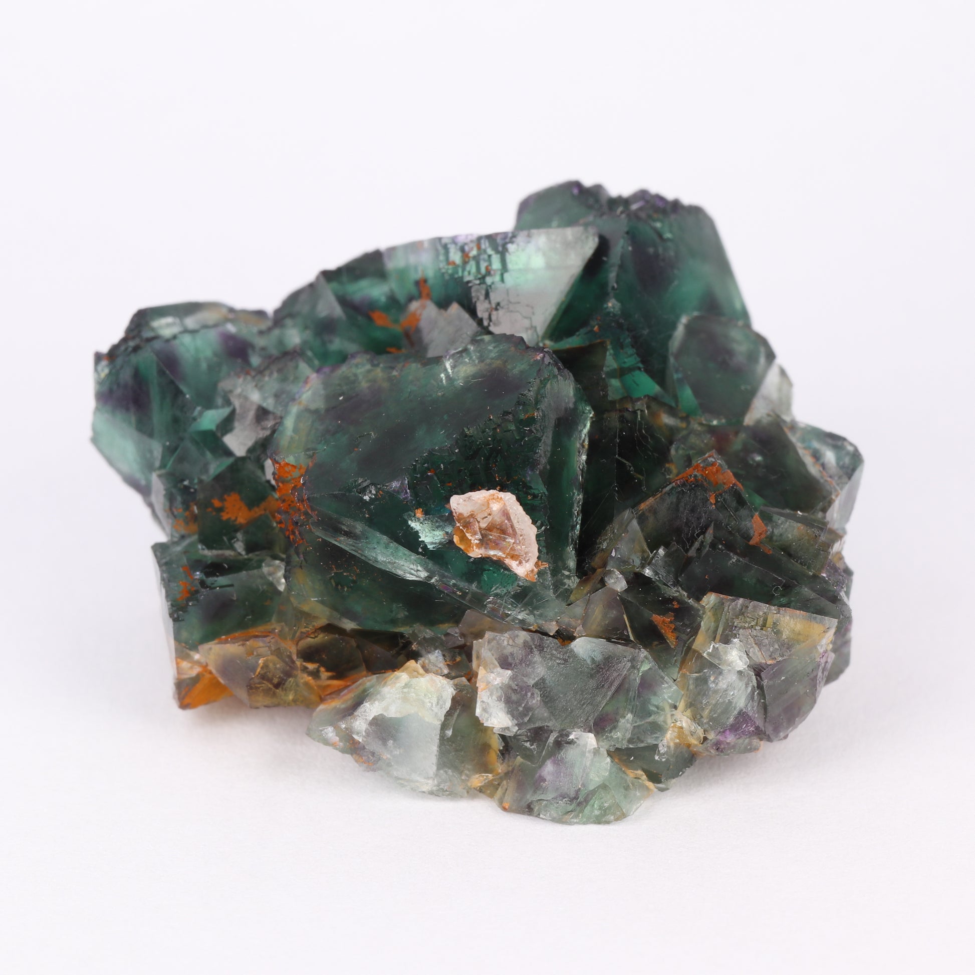 The specimen consists of a cluster of medium coloured green cubic crystals of fluorite. The cubic crystals have a modified habit with the edges in stepped cubic structures. The green colour shifts towards transparencies of veridian. The fluorite crystals are zoned with four purple spots on each edge, I believe this is what is known from the dice pocket. The largest crystal here is 1.4cm on edge. There are a couple of cleaved crystals along the perimeter.
