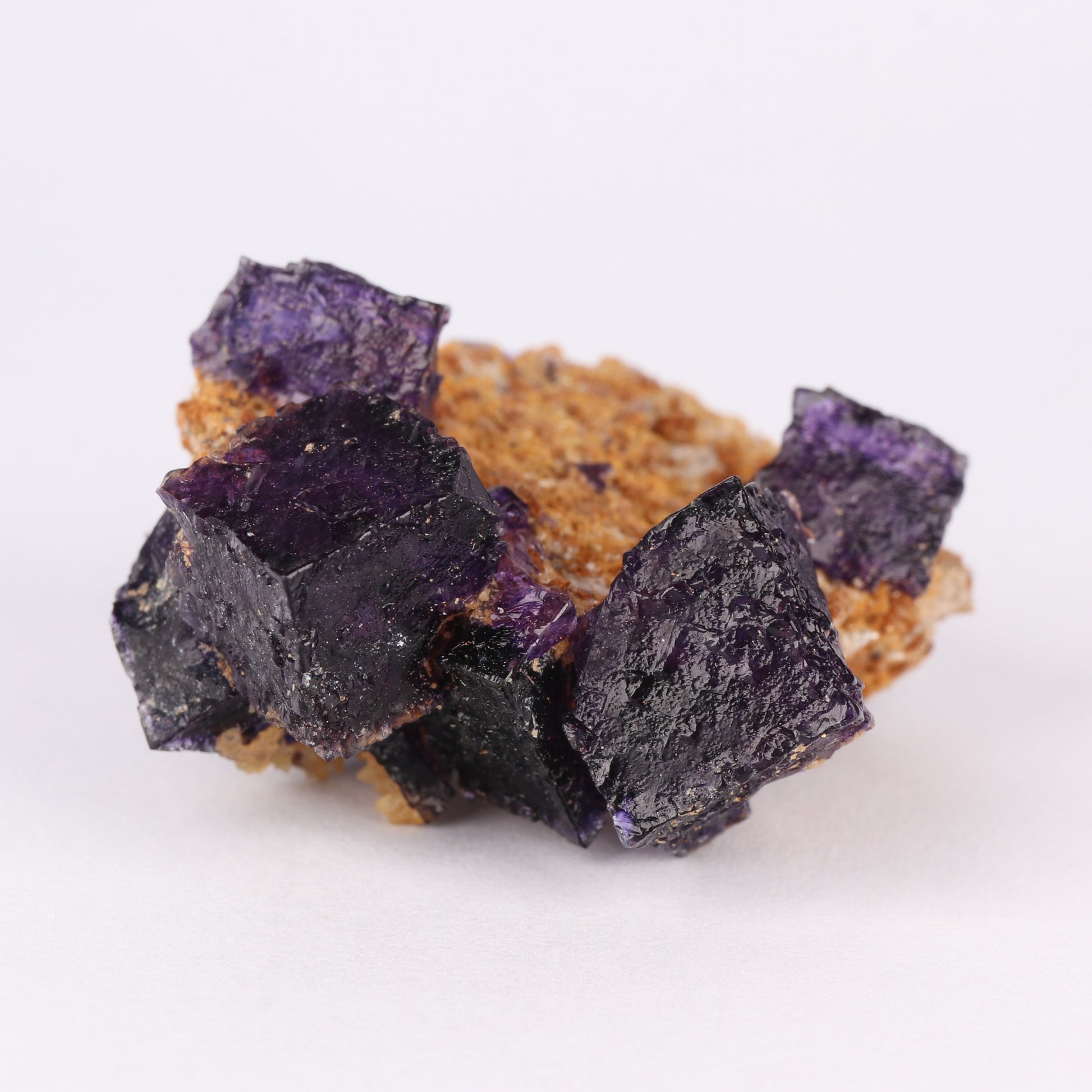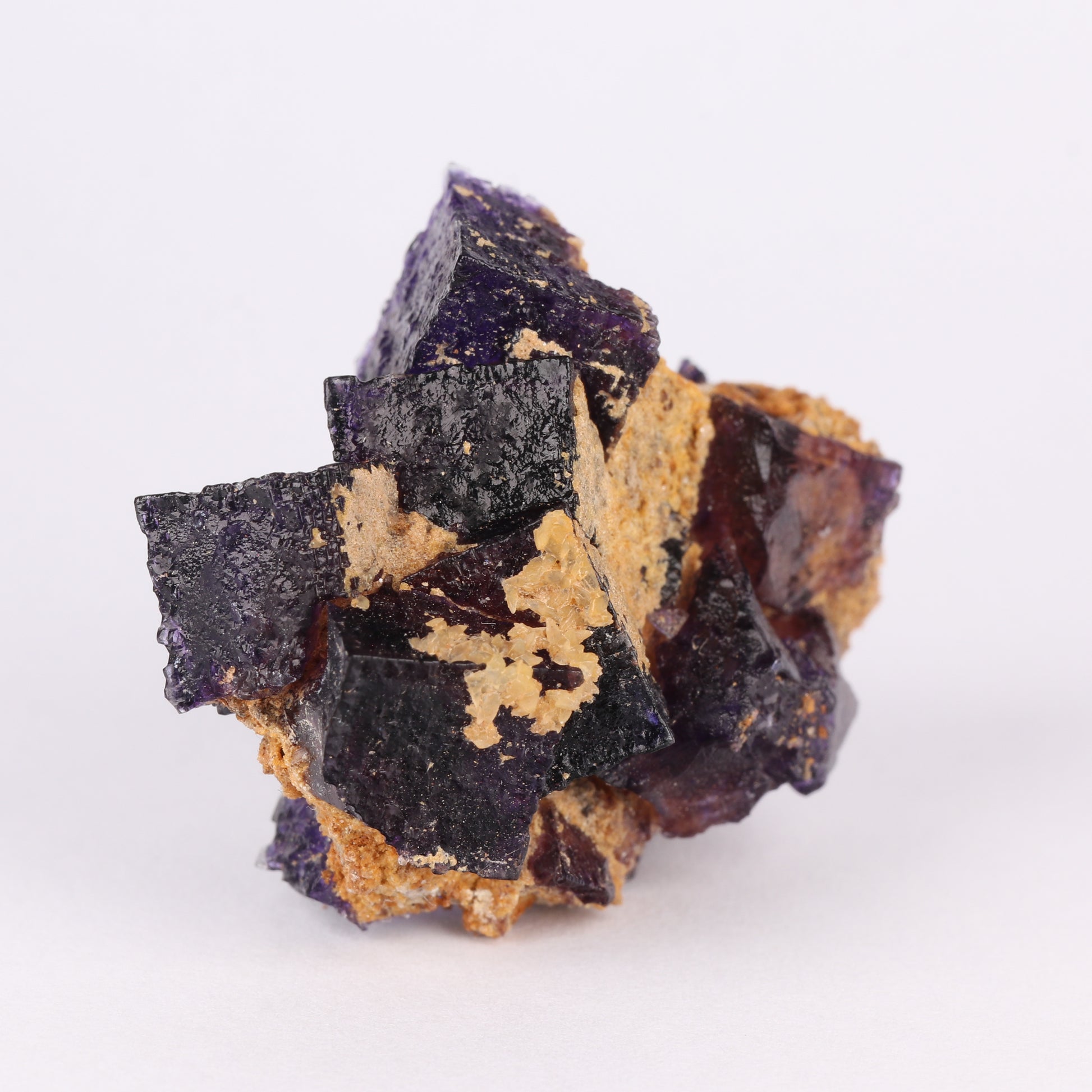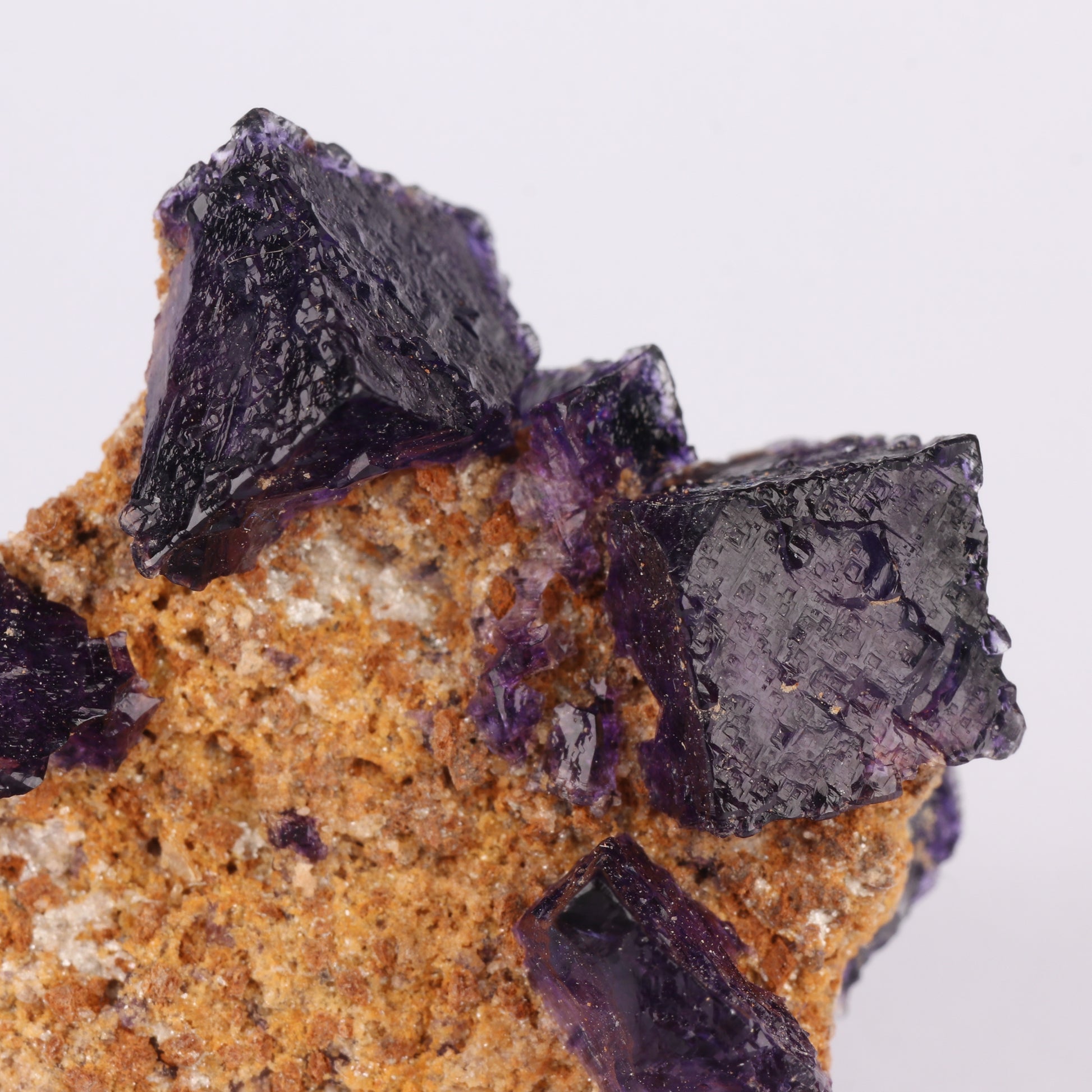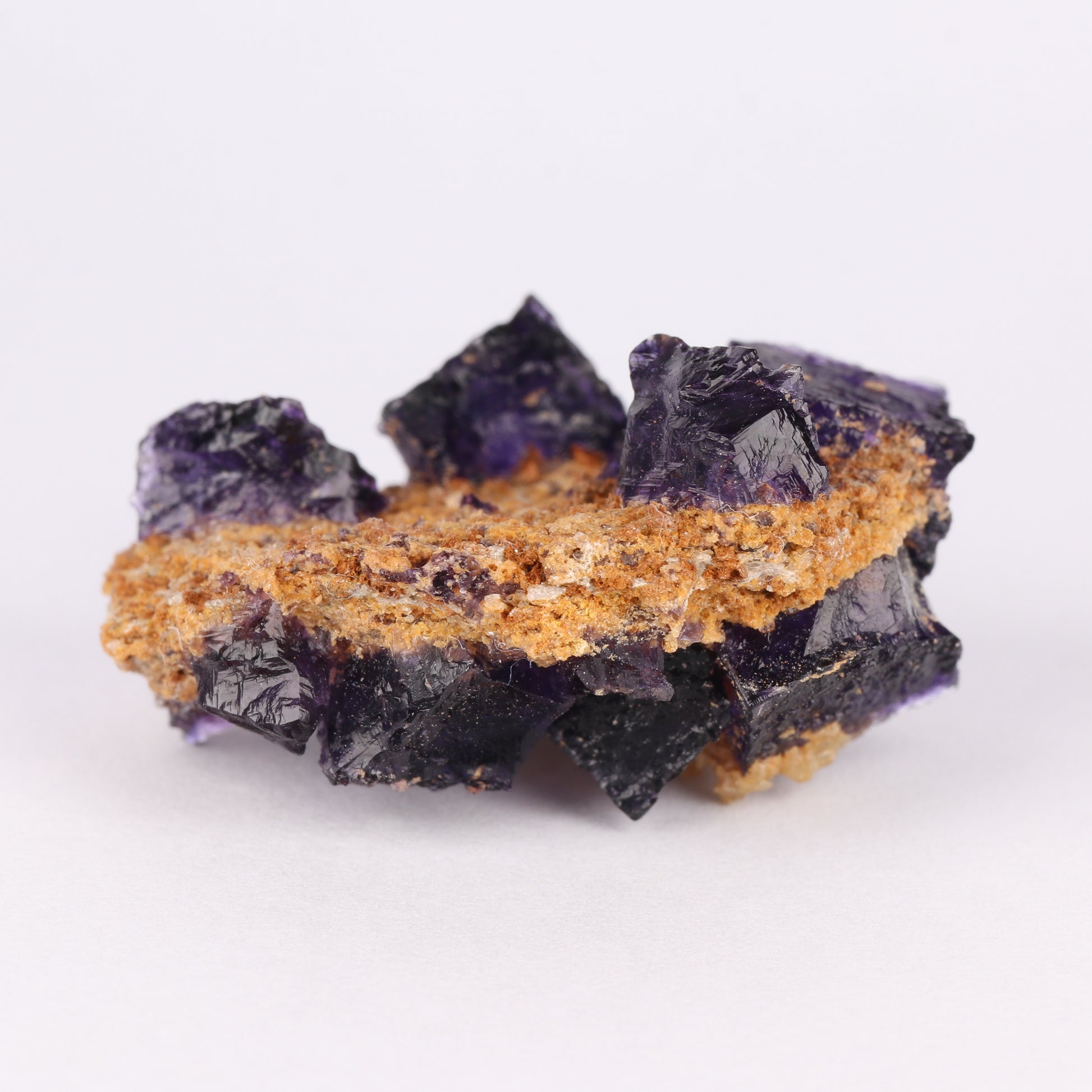 The specimen has an unusual crystal formation of fluorite on a cementation aggregate in the form of a thin plate. The fluorite is a lovely light violet colour. The top surface is deeply incised and also carries some natural geometric diagonal incissions into the surface plane. Crystals measure to 0.9cm