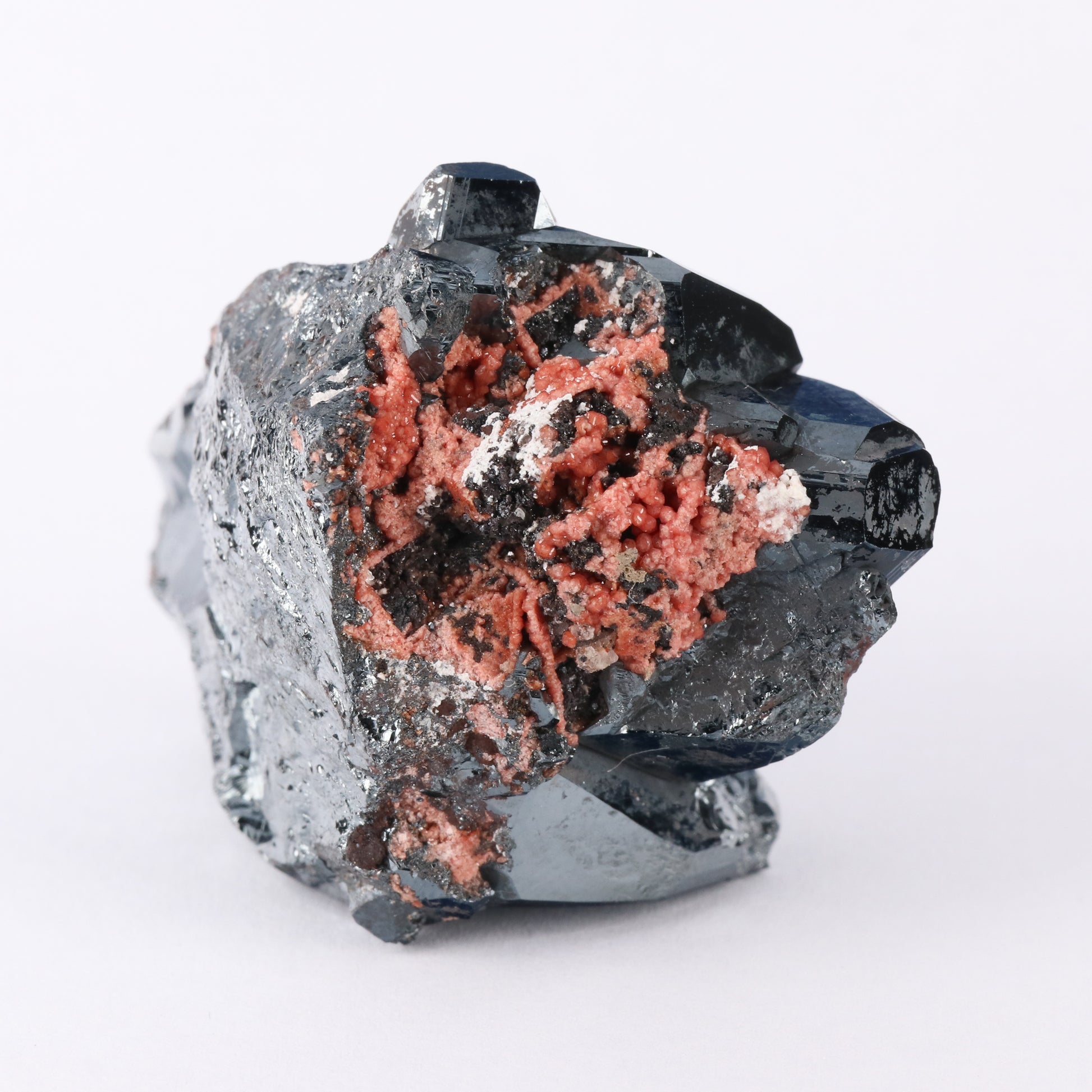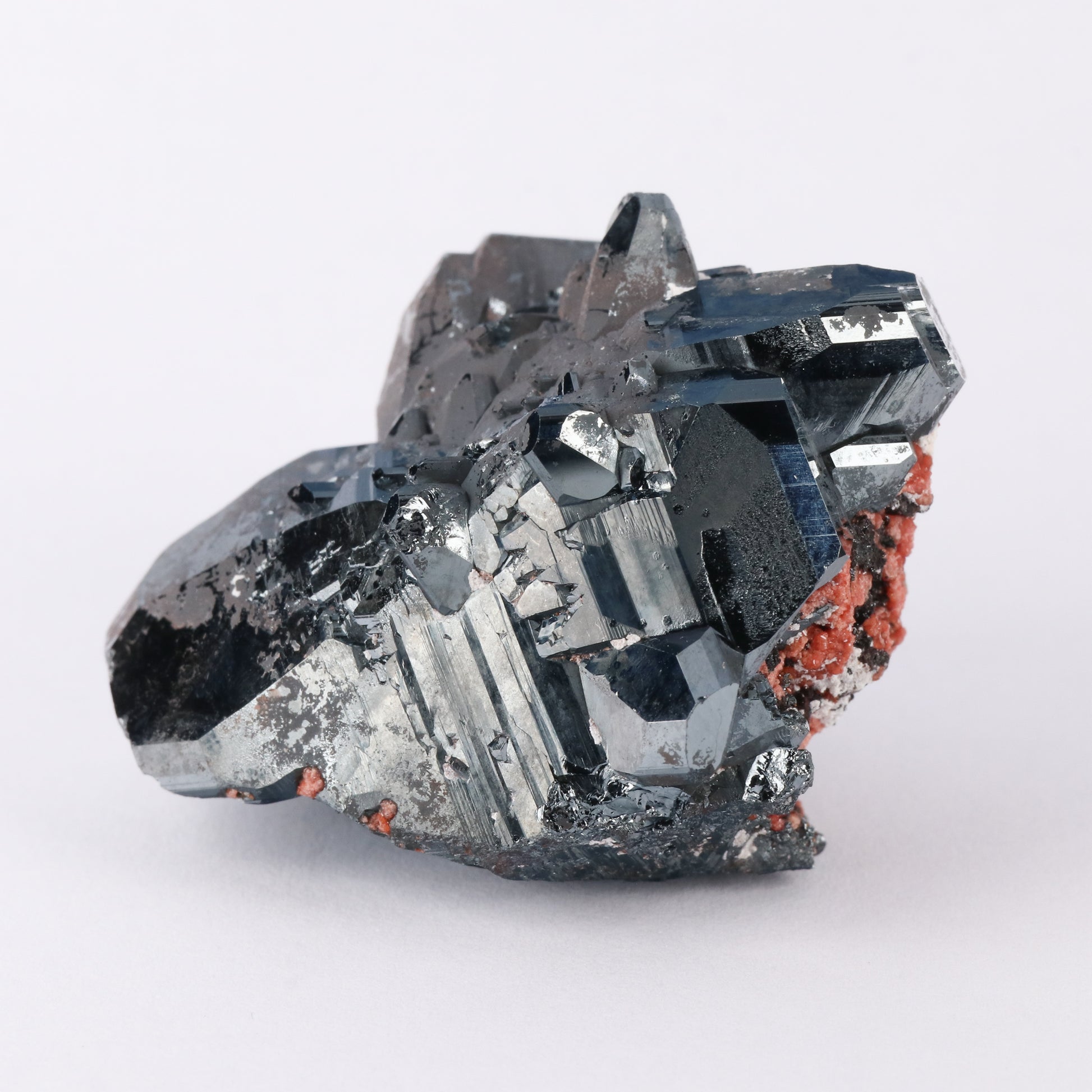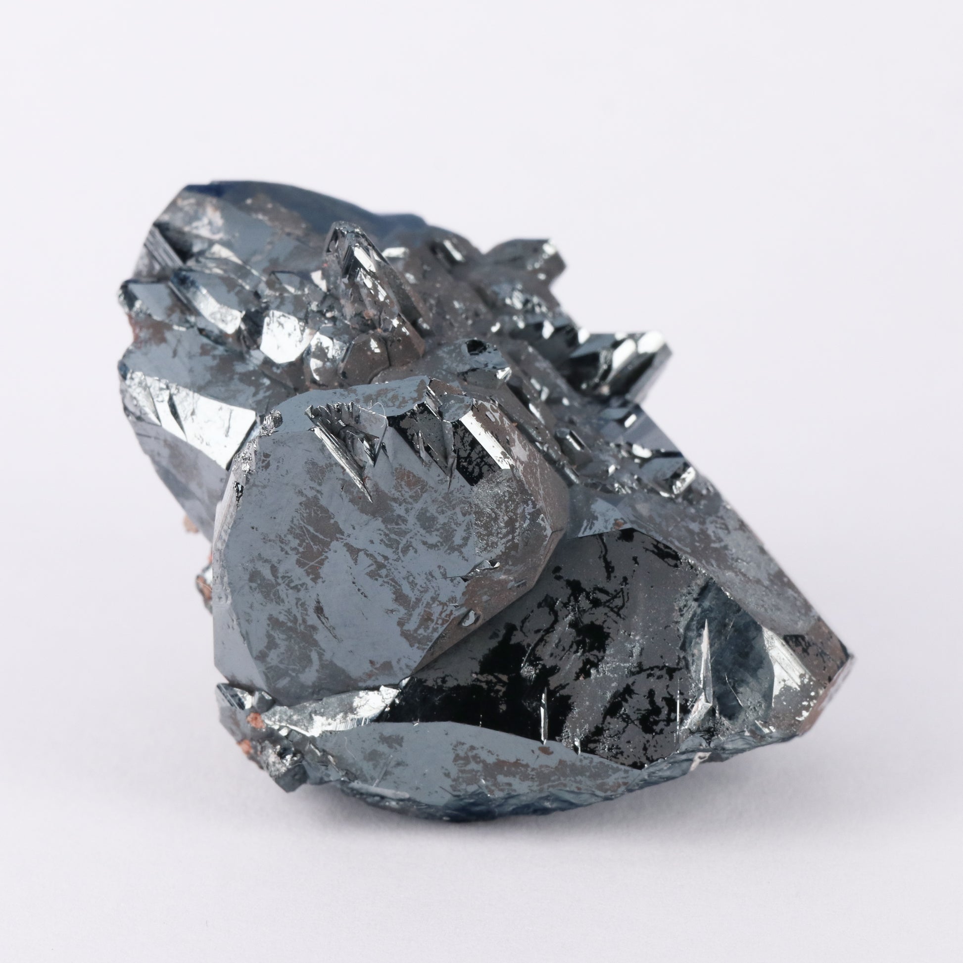 Some of the world's finest hematite specimens are found at the Wessels Mine. This miniature features a 4.1cm scalenohedron with a few side car crystals. The hematite crystal has very sharp, metallic, highly lustrous faces and the classic steel-black color. The specimen has a couple of abrasions here and there but overall a presentable specimen.