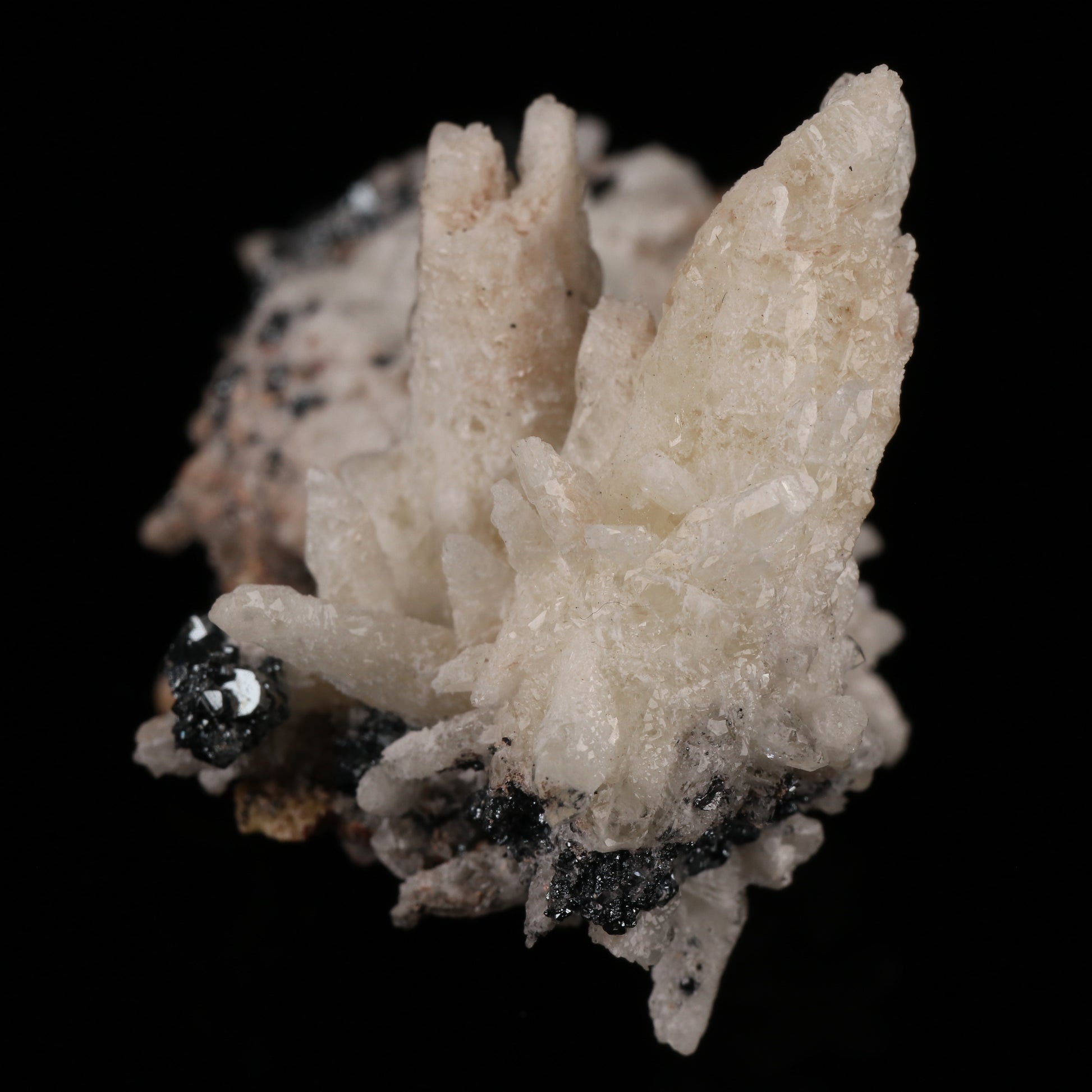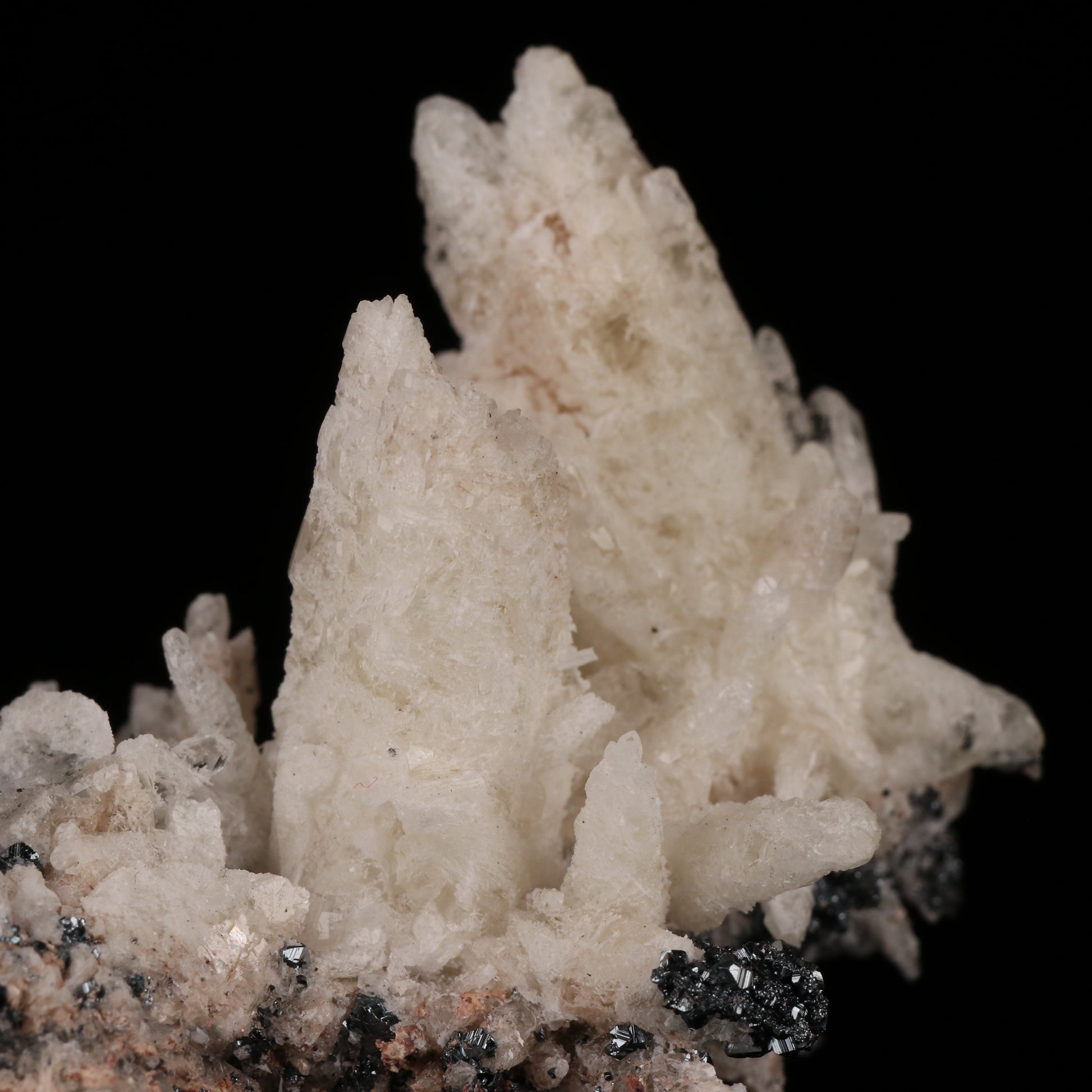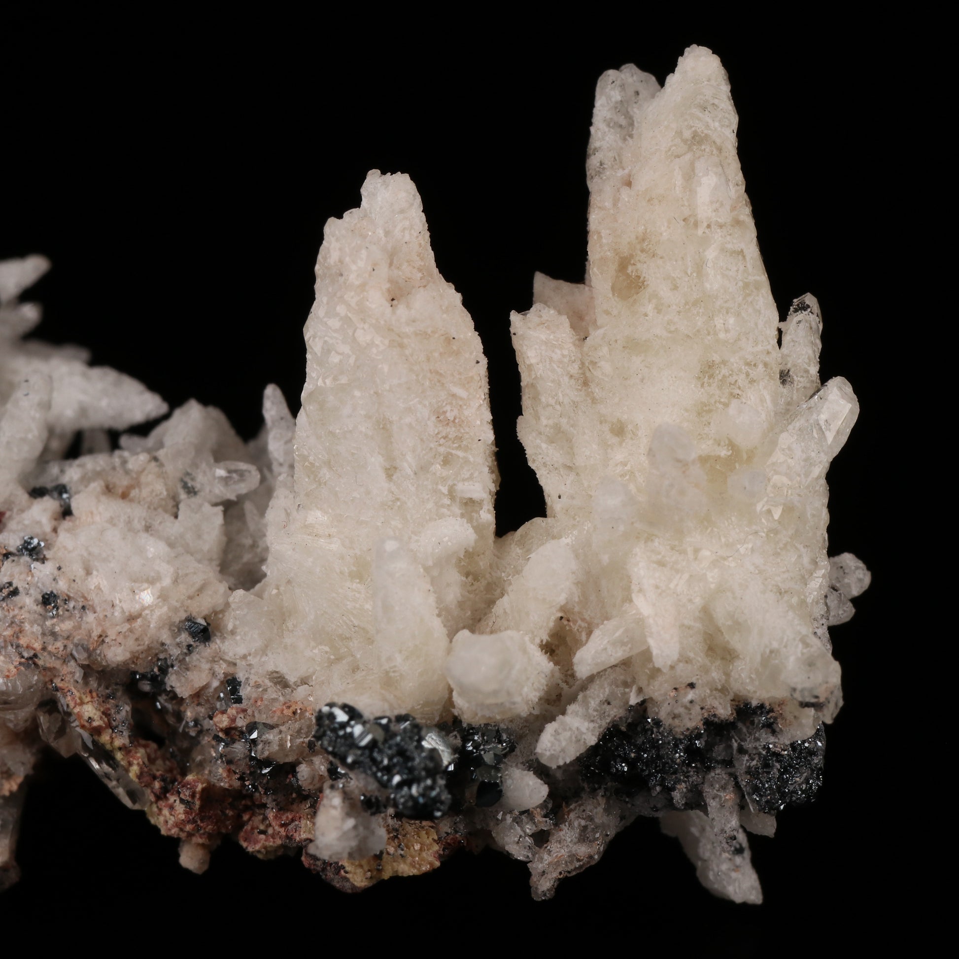 From finds in September 2001 the specimen is made up of extended growths of calcite with hematite, bementite and andradite. I am very fond of this specimen which is with extended growths of white calcite with the largest growth measuring 2.8cm. Towards the base are small lustrous hematite crystals and on the underside small mica-like bementite.