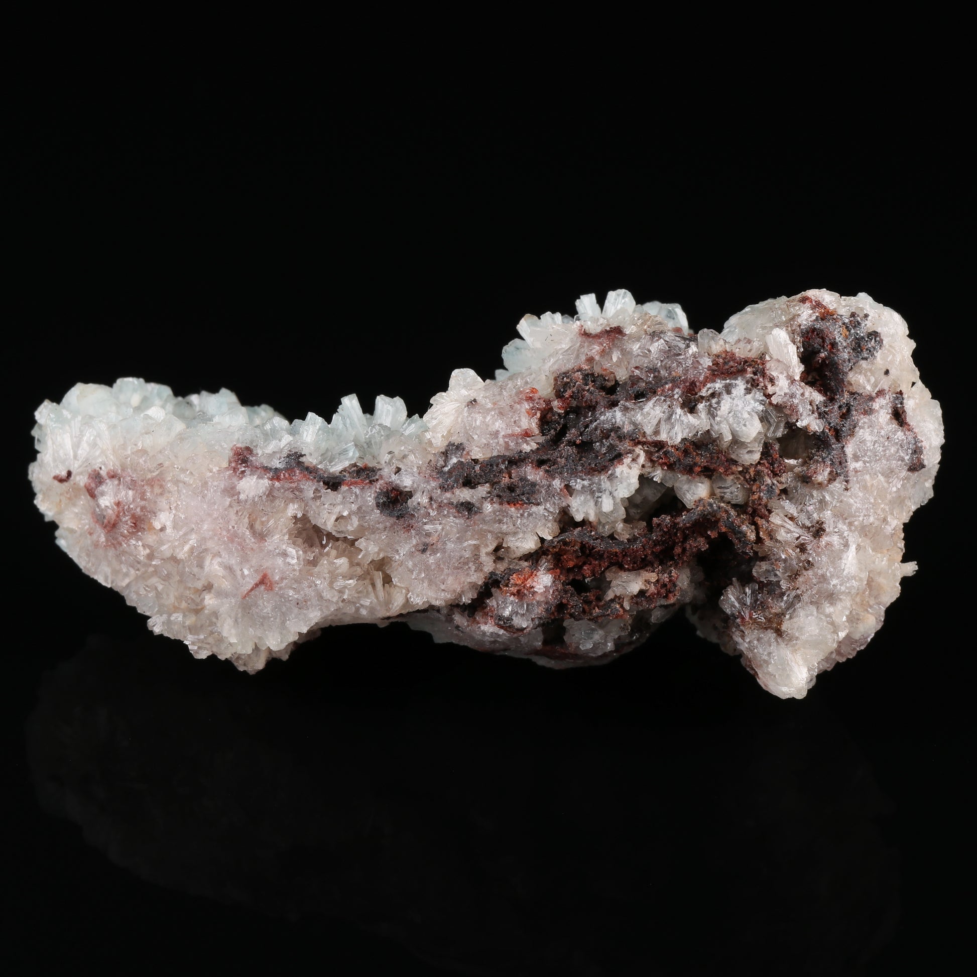 The specimen has a narrow lateral spread formation or point formation grown over with trees of hemimorphite crystals. The rounded tree formations are the result of full circle radial growth of tabular crystals of hemimorphite branches. They havee a rugged crystalline profile. Here and there their group or cluster colouration aspires to a pale blue. A very nice specimen.