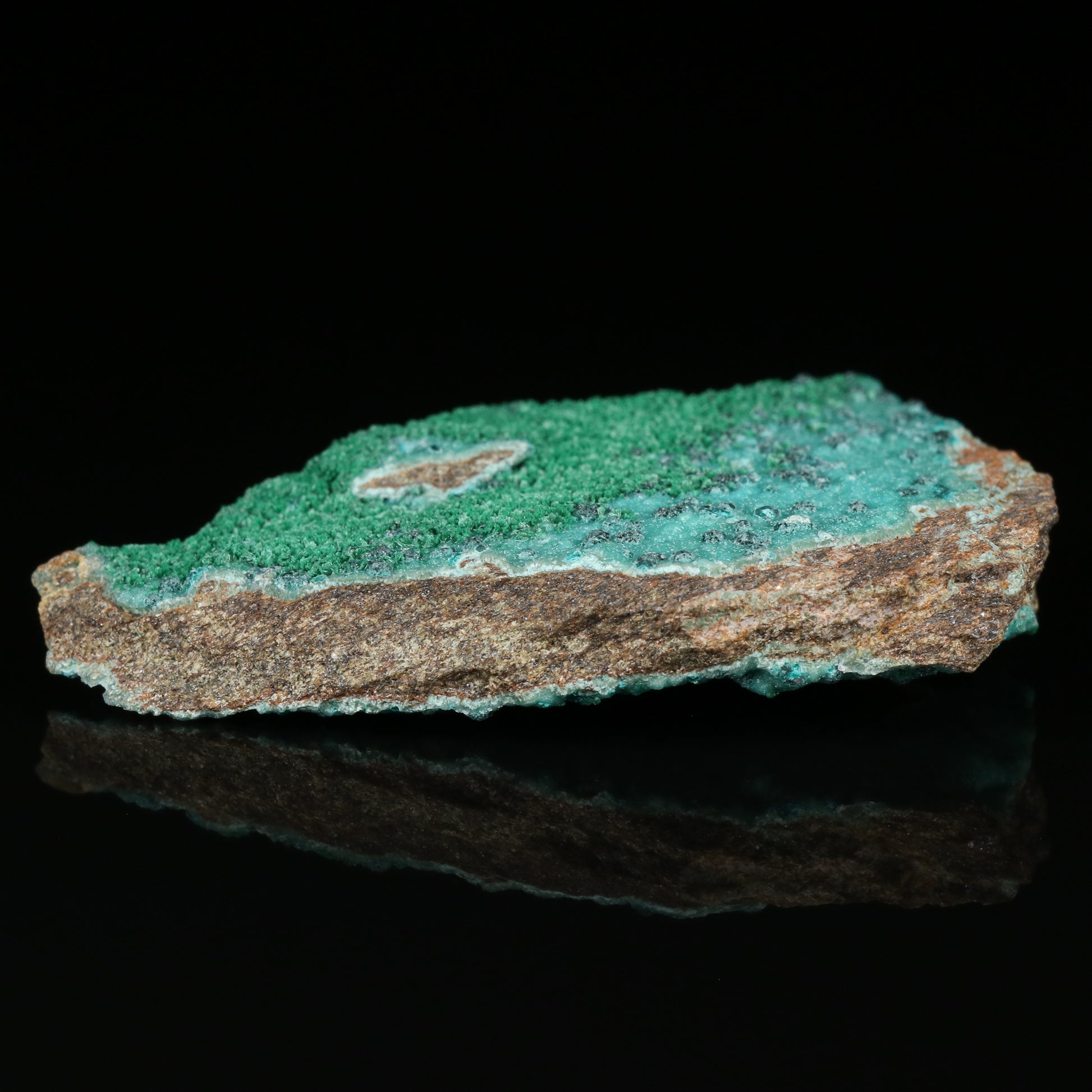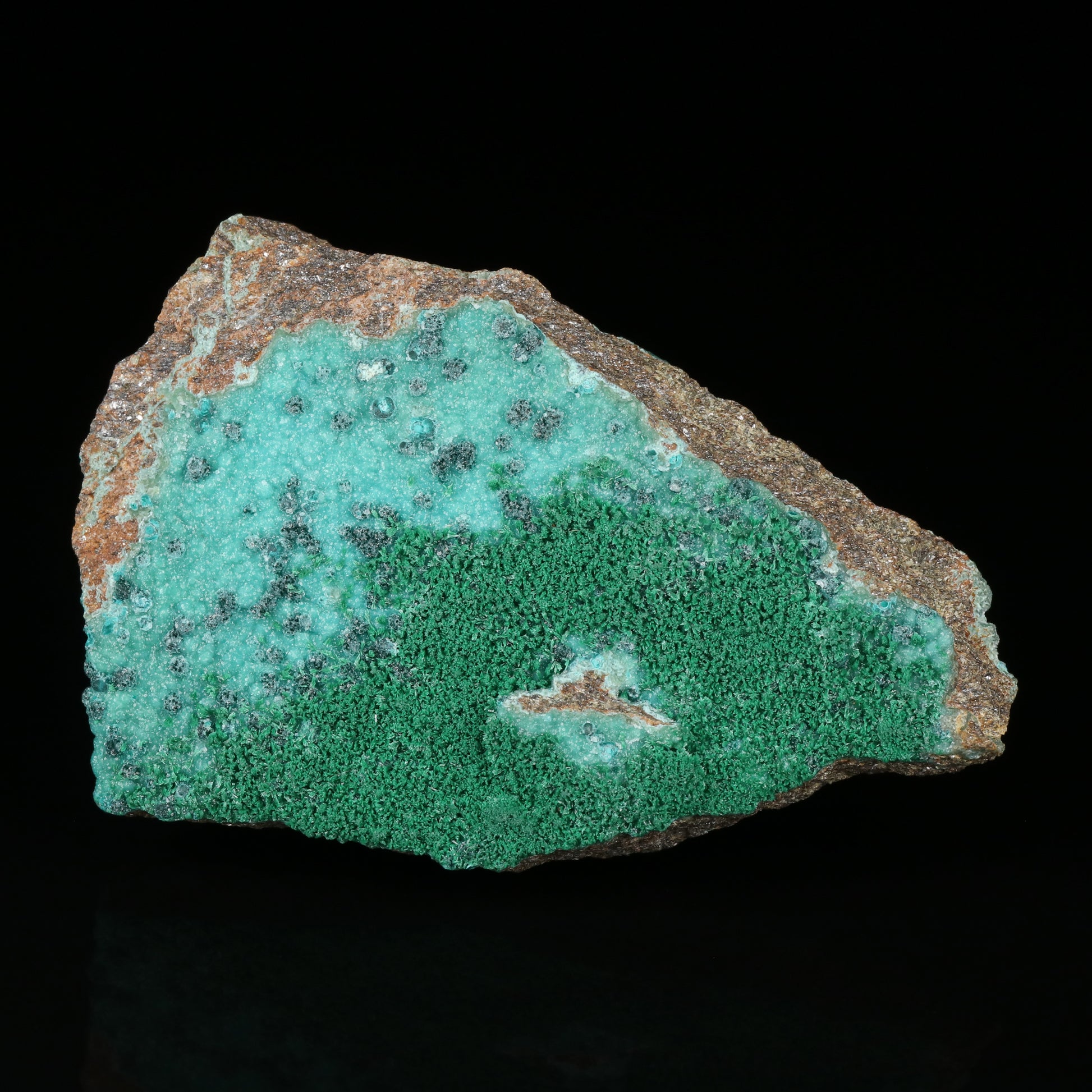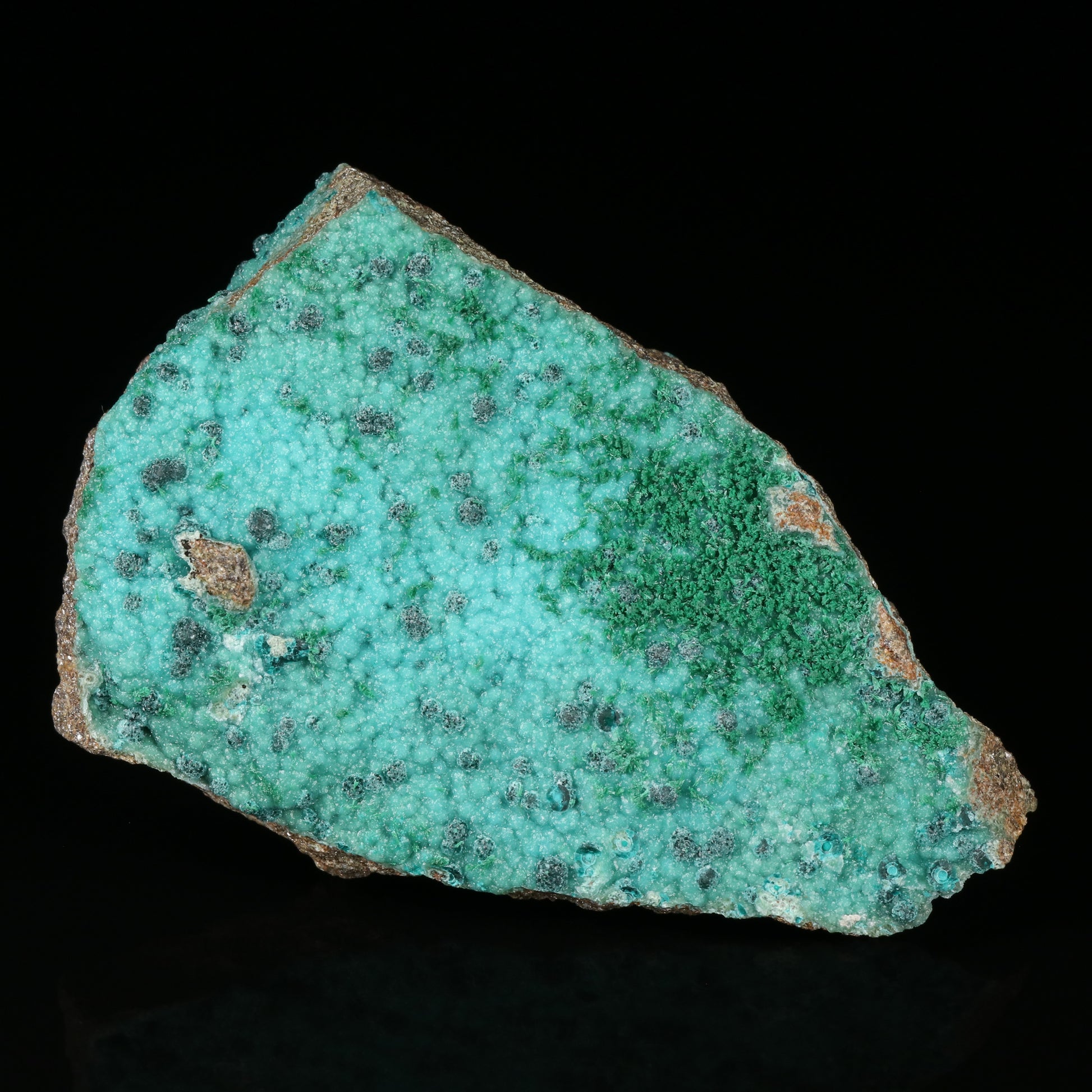 The specimen has a shallow flat shelf of matrix material which is covered on both sides with zincolibethenite in a green blue turquoise colour. In association there are small semi circular stacks of deep green herbertsmithsonite covered in pristine crystals of water clear gypsum which also covered the zincolibethenite. Lastly pseudomalachite in the forms of small needle bushes covers half of one side. The Skorpion Zinc Mine closed at the end of 2019.