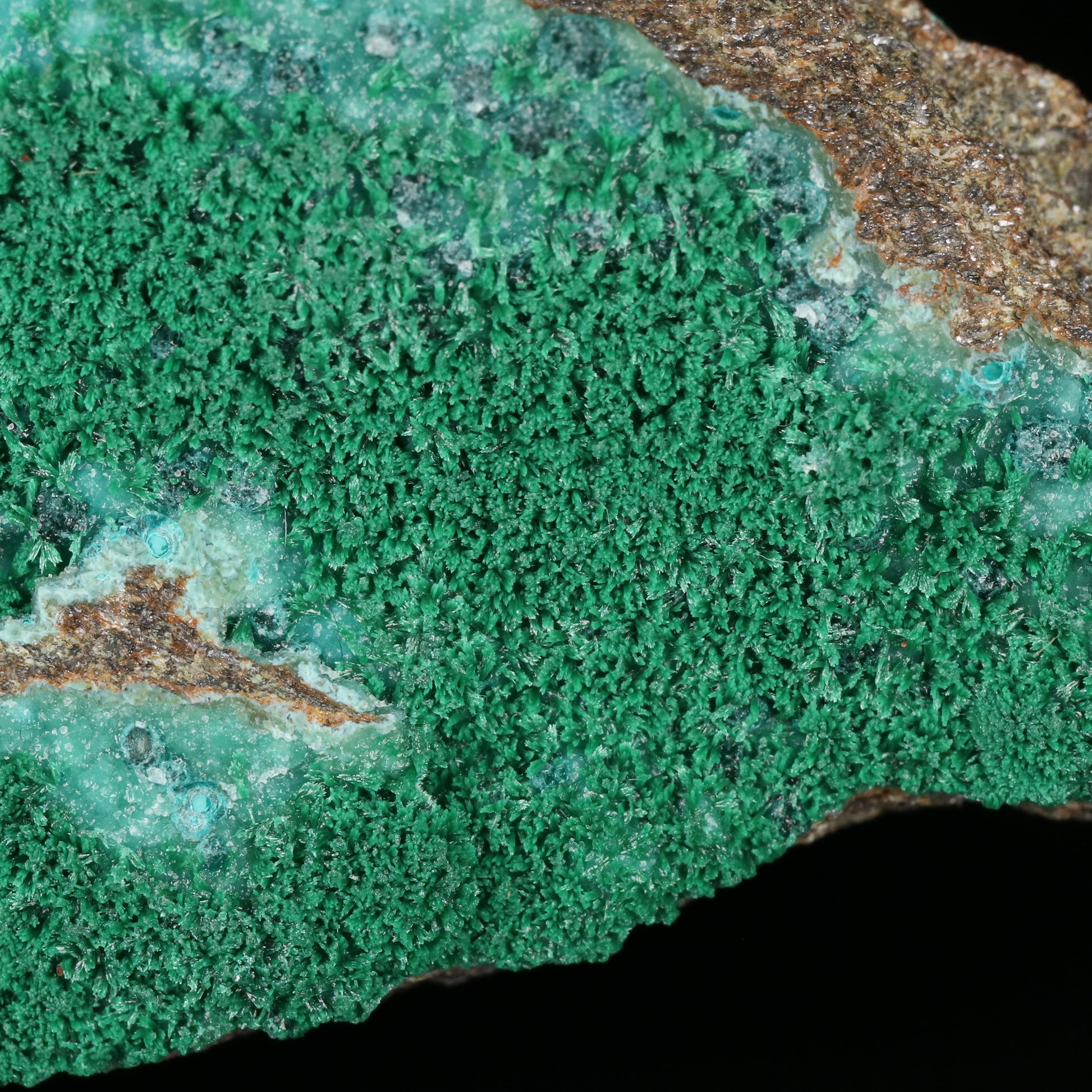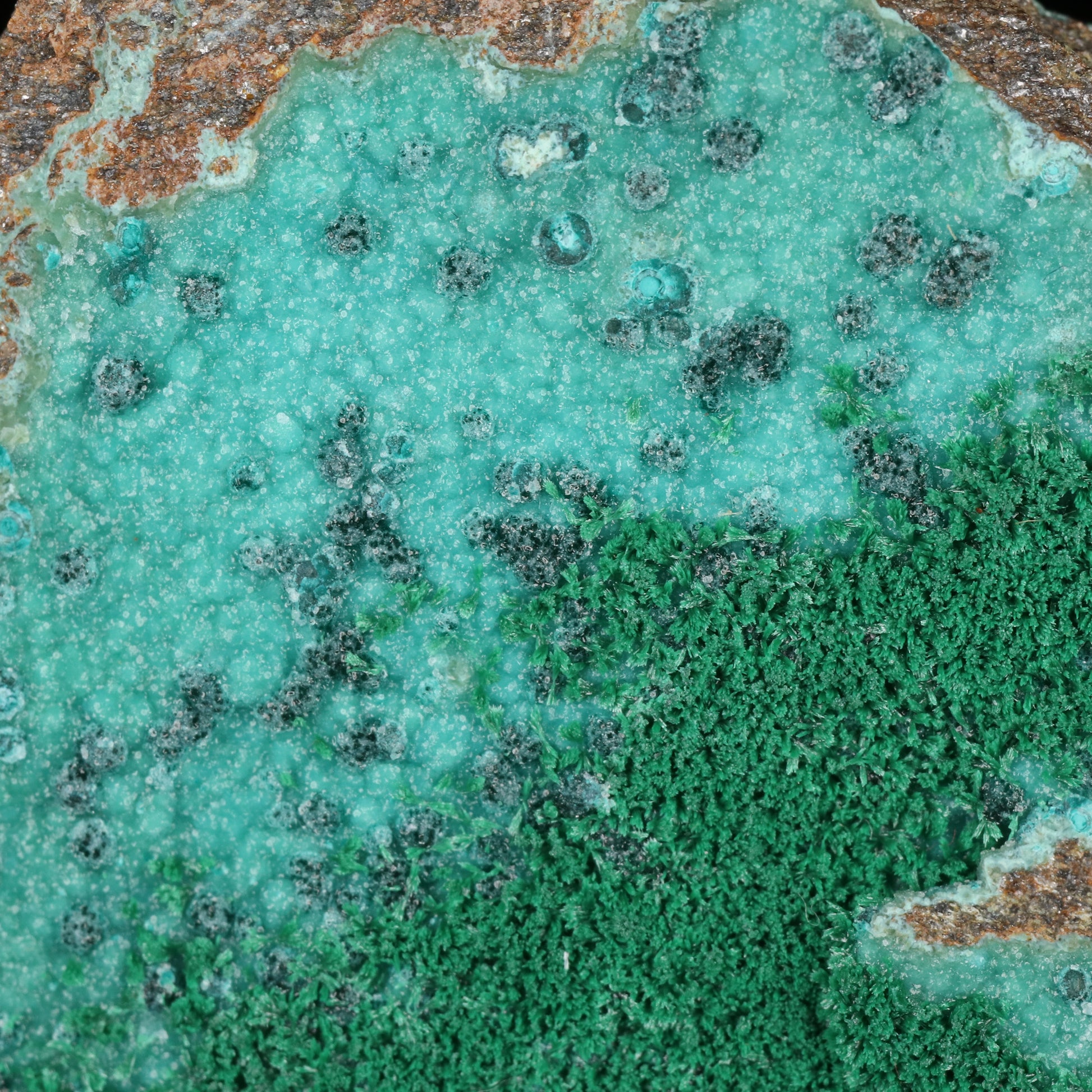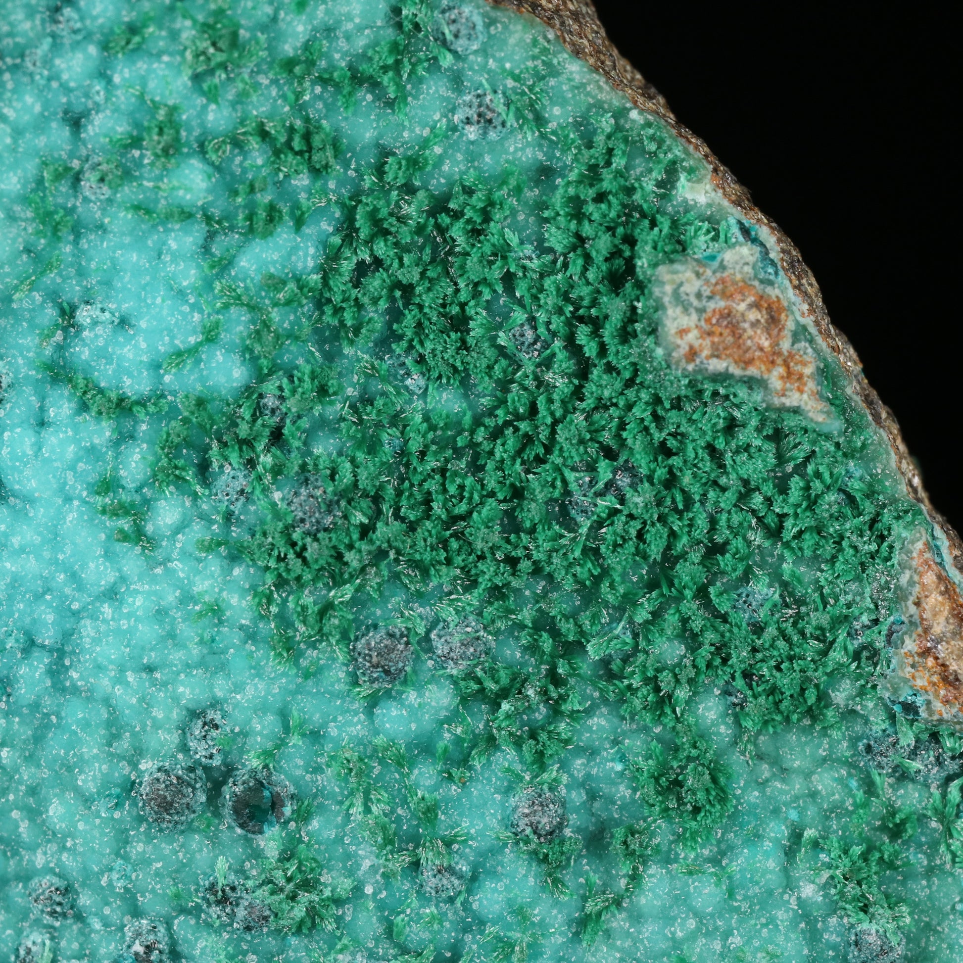 Herbertsmithsonite on Zincolibethenite with Pseudomalachite