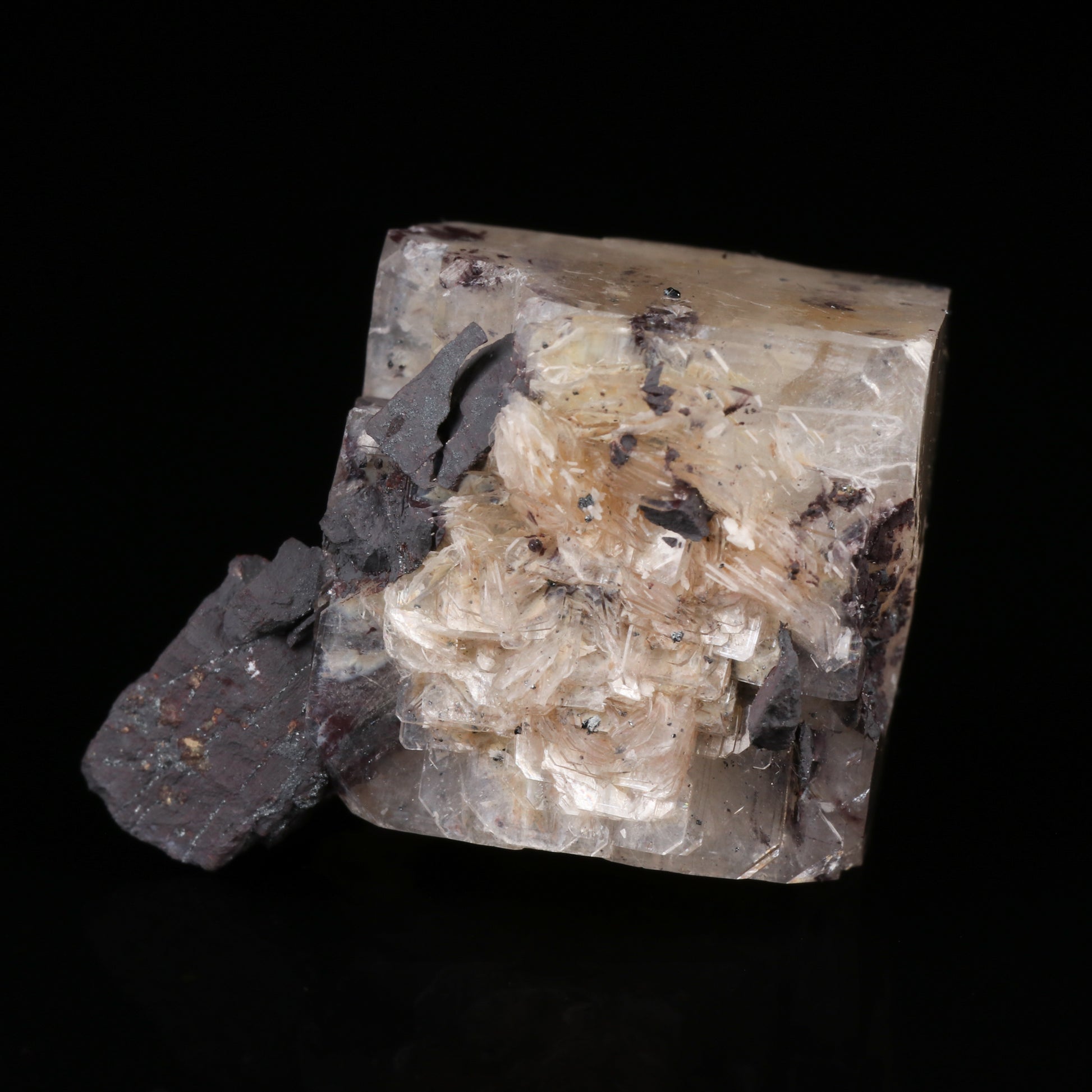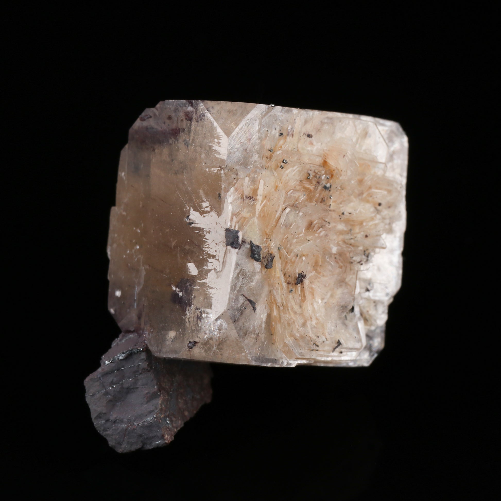 A neat tabular stubby single crystal of hydroxyapophyllite-(k) with attached bits of country rock brecchia. There are also a few snared hematite crystals. The corners of the crystal are also bevelled. From finds in 2002.