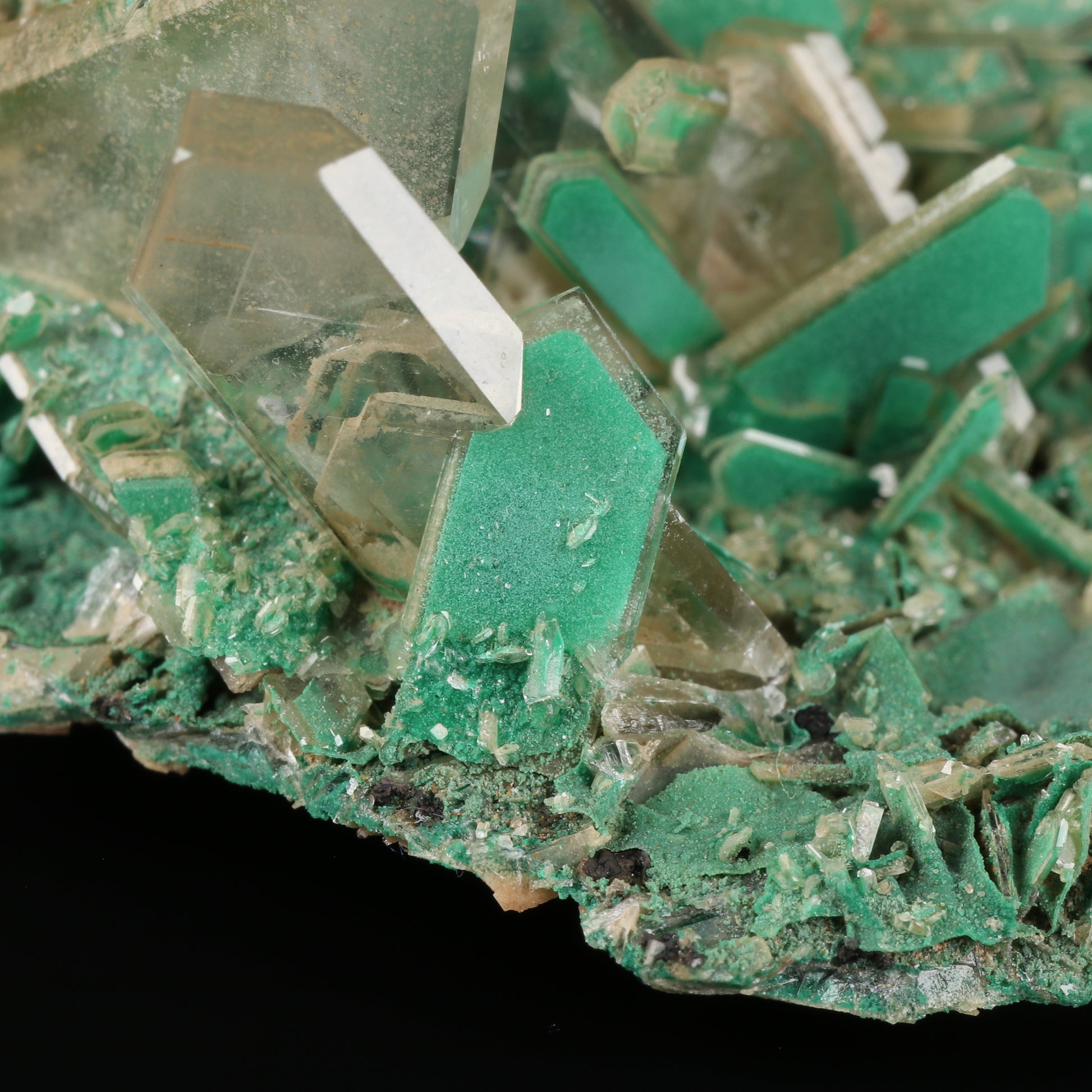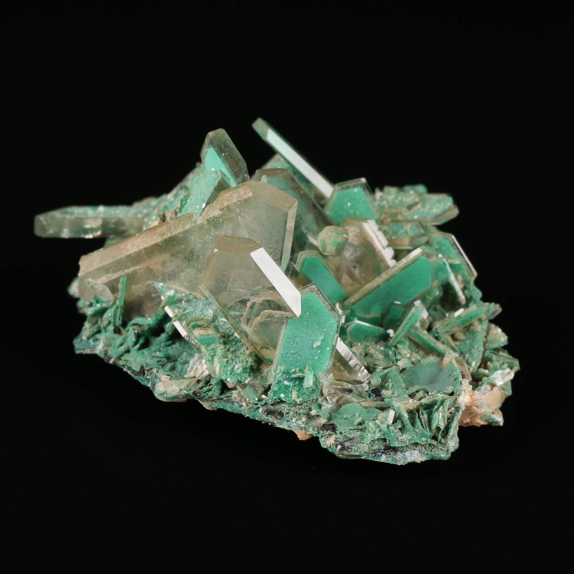 The specimen has malachite included baryte deposited onto a thin cast like matrix of malachite. The baryte has thin elongate tabular crystals standing on end in a compact outcrop. The largest crystal measures 2cm. Many of the baryte are clear and lustrous, some of them with inclusions of malachite phantoms. Overall a very cute specimen.