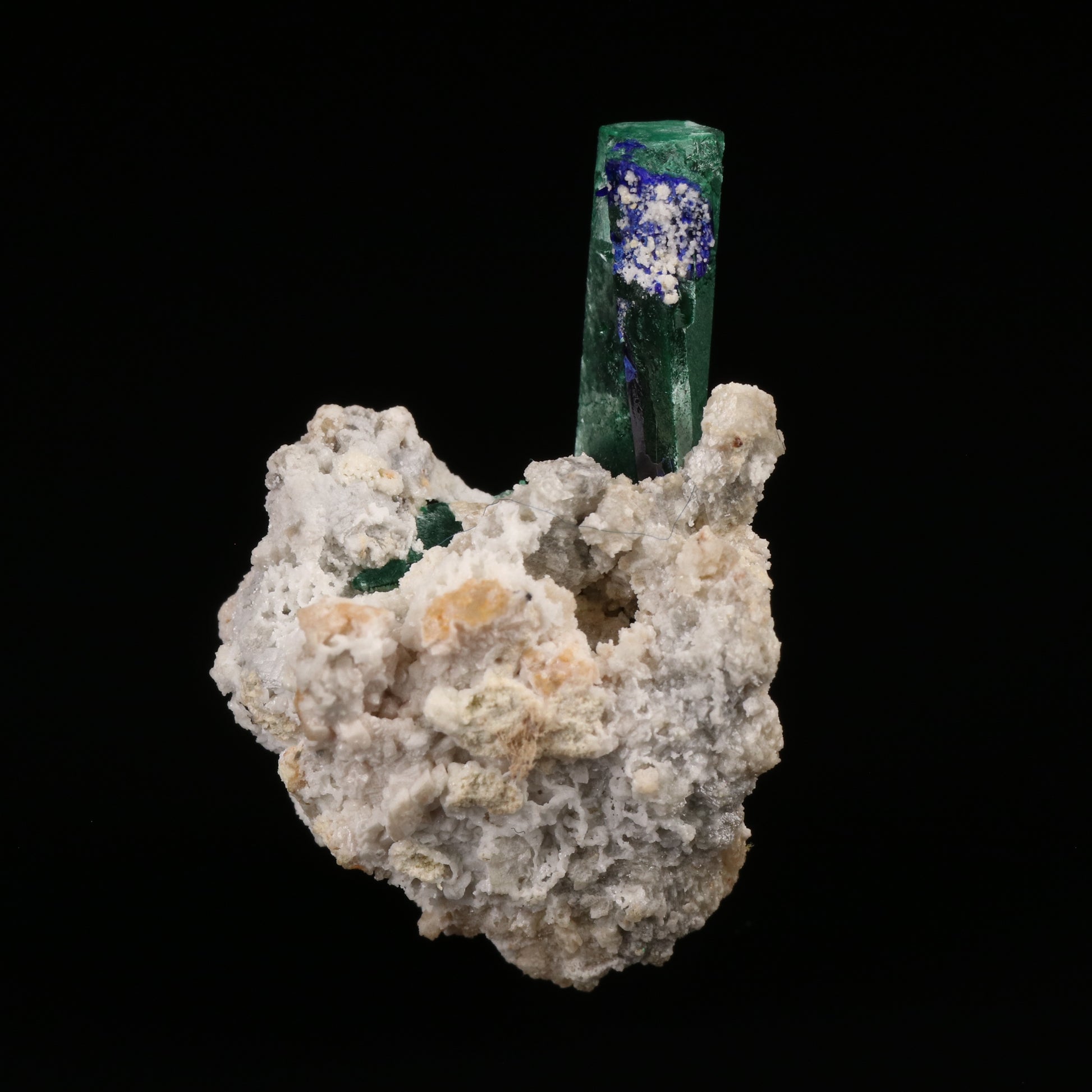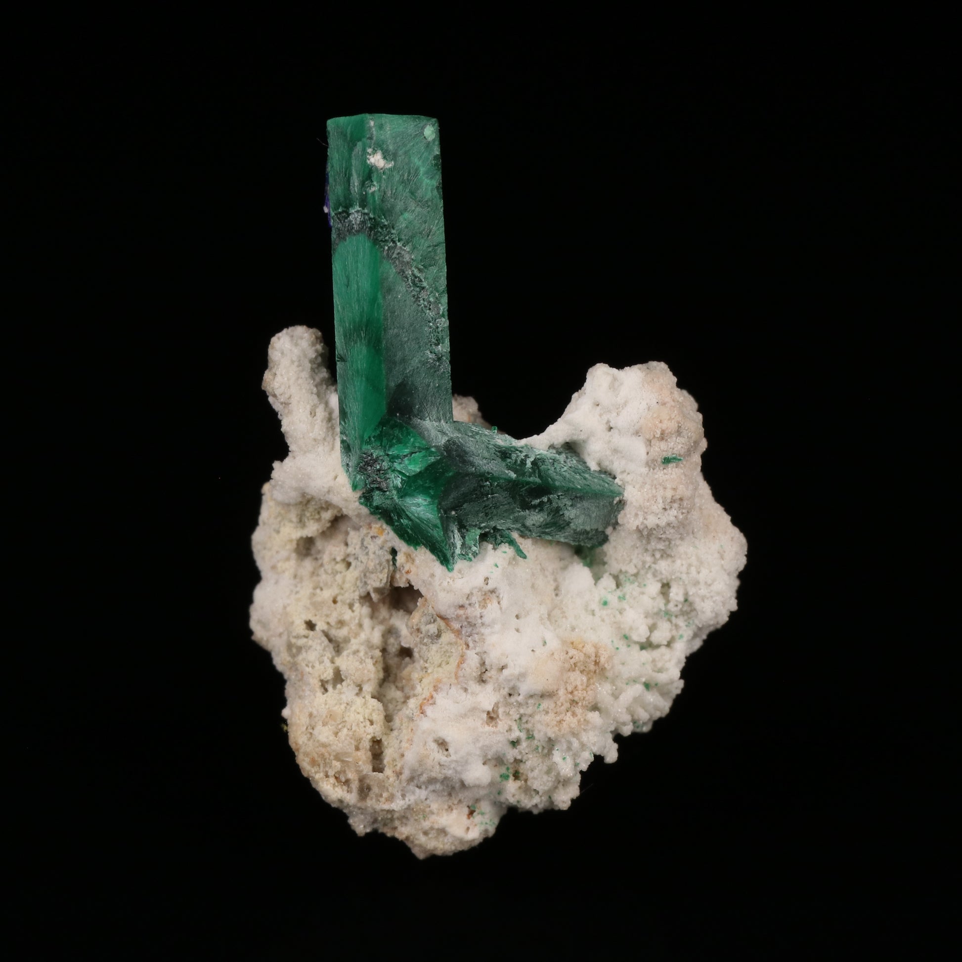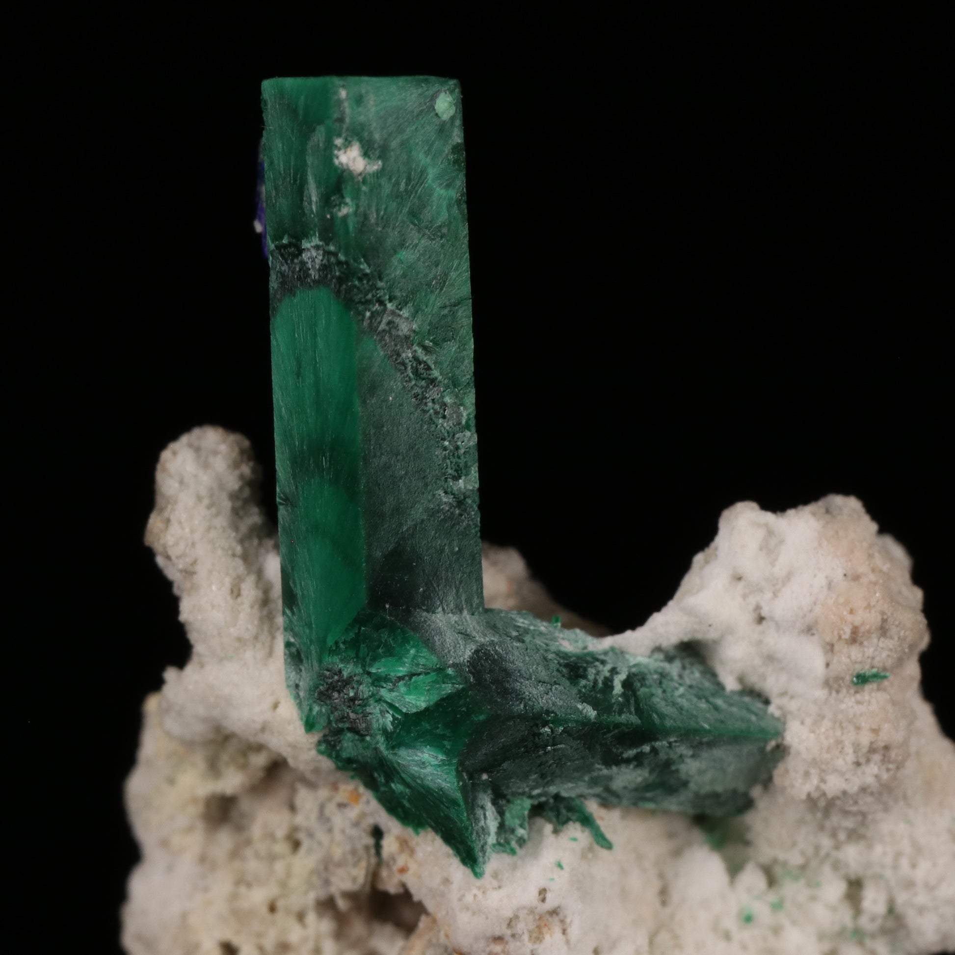 The specimen of pseudomorphed malachite psm azurite on a host white dolomite/quartz mix matrix. Originally a beautiful bladed and prismatic crystal of azurite which has been replaced by malachite, the crystal measures 1.3cm coming off the matrix.