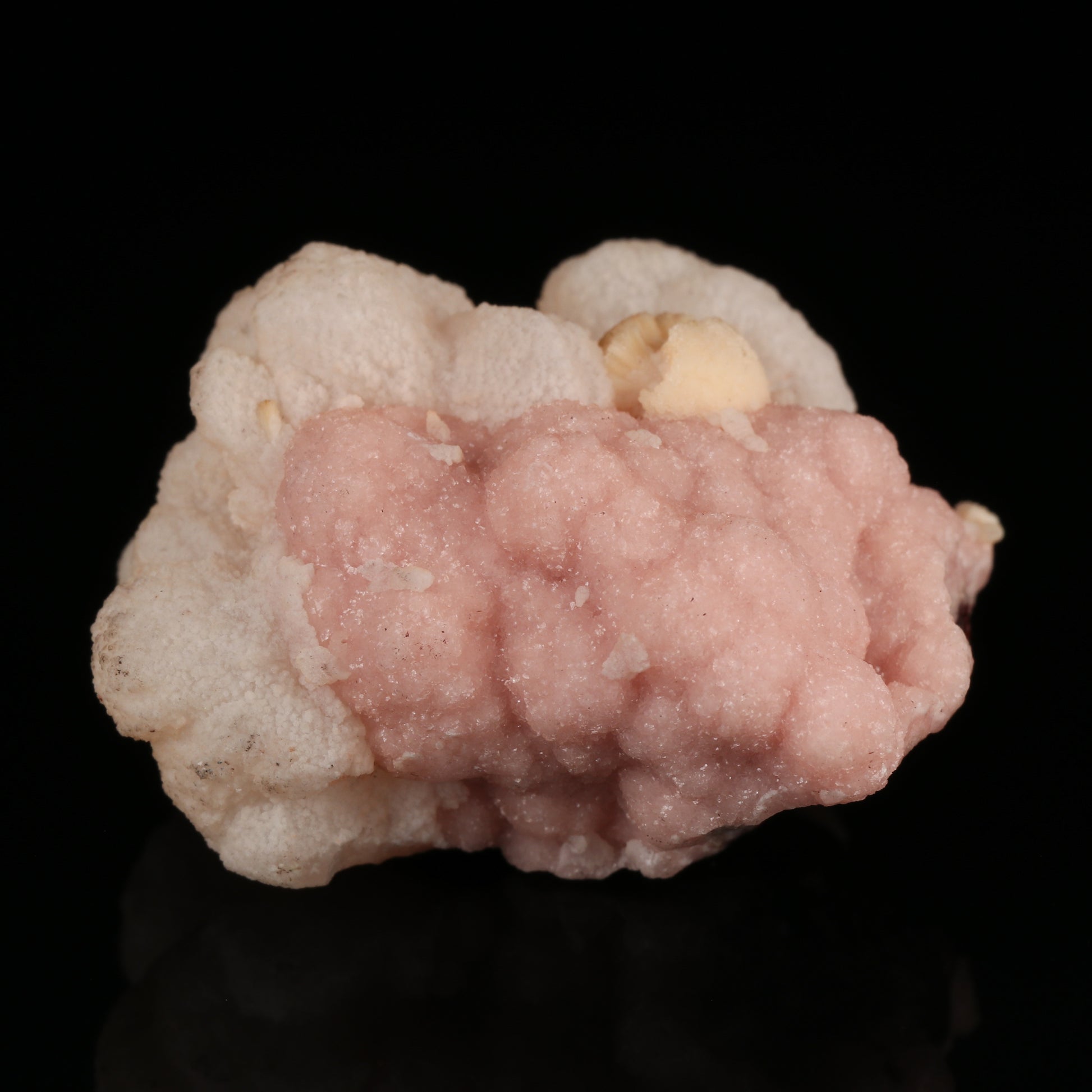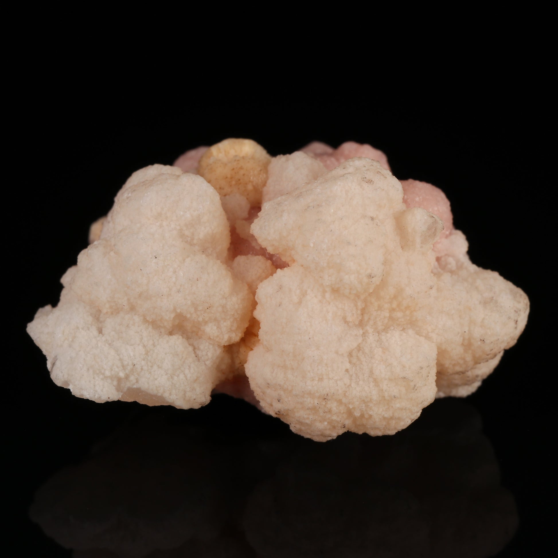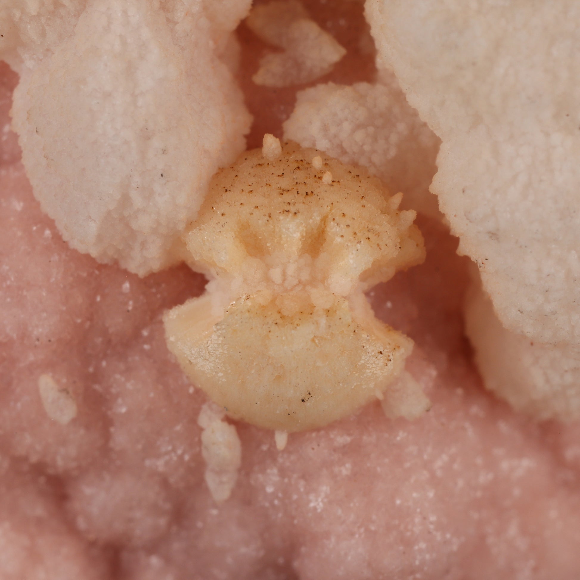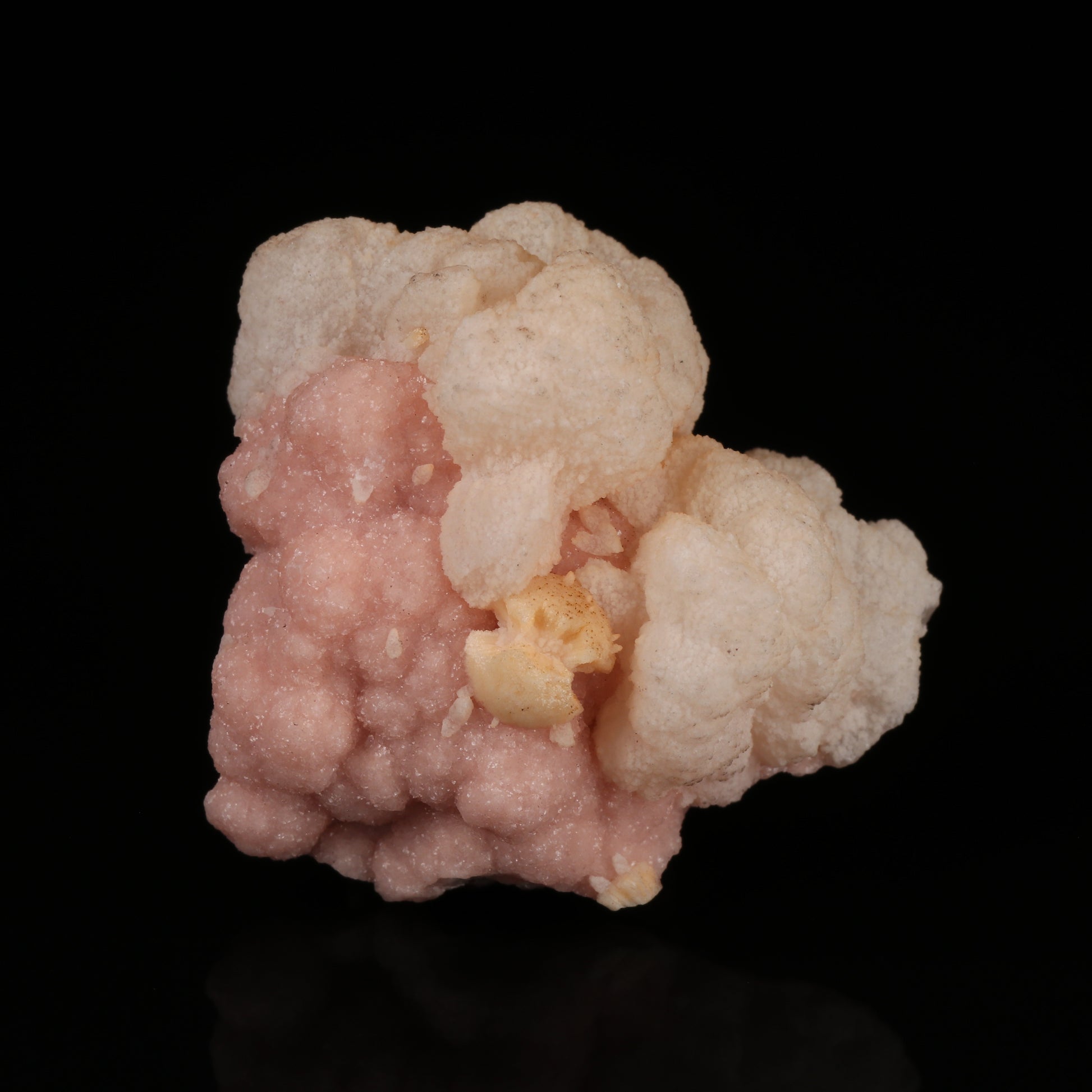 An attractive specimen here which is made up of a deposit of manganoan calcite on rhodochrosite. The rhodochrosite are tiny rhombic crystals which have intergrown with one another to form botryoids. The rhodochrosite is a light peach colour. Onto the rhodochrosite crystals of off white coloured manganoan calcite have been deposited sporadically. The colour contrast between the two mineral species is very nice. The manganoan calcite fluoresces under long wave UV light.