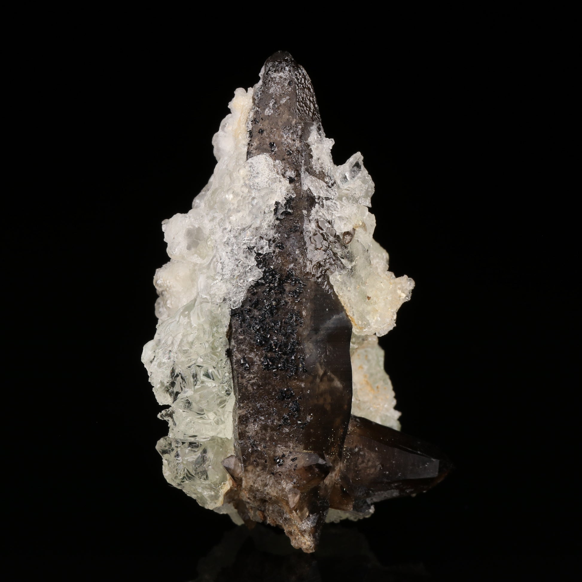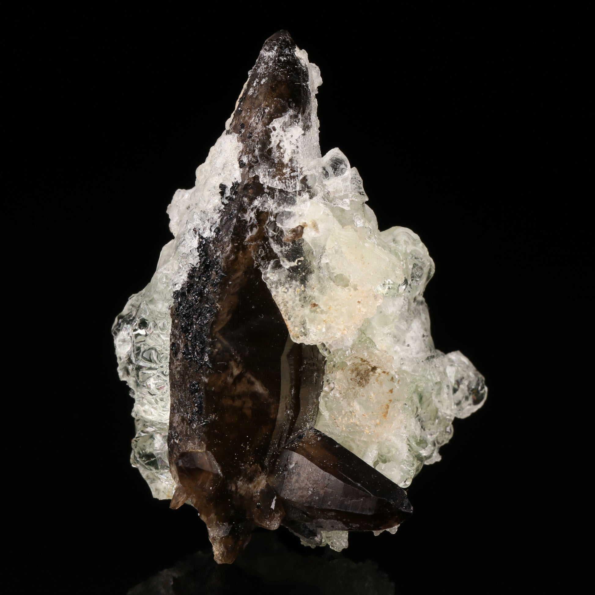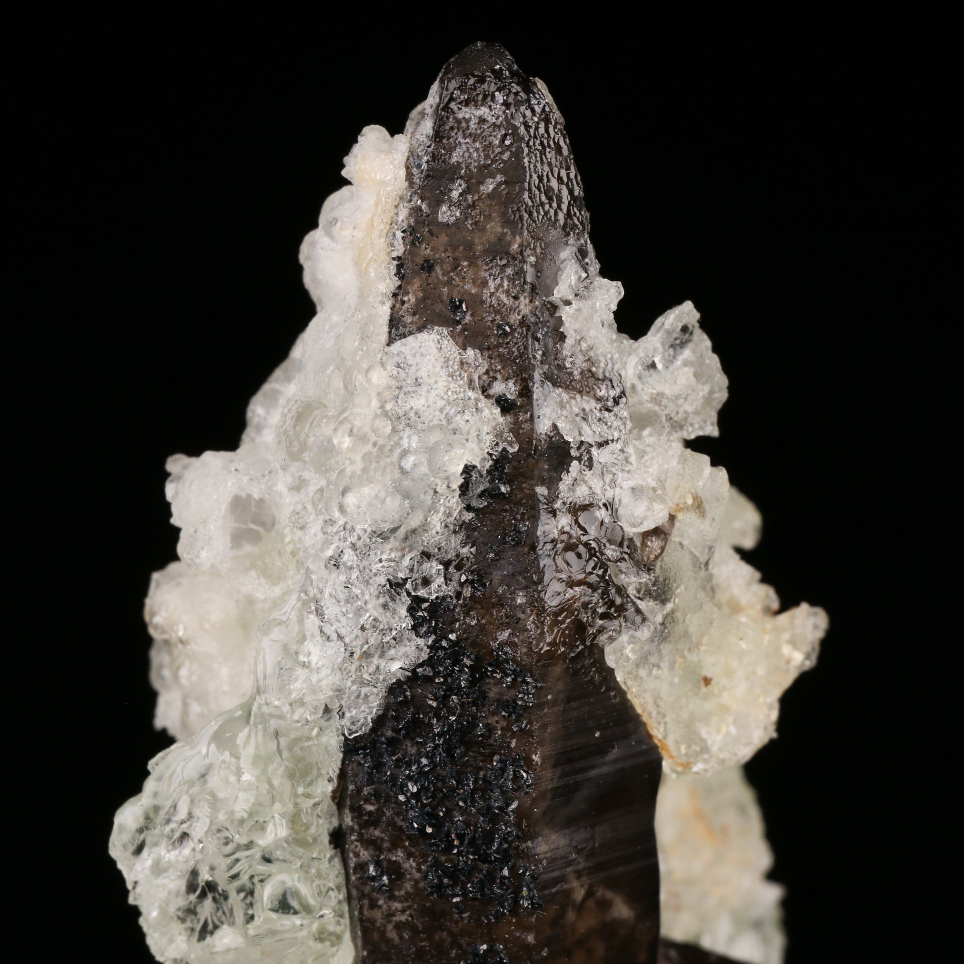 The specimen has opal-an on a smoky quartz cluster with small cassiterite crystals attached. The opal-an has a bubble-like formation and is spectacularly daytime fluorescent. The opal-an is very pure and gemmy. The small cassiterite crystals on the quartz is an unusual association.