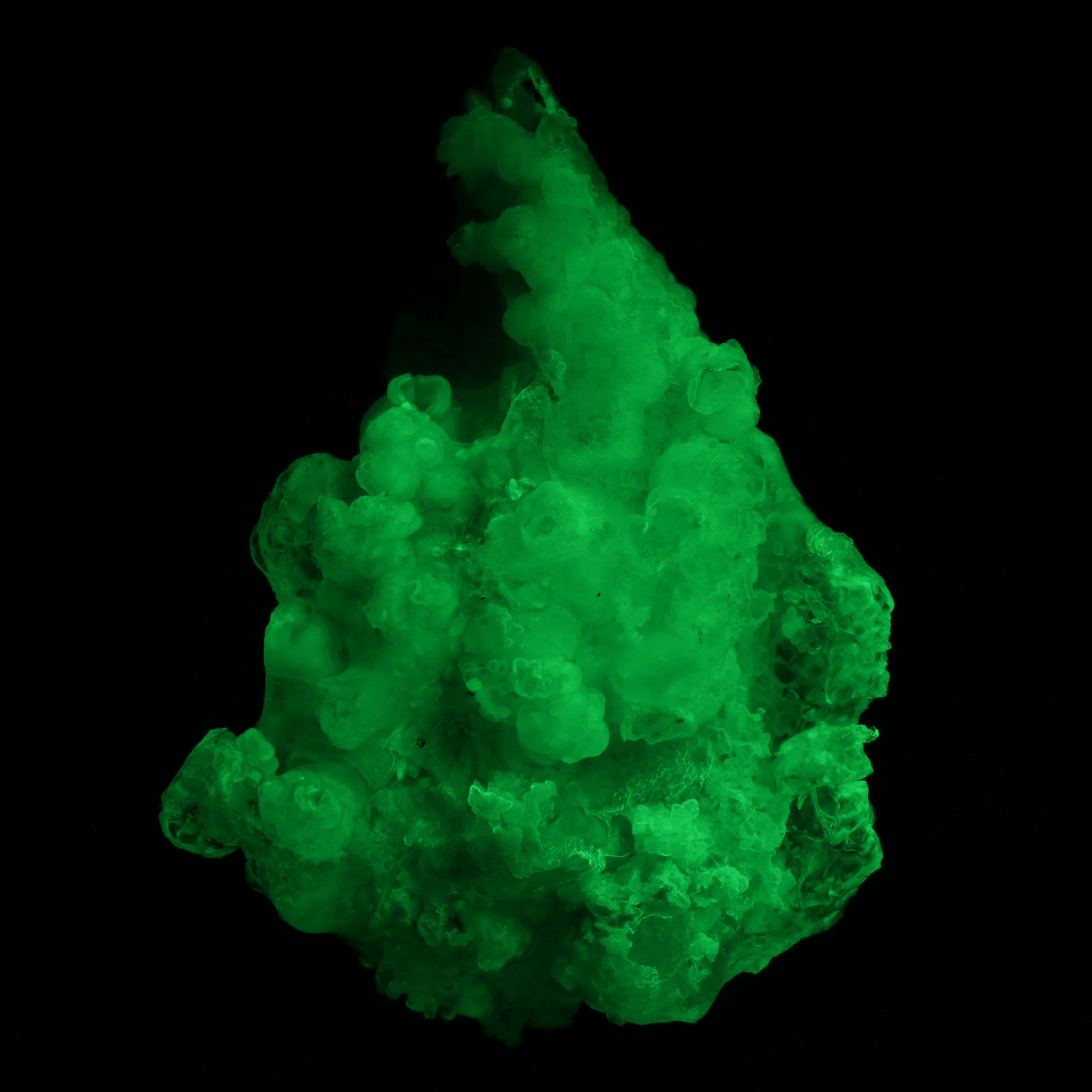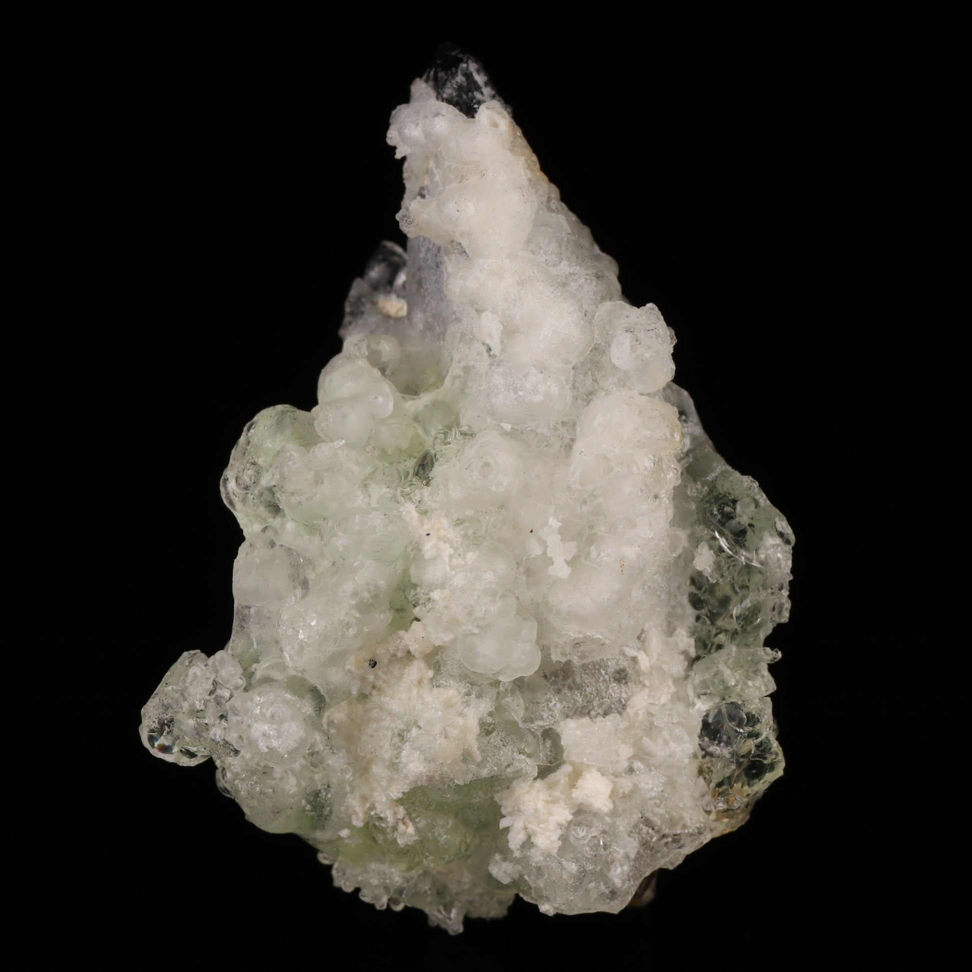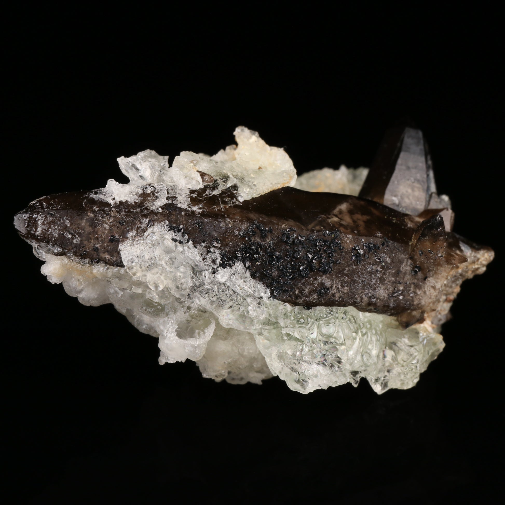 The specimen has opal-an on a smoky quartz cluster with small cassiterite crystals attached. The opal-an has a bubble-like formation and is spectacularly daytime fluorescent. The opal-an is very pure and gemmy. The small cassiterite crystals on the quartz is an unusual association.