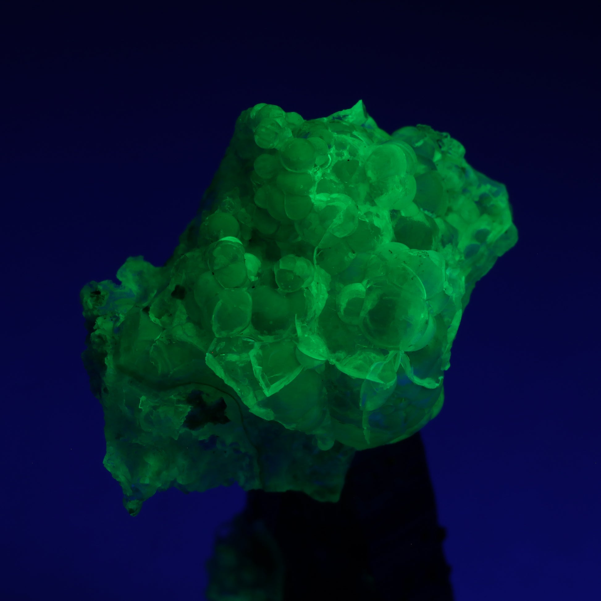 The specimen has opal-an on a smoky quartz cluster with small cassiterite crystals attached. The opal-an has a bubble-like formation and is spectacularly daytime fluorescent. The opal-an is very pure and gemmy. The small cassiterite crystals on the quartz is an unusual association.