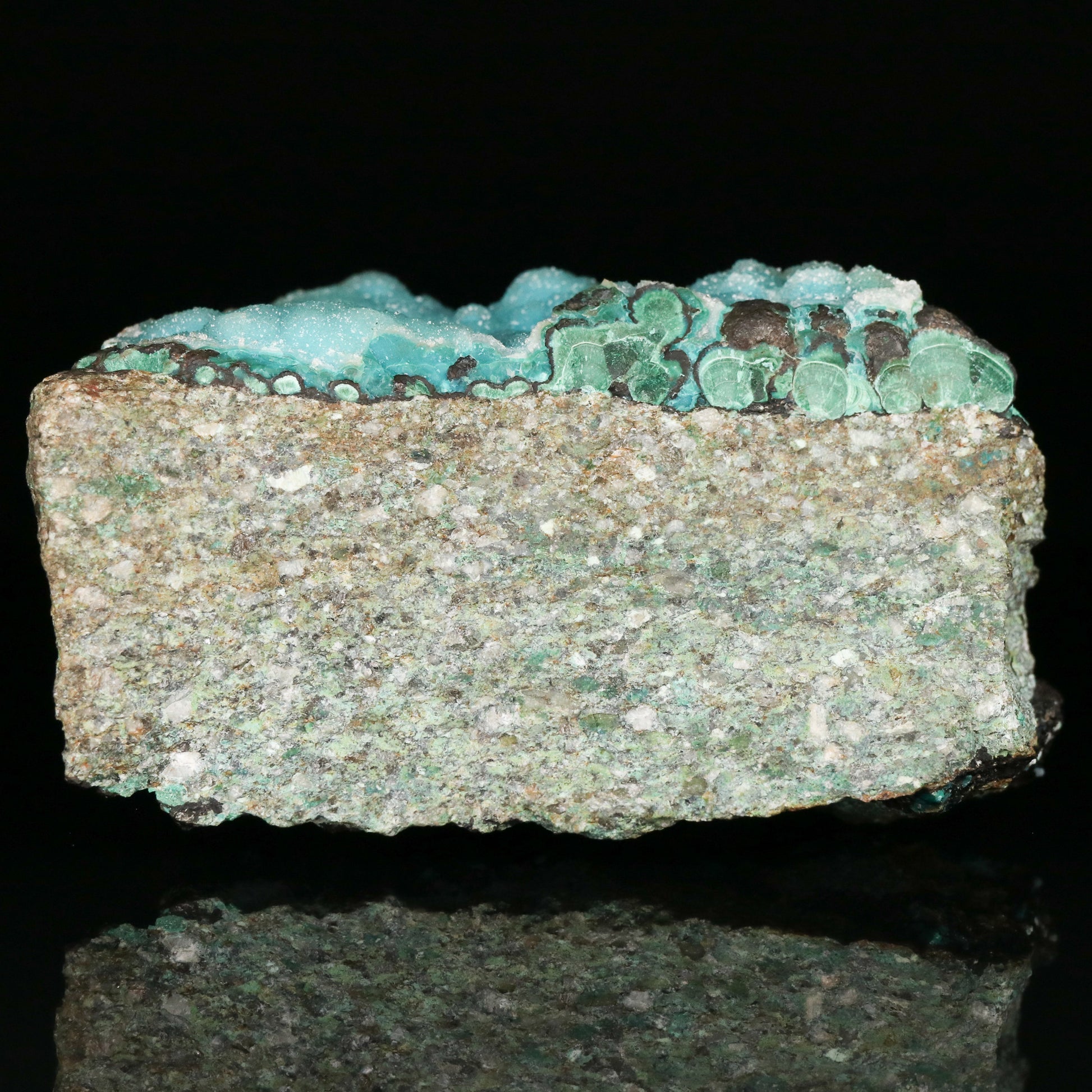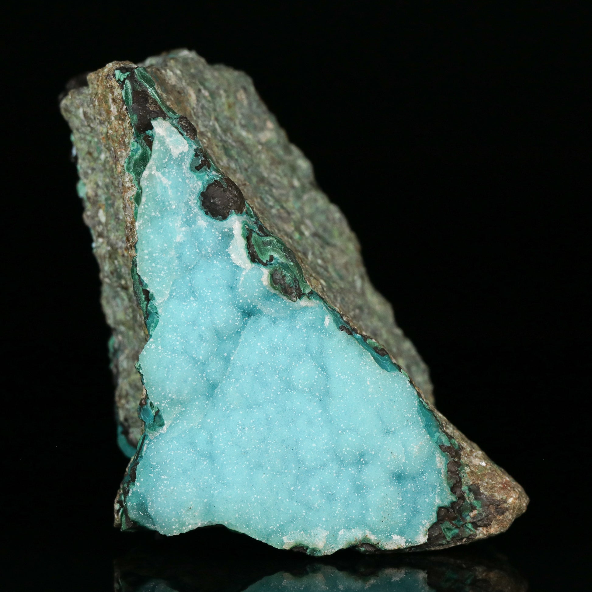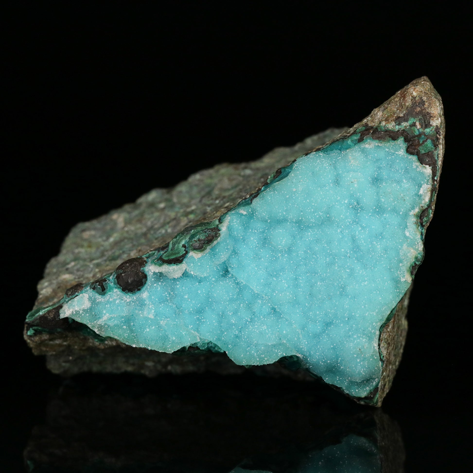 From finds in 2018, the year before the Skorpion Zinc Mine closed, this specimen is made up of a deposit of Quartz drusy over Chrysocolla on Malachite on a big sized wedge shaped matrix. The colour of the turquoise chrysocolla comes through the fine grained Quartz drusy. The chrysocolla has also formed botryoids with some slight mounds too. The matrix is chunky but it also provides for some nice display angles. On the sides one can see hetaerolite and malachite botryoids too.