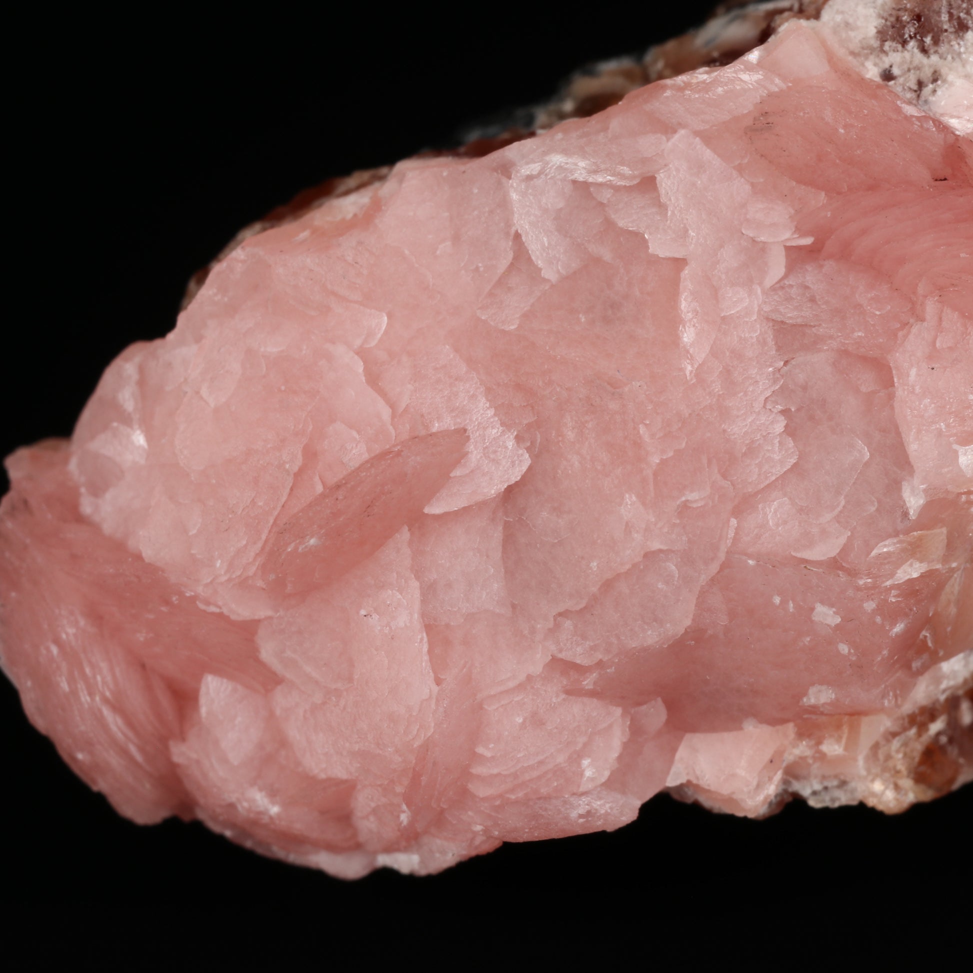 An old specimen here from the late 70s early 80's which is made up of two generation growth of rhodochrosite on a host matrix. The two generations can be seen on the sides where it came off of a larger piece. The colour at the surface is a lovely milky pink with crystals in a thin blade-like form. Below the surface rhodochrosite there is a layer of cherry wine red rhodochrosite.