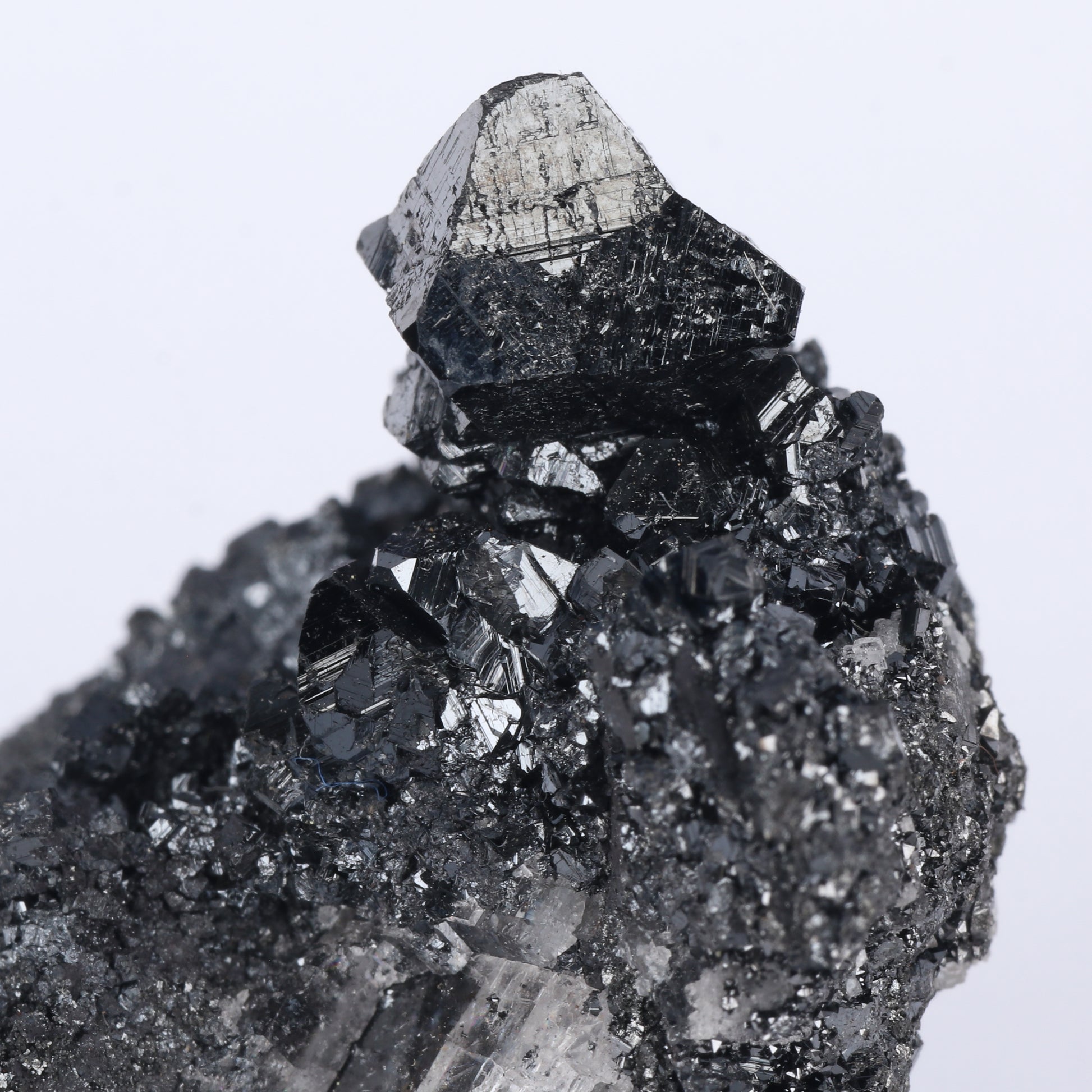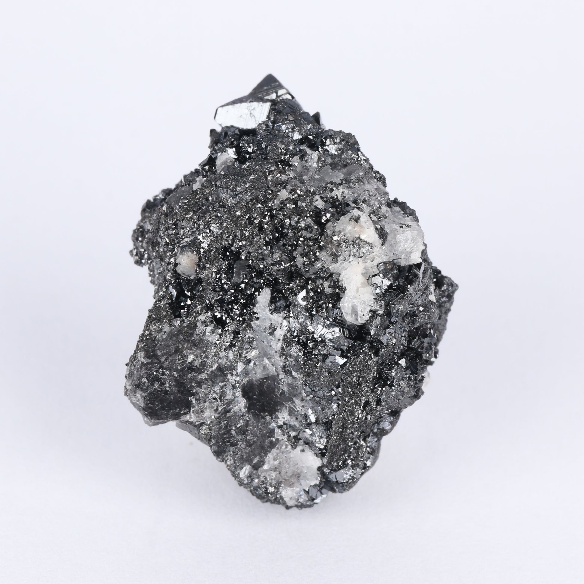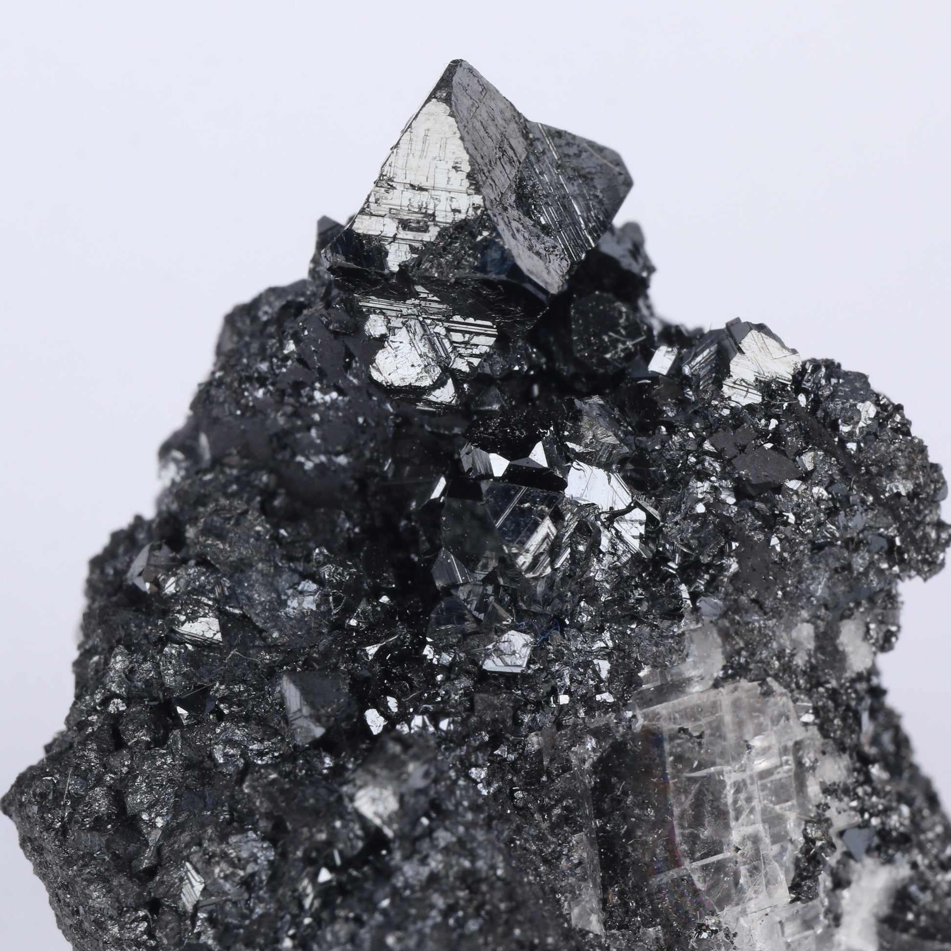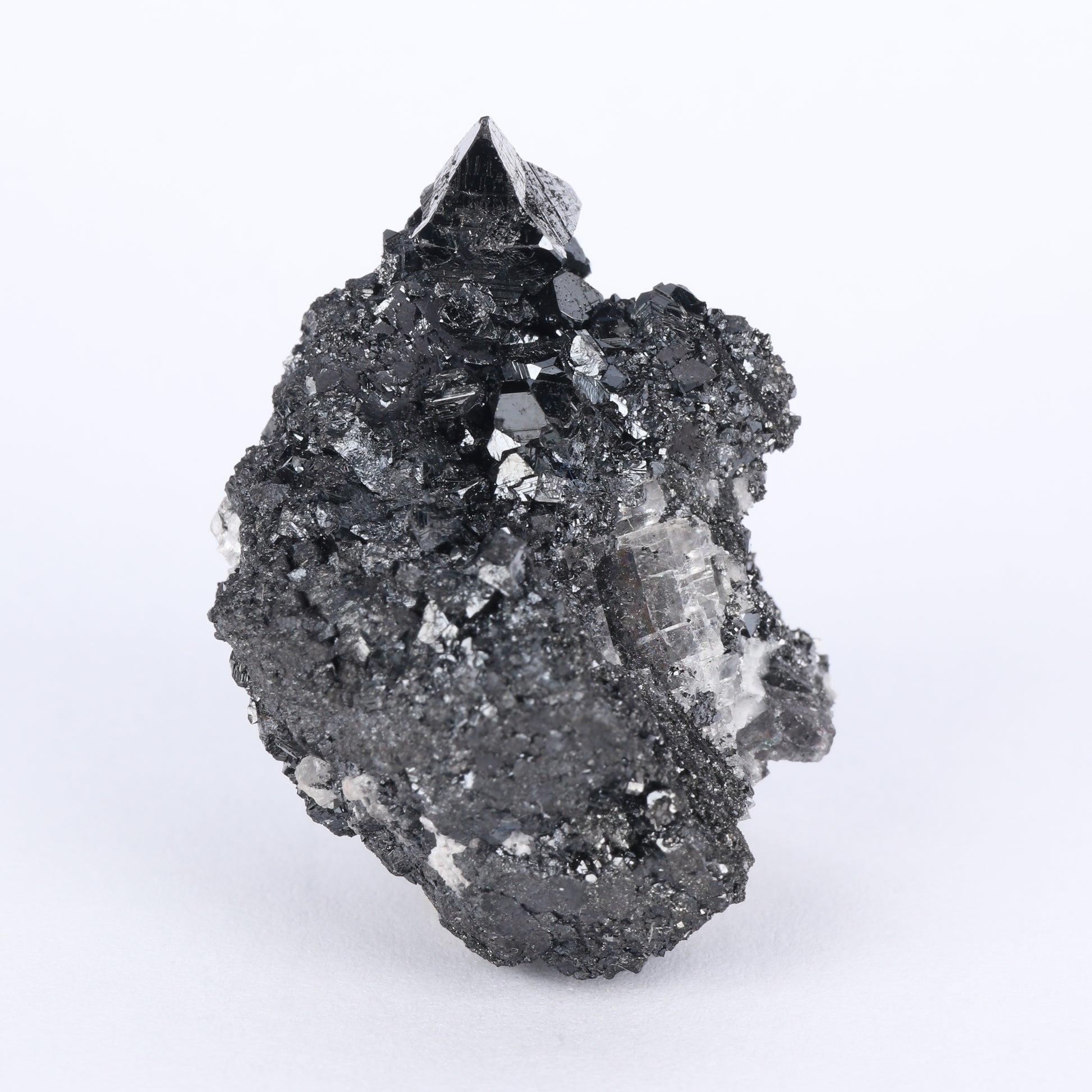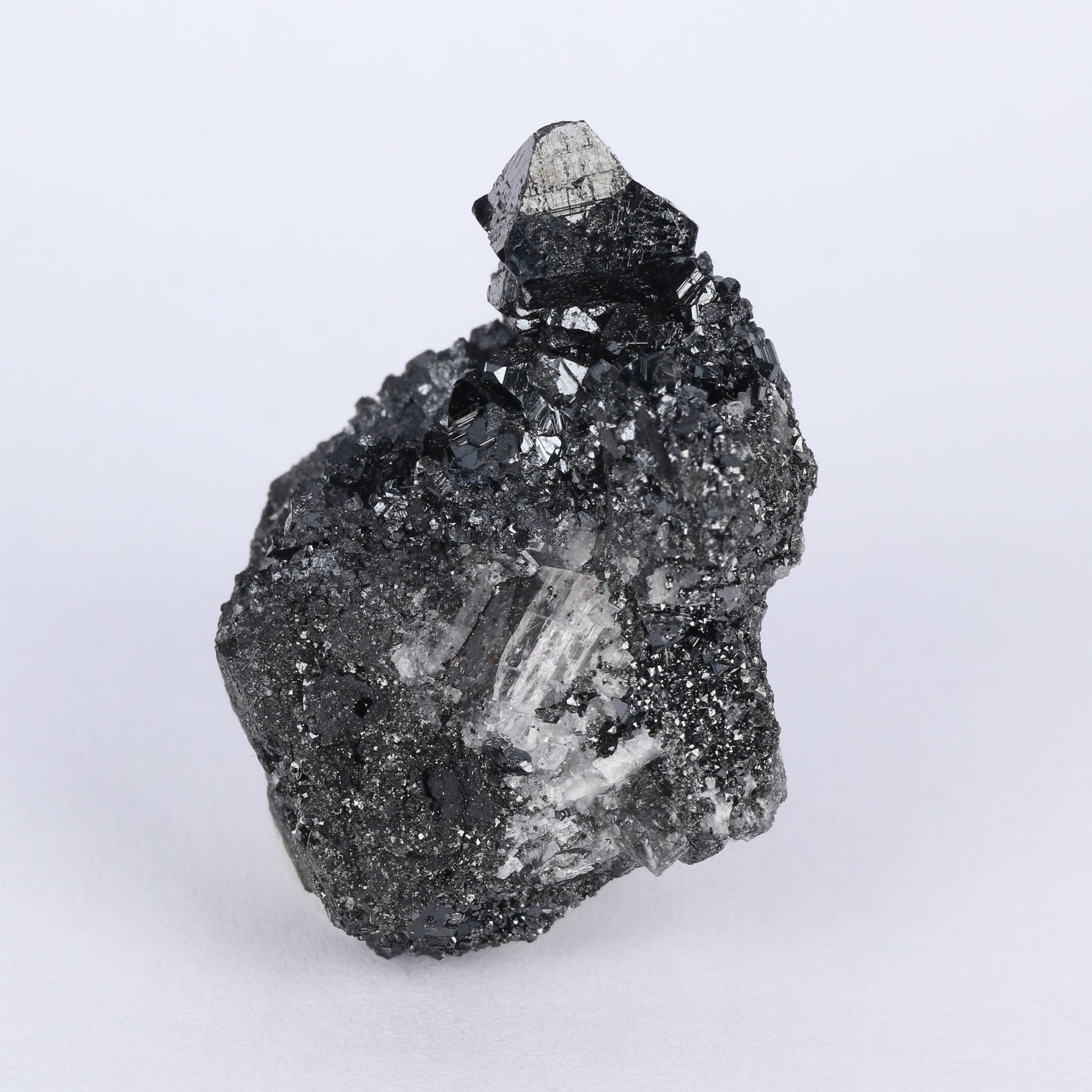 From early finds at the Wessels Mine, this specimen has a lovely twinned Hausmannite crystal which measures 8mm across with good lustre and deposited onto the matrix with many smaller Hausmannite and remnants of Calcite. Very cute miniature sized specimen.